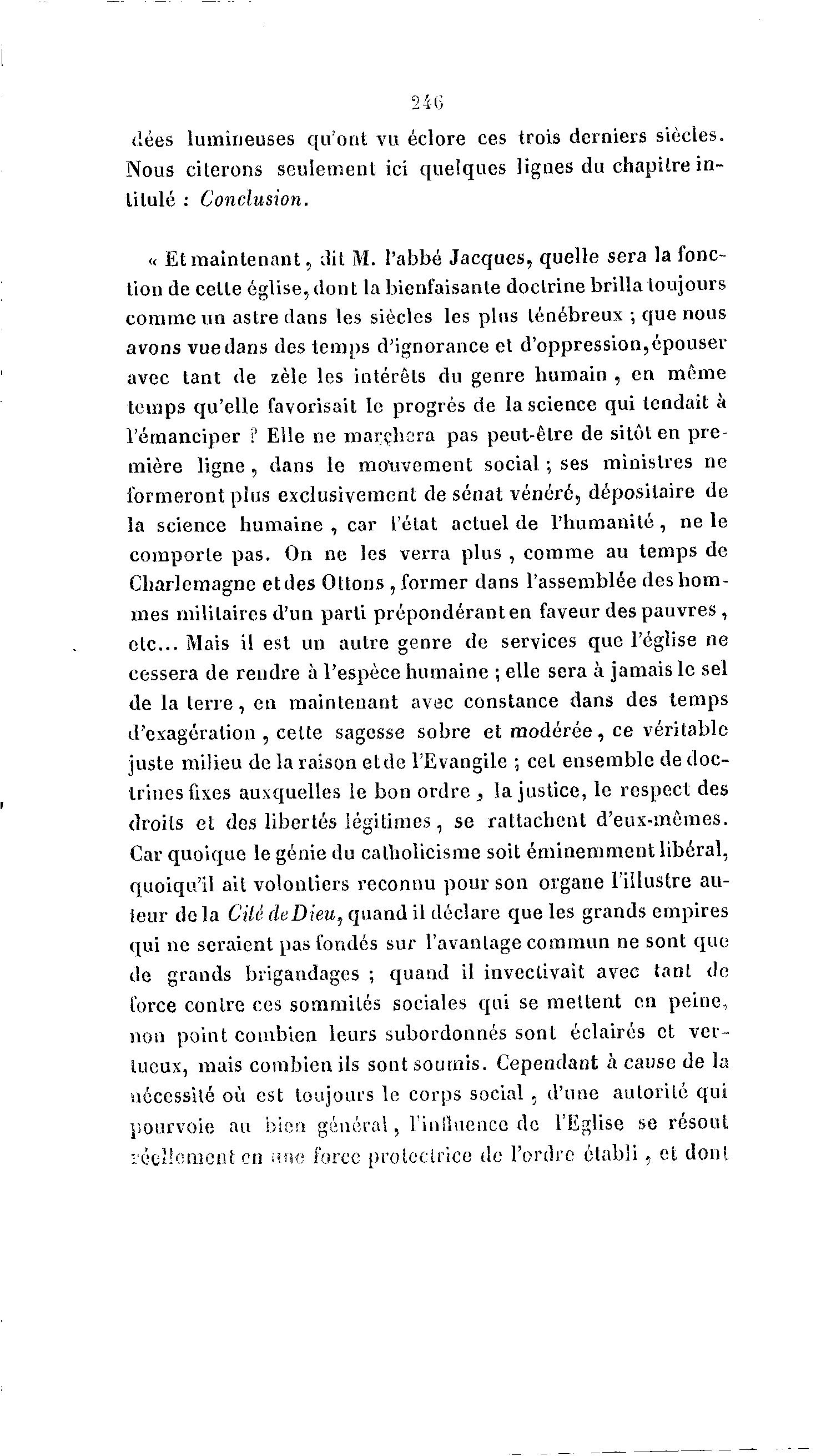 246 dées lumineuses qu'ont vu éclore ces trois derniers siècles. Nous citerons seulement ici quelques lignes du chapitre in- titulé : Conclusion. « Et maintenant, dit M. l'abbé Jacques, quelle sera la fonc- tion de celle église, dont la bienfaisante doctrine brilla toujours comme un astre dans les siècles les plus ténébreux ; que nous avons vuedans des temps d'ignorance et d'oppression,épouser avec tant de zèle les intérêts du genre humain , en même temps qu'elle favorisait le progrés de la science qui tendait à l'émanciper ? Elle ne marchera pas peut-être de sitôt en pre- mière ligne , dans le mo'uvement social ; ses ministres ne formeront plus exclusivement de sénat vénéré, dépositaire de la science humaine , car l'état actuel de l'humanité , ne le comporte pas. On ne les verra plus , comme au temps de Charlemagne etdes Ottons , former dans l'assemblée des hom- mes militaires d'un parti prépondérant en faveur des pauvres , etc... Mais il est un autre genre de services que l'église ne cessera de rendre à l'espèce humaine ; elle sera à jamais le sel de la t e r r e , en maintenant avec constance dans des temps d'exagération , cette sagesse sobre et m o d é r é e , ce véritable juste milieu de la raison et de l'Evangile ; cet ensemble de doc- trines fixes auxquelles le bon ordre , la justice, le respect des droits et des libertés légitimes, se rattachent d'eux-mêmes. Car quoique le génie du catholicisme soit éminemment libéral, quoiqu'il ait volontiers reconnu pour son organe l'illustre au- teur de la Cité deDieu, quand il déclare que les grands empires qui ne seraient pas fondés sur l'avantage commun ne sont que de grands brigandages ; quand il invectivait avec tant de force contre ces sommités sociales qui se mettent en peine, non point combien leurs subordonnés sont éclairés et ver- tueux, mais combien ils sont soumis. Cependant à cause de la nécessité où est toujours le corps social , d'une autorité qui pourvoie au bien général, l'influence de l'Eglise se résout l'éeïietucnt en ;mc force protectrice de l'ordre établi , et dont