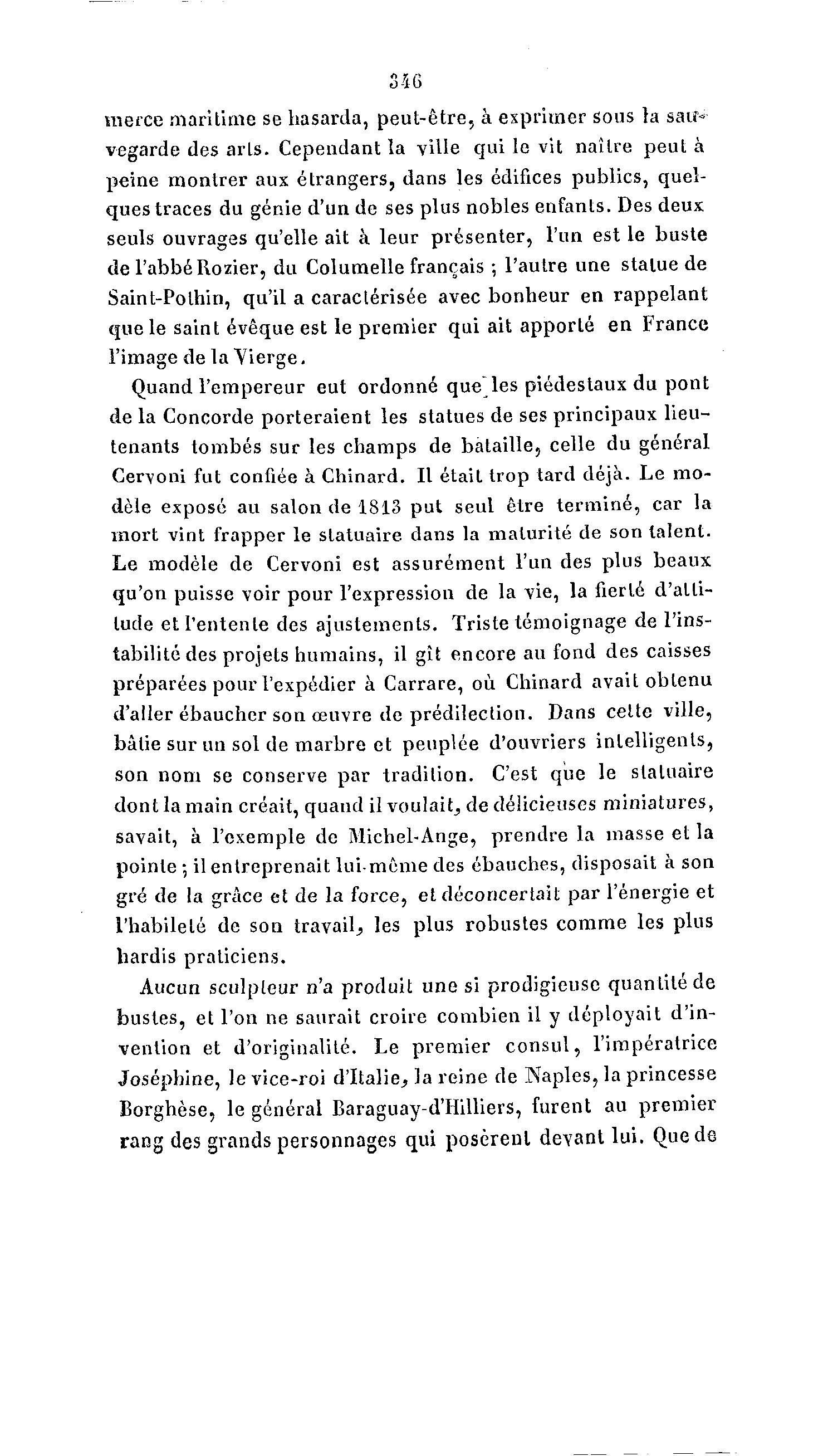 346 merce maritime se hasarda, peut-être, à exprimer sous la sair* vegarde des arts. Cependant la ville qui le vit naître peut à peine montrer aux étrangers, dans les édifices publics, quel- ques traces du génie d'un de ses plus nobles enfants. Des deux seuls ouvrages qu'elle ait à leur présenter, l'un est le buste de l'abbé Rozier, du Columelle français ; l'autre une statue de Saint-Polhin, qu'il a caraclérisée avec bonheur en rappelant que le saint évêque est le premier qui ait apporté en France l'image d e l à Yierge. Quand l'empereur eut ordonné que les piédestaux du pont de la Concorde porteraient les statues de ses principaux lieu- tenants tombés sur les champs de bataille, celle du général Cervoni fut confiée à Chinard. Il était trop tard déjà . Le mo- dèle exposé au salon de 1813 put seul être terminé, car la mort vint frapper le statuaire dans la maturité de son talent. Le modèle de Cervoni est assurément l'un des plus beaux qu'on puisse voir pour l'expression de la vie, la fierté d'atti- tude et l'entente des ajustements. Triste témoignage de l'ins- tabilité des projets humains, il gît encore au fond des caisses préparées pour l'expédier à Carrare, où Chinard avait obtenu d'aller ébaucher son œuvre de prédilection. Dans celle ville, bà lie sur un sol de marbre et peuplée d'ouvriers intelligents, son nom se conserve par tradition. C'est que le slaluaire dont la main créait, quand ilvoulait, de délicieuses miniatures, savait, à l'exemple de Michel-Ange, prendre la masse et la pointe ; il entreprenait lui-même des ébauches, disposait à son gré de la grâce et de la force, et déconcertait par l'énergie et l'habileté de son travail., les plus robustes comme les plus hardis praticiens. Aucun sculpteur n'a produit une si prodigieuse quantité de bustes, et l'on ne saurait croire combien il y déployait d'in- vention et d'originalité. Le premier c o n s u l , l'impératrice Joséphine, le vice-roi d'Italie, la reine de Naples, la princesse Borghèse, le général Baraguay-d'Hilliers, furent au premier rang des grands personnages qui posèrenl devant lui. Que de