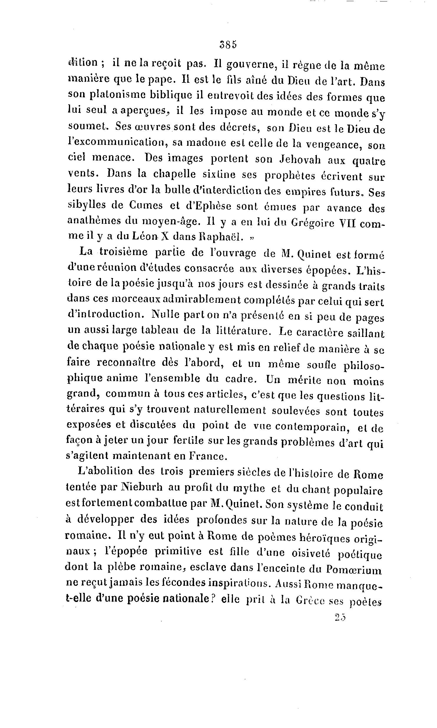 385 ttilion ; il ne la reçoit pas. Il gouverne, il règne de la même manière que le pape. Il est le fils aîné du Dieu de l'art. Dans son platonisme biblique il entrevoit des idées des formes que lui seul a aperçues^ il les impose au monde et ce monde s'y soumet. Ses œuvres sont des décrets, son Dieu est le Dieu de l'excommunication, sa madone est celle de la vengeance, son ciel menace. Des images portent son Jehovah aux quatre vents. Dans la chapelle sixtine ses prophètes écrivent sur leurs livres d'or la bulle d'interdiction des empires futurs. Ses sibylles de Cumes et d'Ephèse sont émues par avance des anathèmes du moyen-âge. H y a en lui du Grégoire VII com- me il y a du Léon X dans Raphaël. » La troisième partie de l'ouvrage de M. Quinet est formé d'une réunion d'études consacrée aux diverses épopées. L'his- toire de la poésie jusqu'à nos jours est dessinée à grands traits dans ces morceaux admirablement complétés par celui qui sert d'introduction. Nulle part on n'a présenté en si peu de pages un aussi large tableau de la littérature. Le caractère saillant de chaque poésie nationale y est mis en relief de manière à se faire reconnaître dès l'abord, et un même soufïe philoso- phique anime l'ensemble du cadre. Un mérite non moins grand, commun à tous ces articles, c'est que les questions lit- téraires qui s'y trouvent naturellement soulevées sont toutes exposées et discutées du point de vue contemporain, et de façon à jeter un jour fertile sur les grands problèmes d'art qui s'agitent maintenant en France. L'abolition des trois premiers siècles de l'histoire de Rome tentée par Nieburh au profit du mythe et du chant populaire estfortementcombattue par M.Quinet. Son système le conduit à développer des idées profondes sur la nature de la poésie romaine. Il n'y eut point à Rome de poèmes héroïques origi- naux ; l'épopée primitive est fille d'une oisiveté poétique dont la plèbe romaine, esclave dans l'enceinte du Pomœrium ne reçut jamais les fécondes inspirations. Aussi Rome manque- t-elle d'une poésie nationale ? elle prit à la Grèce ses poètes