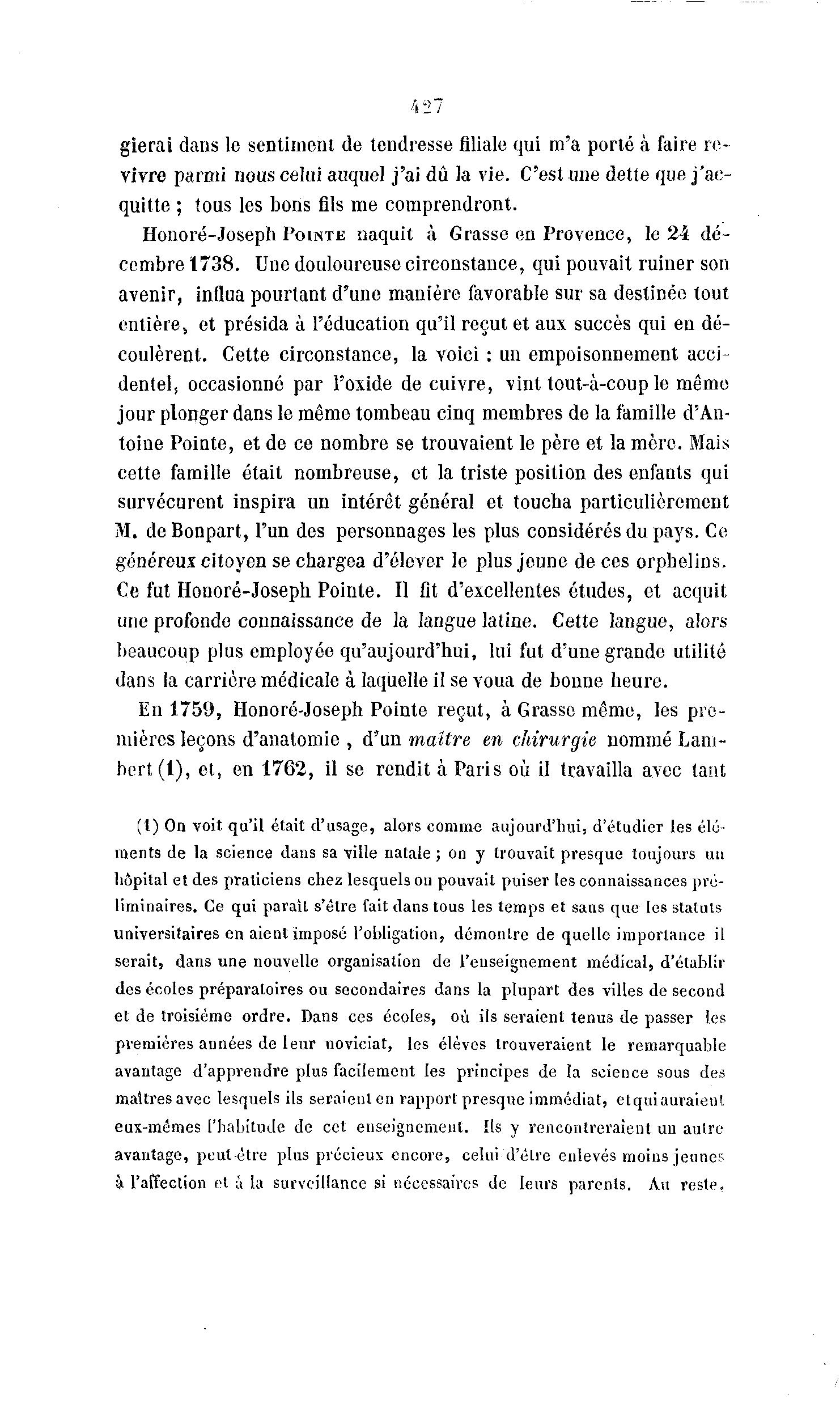 gierai dans le sentiment de tendressefilialequi m'a porté à faire re- vivre parmi nous celui auquel j'ai dû la vie. C'est une dette que j'ac- quitte ; tous les bons fils me comprendront. Honoré-Joseph POINTE naquit à Grasse en Provence, le 2i dé- cembre 1738. Une douloureuse circonstance, qui pouvait ruiner son avenir, influa pourtant d'une manière favorable sur sa destinée tout entière, et présida à l'éducation qu'il reçut et aux succès qui eu dé- coulèrent. Cette circonstance, la voici : un empoisonnement acci- dentel, occasionné par l'oxide de cuivre, vint tout-à -couple même jour plonger dans le même tombeau cinq membres de la famille d'An- toine Pointe, et de ce nombre se trouvaient le père et la mère. Mais cette famille était nombreuse, et la triste position des enfants qui survécurent inspira un intérêt général et toucha particulièrement M. deBonpart, l'un des personnages les plus considérés du pays. Ce généreux citoyen se chargea d'élever le plus jeune de ces orphelins. Ce fut Honoré-Joseph Pointe. Il fit d'excellentes études, et acquit une profonde connaissance de la langue latine. Cette langue, alors beaucoup plus employée qu'aujourd'hui, lui fut d'une grande utilité dans la carrière médicale à laquelle il se voua de bonne heure. En 1759, Honoré-Joseph Pointe reçut, à Grasse même, les pre- mières leçons d'anatomie , d'un maître en chirurgie nommé Lam- bert (1), et, en 1762, il se rendit à Paris où il travailla avec tant (1) On voit qu'il était d'usage, alors comme aujourd'hui, d'étudier les élé- ments de la science dans sa ville natale ; on y trouvait presque toujours un hôpital et des praticiens chez lesquels on pouvait puiser les connaissances pré- liminaires. Ce qui paraît s'être fait dans tous les temps et sans que les statuts universitaires en aient imposé l'obligation, démontre de quelle importance il serait, dans une nouvelle organisation de l'enseignement médical, d'établir des écoles préparatoires ou secondaires dans la plupart des villes de second et de troisième ordre. Dans ces écoles, où ils seraient tenus de passer les premières années de leur noviciat, les élèves trouveraient le remarquable avantage d'apprendre plus facilement les principes de la science sous des maîtres avec lesquels ils seraient en rapport presque immédiat, etquiauraienl eux-mêmes l'habitude de cet enseignement. Ils y rencontreraient un autre avantage, peut-être plus précieux encore, celui d'être enlevés moins jeunes à l'affection et à la surveillance si nécessaires de leurs parents. Au reste.