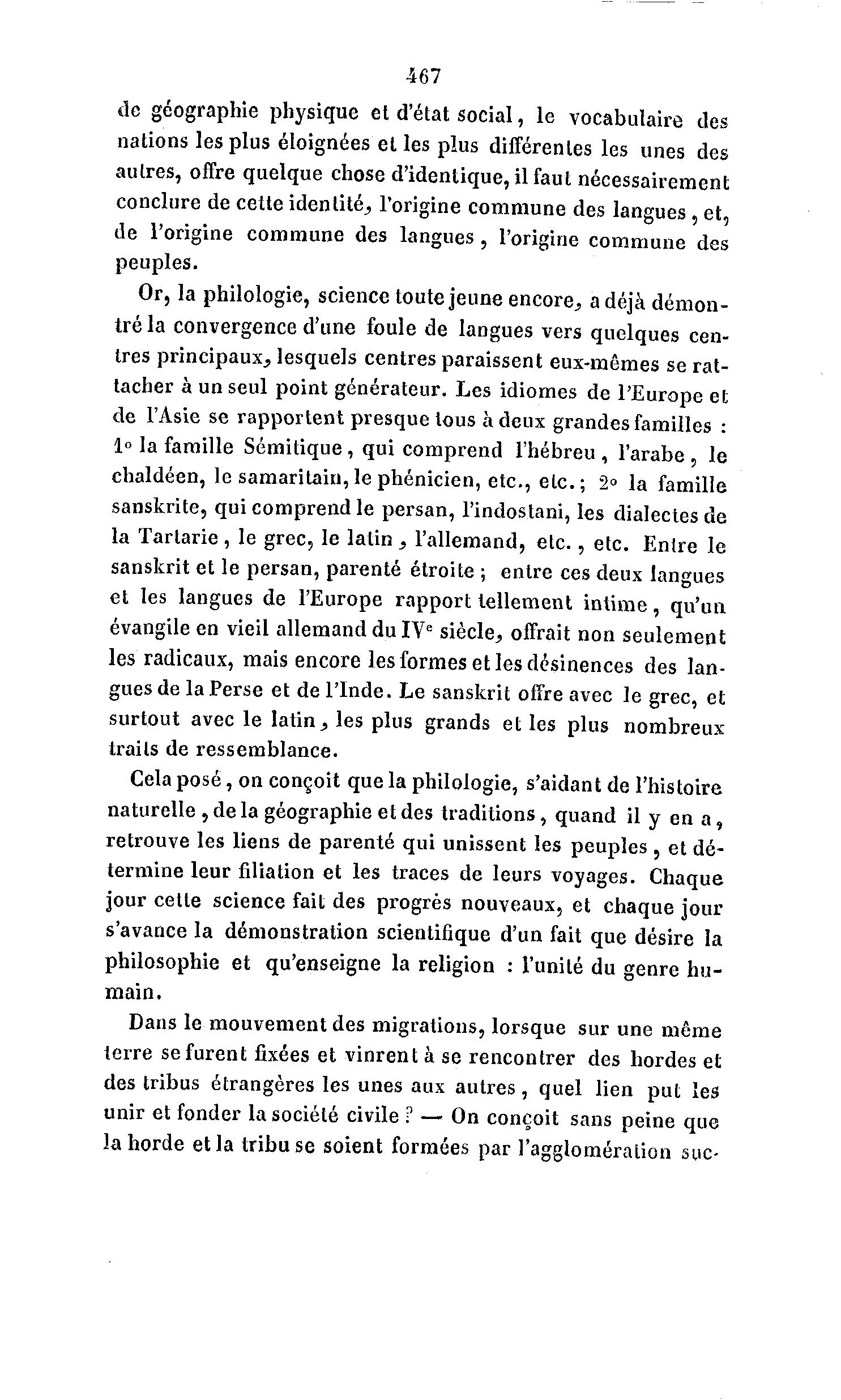 467 de géographie physique et d'état social, le vocabulaire des nations les plus éloignées et les plus différentes les unes des autres, offre quelque chose d'identique, il faut nécessairement conclure de cette identité, l'origine commune des langues, et, de l'origine commune des langues , l'origine commune des peuples. Or, la philologie, science toute jeune encore., a déjà démon- tré la convergence d'une foule de langues vers quelques cen- tres principaux, lesquels centres paraissent eux-mêmes se rat- tacher à un seul point générateur. Les idiomes de l'Europe et de l'Asie se rapportent presque tous à deux grandes familles : 1° la famille Sémitique , qui comprend l'hébreu , l'arabe , le chaldéen, le samaritain,le phénicien, etc., etc.; 2° la famille sanskrite, qui comprend le persan, l'indostani, les dialectes de la Tartarie , le grec, le latin , l'allemand, etc., etc. Entre le sanskrit et le persan, parenté étroite ; entre ces deux langues et les langues de l'Europe rapport tellement intime, qu'un évangile en vieil allemand du IVe siècle, offrait non seulement les radicaux, mais encore les formes et les désinences des lan- gues de la Perse et de l'Inde. Le sanskrit offre avec le grec, et surtout avec le latin, les plus grands et les plus nombreux traits de ressemblance. Cela posé, on conçoit que la philologie, s'aidant de l'histoire naturelle , de la géographie et des traditions, quand il y en a, retrouve les liens de parenté qui unissent les peuples , et dé- termine leur filiation et les traces de leurs voyages. Chaque jour cette science fait des progrès nouveaux, et chaque jour s'avance la démonstration scientifique d'un fait que désire la philosophie et qu'enseigne la religion : l'unité du genre hu- main. Dans le mouvement des migrations, lorsque sur une même terre se furent fixées et vinrent à se rencontrer des hordes et des tribus étrangères les unes aux autres, quel lien put les unir et fonder la société civile ? — On conçoit sans peine que la horde et la tribu se soient formées par l'agglomération suc-