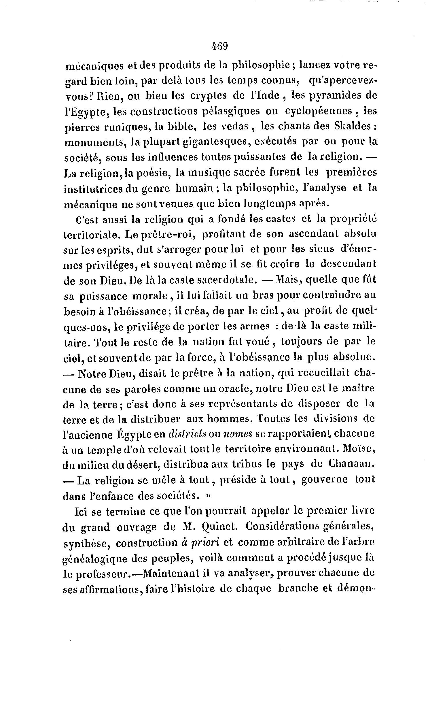469 mécaniques et des produits de la philosophie ; lancez votre re- gard bien loin, par delà tous les temps connus, qu'apercevez- Vous? Rien, ou bien les cryptes de l'Inde , les pyramides de l'Egypte, les constructions pélasgiques ou cyclopéennes , les pierres runiques, la bible, les vedas , les chants des Skaldes : monuments, la plupart gigantesques, exécutés par ou pour la société, sous les influences toutes puissantes de la religion. — La religion,la poésie, la musique sacrée furent les premières institutrices du genre humain ; la philosophie, l'analyse et la mécanique ne sont venues que bien longtemps après. C'est aussi la religion qui a fondé les castes et la propriété territoriale. Le prêtre-roi, profitant de son ascendant absolu sur les esprits, dut s'arroger pour lui et pour les siens d'énor- mes privilèges, et souvent m ê m e il se fit croire le descendant de son Dieu. De là la caste sacerdotale. —Mais^ quelle que fût sa puissance morale , il lui fallait un bras pour contraindre au besoin à l'obéissance; il créa, de par le c i e l , au profit de quel- ques-uns, le privilège de porter les armes : de là la caste mili- taire. Tout le reste de la nation fut v o u é , toujours de par le ciel, et souvent de par la force, à l'obéissance la plus absolue. — Notre Dieu, disait le prêtre à la nation, qui recueillait cha- cune de ses paroles comme un oracle, notre Dieu est l e maître de la t e r r e ; c'est donc à ses représentants de disposer de la terre et de la distribuer aux hommes. Toutes les divisions de l'ancienne Egypte en districts ou nomes se rapportaienl chacune à un temple d'où relevait tout le territoire environnant. Moïse, du milieu du désert, distribua aux tribus le pays de Chanaan. — La religion se mêle à t o u t , préside à t o u t , gouverne tout dans l'enfance des sociétés. » Ici se termine ce que l'on pourrait appeler le premier livre du grand ouvrage de M. Quinet. Considérations générales, synthèse, construction à priori et comme arbitraire de l'arbre généalogique des peuples, voilà comment a procédéjusque là le professeur.—Maintenant il va analyser, prouver chacune de ses affirmations, faire l'histoire de chaque branche et démon-