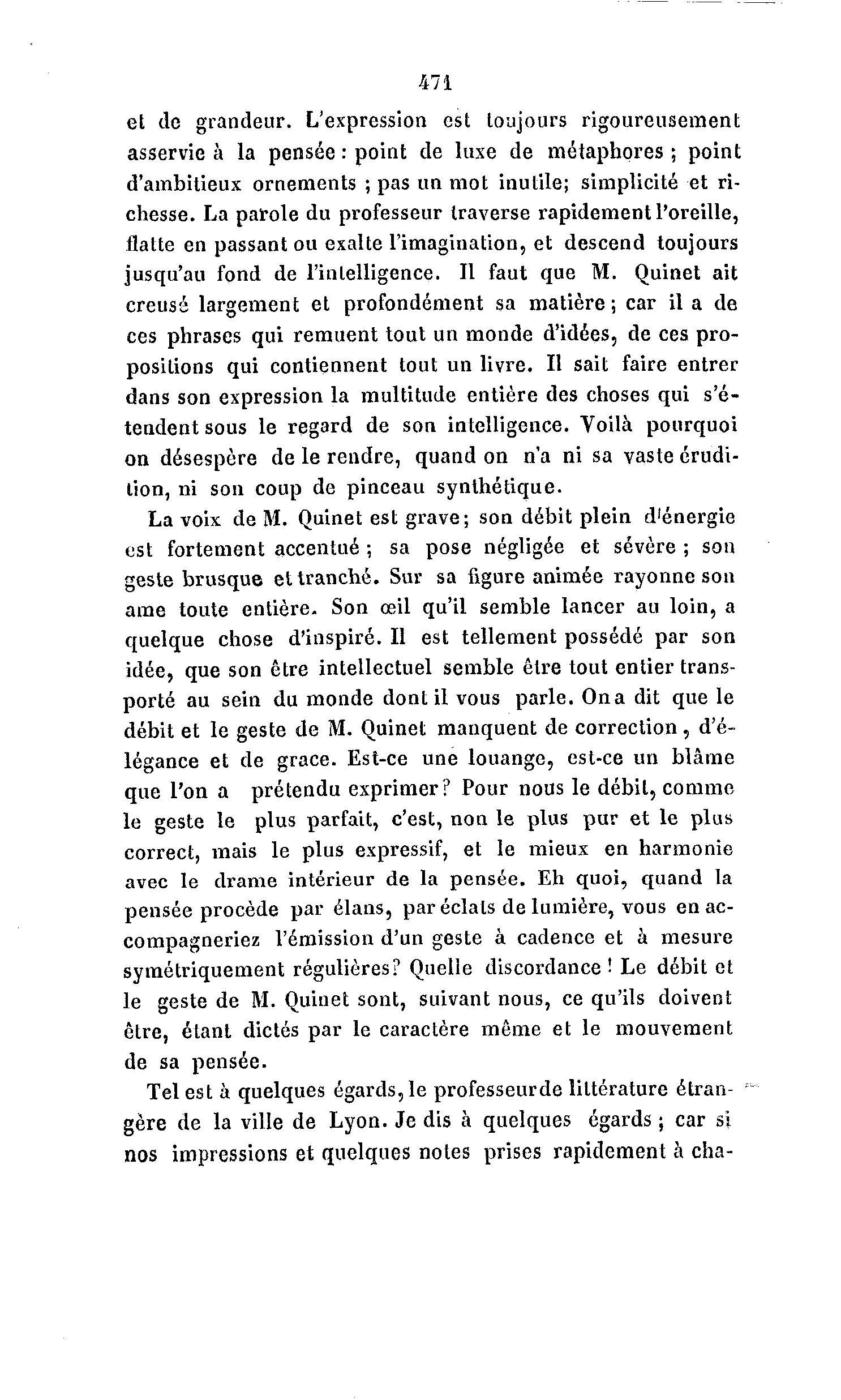 47i et de grandeur. L'expression est toujours rigoureusement asservie à la pensée : point de luxe de métaphores ; point d'ambitieux ornements ; pas un mot inutile; simplicité et ri- chesse. La parole du professeur traverse rapidement l'oreille, flatte en passant ou exalte l'imagination, et descend toujours jusqu'au fond de l'intelligence. Il faut que M. Quinet ait creusé largement et profondément sa matière; car il a de ces phrases qui remuent tout un monde d'idées, de ces pro- positions qui contiennent tout un livre. Il sait faire entrer dans son expression la multitude entière des choses qui s'é- tendent sous le regard de son intelligence. Voilà pourquoi on désespère de le rendre, quand on n'a ni sa vaste érudi- tion, ni son coup de pinceau synthétique. La voix de M. Quinet est grave; son débit plein d'énergie est fortement accentué ; sa pose négligée et sévère ; son geste brusque et tranché. Sur sa figure animée rayonne sou ame toute entière. Son œil qu'il semble lancer au loin, a quelque chose d'inspiré. Il est tellement possédé par son idée, que son être intellectuel semble être tout entier trans- porté au sein du monde dont il vous parle. Ona dit que le débit et le geste de M. Quinet manquent de correction, d'é- légance et de grâce. Est-ce une louange, est-ce un blâme que l'on a prétendu exprimer? Pour nous le débit, comme le geste le plus parfait, c'est, non le plus pur et le plus correct, mais le plus expressif, et le mieux en harmonie avec le drame intérieur de la pensée. Eh quoi, quand la pensée procède par élans, par éclats de lumière, vous en ac- compagneriez l'émission d'un geste à cadence et à mesure symétriquement régulières? Quelle discordance ! Le débit et le geste de M. Quinet sont, suivant nous, ce qu'ils doivent être, étant dictés par le caractère même et le mouvement de sa pensée. Tel est à quelques égards, le professeurde littérature étran- gère de la ville de Lyon. Je dis à quelques égards ; car si nos impressions et quelques notes prises rapidement à cha-