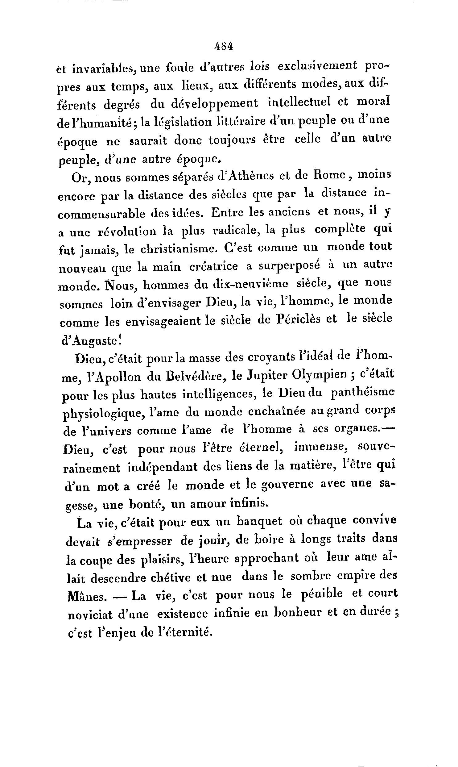 484 et invariables, une foule d'autres lois exclusivement pro-> près aux temps, aux lieux, aux différents modes, aux dif- férents degrés du développement intellectuel et moral de l'humanité ; la législation littéraire d'un peuple ou d'une époque ne saurait donc toujours être celle d'un autre peuple, d'une autre époque. Or, nous sommes séparés d'Athènes et de Rome, moins encore par la distance des siècles que par la distance in- commensurable des idées. Entre les anciens et nous, il y a une révolution la plus radicale, la plus complète qui fut jamais, le christianisme. C'est comme ua monde tout nouveau que la main créatrice a surperposé à un autre monde. Nous, hommes du dix-neuvième siècle, que nous sommes loin d'envisager Dieu, la vie, l'homme, le monde comme les envisageaient le siècle de Périclès et le siècle d'Auguste ! Dieu, c'était pour la masse des croyants l'idéal de Fhom- me, l'Apollon du Belvédère, le Jupiter Olympien ; c'était pour les plus hautes intelligences, le Dieu du panthéisme physiologique, l'ame du monde enchaînée au grand corps de l'univers comme l'ame de l'homme à ses organes.— Dieu, c^est pour nous l'être éternel, immense, souve- rainement indépendant des liens de la matière, l'être qui d'un mot a créé le monde et le gouverne avec une sa- gesse, une bonté, un amour infinis. La vie, c'était pour eux un banquet où chaque convive devait s'empresser de jouir, de boire à longs traits dans la coupe des plaisirs, l'heure approchant où leur ame al- lait descendre chétive et nue dans le sombre empire des Mânes. — La vie, c'est pour nous le pénible et court noviciat d'une existence infinie en bonheur et en durée j c'est l'enjeu de l'éternité.