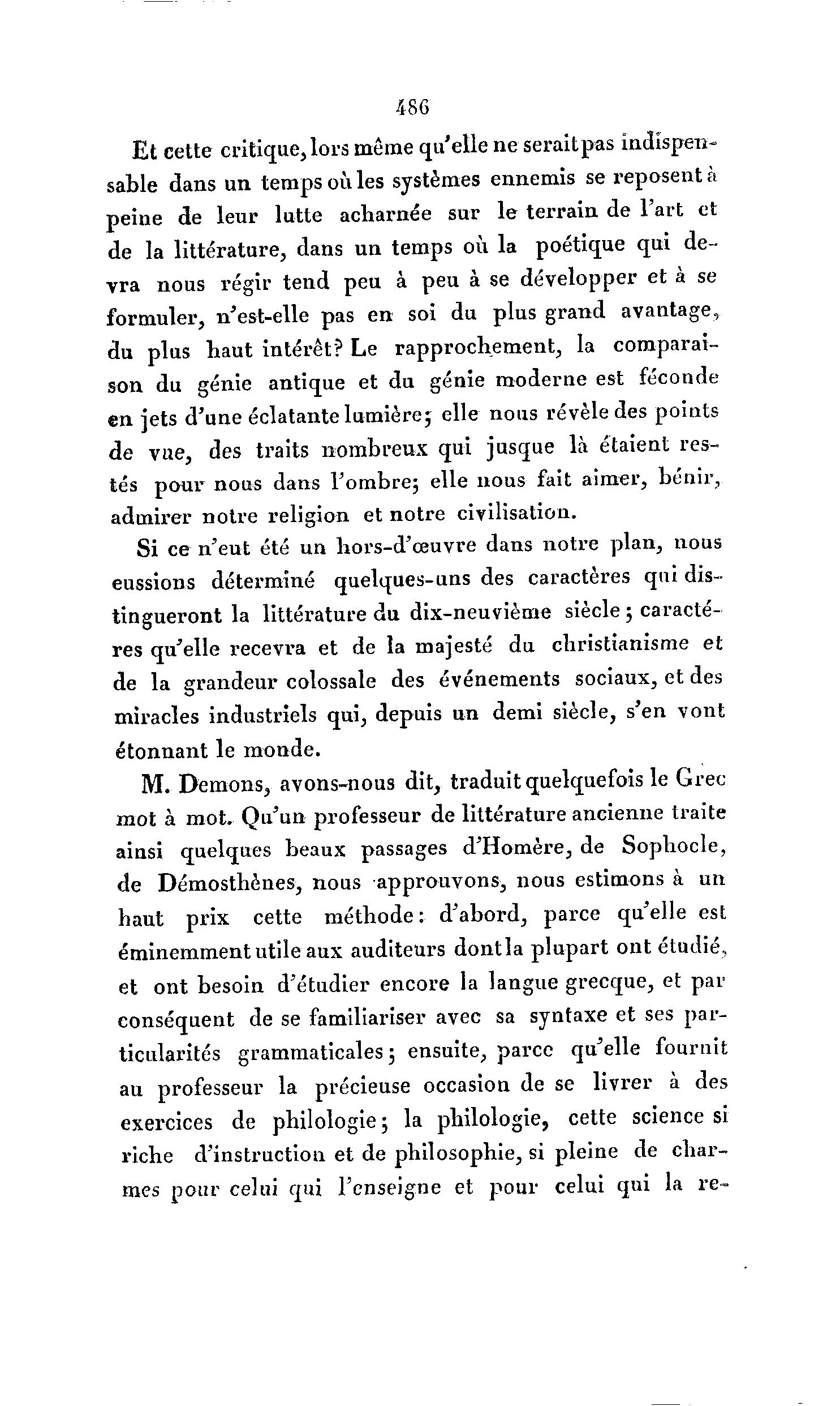 486 Et cette critique, lors môme qu'elle ne seraitpas indispen- sable dans un temps où les systèmes ennemis se reposent à peine de leur lutte acharnée sur le terrain de l'art et de la littérature, dans un temps où la poétique qui de- vra nous régir tend peu à peu à se développer et à se formuler, n'est-elle pas en soi du plus grand avantage, du plus haut intérêt? Le rapprochement, la comparai- son du génie antique et du génie moderne est féconde en jets d'une éclatante lumière; elle nous révèle des points de vue, des traits nombreux qui jusque là étaient res- tés pour nous dans l'ombre; elle nous fait aimer, bénir, admirer notre religion et notre civilisation. Si ce n'eut été un hors-d'œuvre dans notre plan, nous eussions déterminé quelques-uns des caractères qui dis- tingueront la littérature du dix-neuvième siècle ; caractè- res qu'elle recevra et de la majesté du christianisme et de la grandeur colossale des événements sociaux, et des miracles industriels qui, depuis un demi siècle, s'en vont étonnant le monde. M. Démons, avons-nous dit, traduit quelquefois le Grec mot à mot. Qu'un professeur de littérature ancienne traite ainsi quelques beaux passages d'Homère, de Sophocle, de Démosthènes, nous approuvons, nous estimons à un haut prix cette méthode: d'abord, parce qu'elle est éminemment utile aux auditeurs dontla plupart ont étudié, et ont besoin d'étudier encore la langue grecque, et par conséquent de se familiariser avec sa syntaxe et ses par- ticularités grammaticales; ensuite, parce qu'elle fournit au professeur la précieuse occasion de se livrer à des exercices de philologie ; la philologie, cette science si riche d'instruction et de philosophie, si pleine de char- mes pour celui qui l'enseigne et pour celui qui la re-