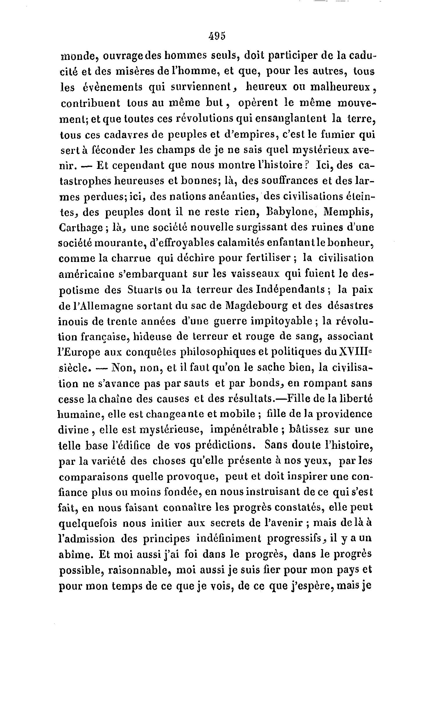 495 monde, ouvrage des hommes seuls, doit participer de la cadu- cité et des misères de l'homme, et que, pour les autres, tous les événements qui surviennent, heureux ou malheureux, contribuent tous au même b u t , opèrent le même mouve- ment; et que toutes ces révolutions qui ensanglantent la terre, tous ces cadavres de peuples et d'empires, c'est le fumier qui sert à féconder les champs de je ne sais quel mystérieux ave- nir. — Et cependant que nous montre l'histoire ? Ici, des ca- tastrophes heureuses et bonnes; là , des souffrances et des lar- mes perdues; ici, des nations anéanties, des civilisations étein- tes, des peuples dont il ne reste rien, Babylone, Memphis, Carthage ; là , une société nouvelle surgissant des ruines d'une société mourante, d'effroyables calamités enfantant le bonheur, comme la charrue qui déchire pour fertiliser ; la civilisation américaine s'embarquant sur les vaisseaux qui fuient le des- potisme des Stuarls ou la terreur des Indépendants ; la paix de l'Allemagne sortant du sac de Magdebourg et des désastres inouis de trente années d'une guerre impitoyable ; la révolu- tion française, hideuse de terreur et rouge de sang, associant l'Europe aux conquêtes philosophiques et politiques duXVIIIe siècle. — Non, non, et il faut qu'on le sache bien, la civilisa- tion ne s'avance pas par sauts et par bonds, en rompant sans cesse la chaîne des causes et des résultats.—Fille de la liberté humaine, elle est changeante et mobile ; fille de la providence divine , elle est mystérieuse, impénétrable ; bâtissez sur une telle base l'édifice de vos prédictions. Sans doute l'histoire, par la variété des choses qu'elle présente à nos yeux, parles comparaisons quelle provoque, peut et doit inspirer une con- fiance plus ou moins fondée, en nous instruisant de ce qui s'est fait, en nous faisant connaître les progrès constatés, elle peut quelquefois nous initier aux secrets de l'avenir ; mais de là à l'admission des principes indéfiniment progressifs, il y a un abîme. Et moi aussi j'ai foi dans le progrès, dans le progrès possible, raisonnable, moi aussi je suis fier pour mon pays et pour mon temps de ce que je vois, de ce que j'espère, mais je