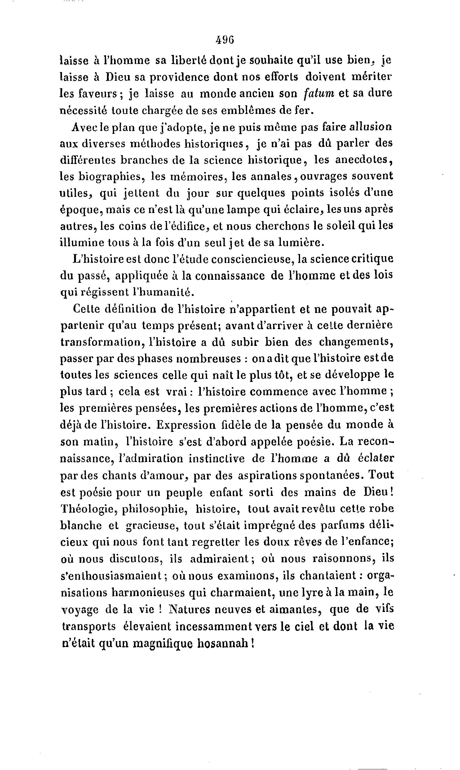 49G laisse à l'homme sa liberté dont je souhaite qu'il use bien, je laisse à Dieu sa providence dont nos efforts doivent mériter les faveurs ; je laisse au monde ancien son fatum et sa dure nécessité toute chargée de ses emblèmes de fer. Avec le plan que j'adopte, je ne puis même pas faire allusion aux diverses méthodes historiques, je n'ai pas dû parler des différentes branches de la science historique, les anecdotes, les biographies, les mémoires, les annales,ouvrages souvent utiles, qui jettent du jour sur quelques points isolés d'une époque, mais ce n'est là qu'une lampe qui éclaire, les uns après autres, les coins de l'édifice, et nous cherchons le soleil qui les illumine tous à la fois d'un seul jet de sa lumière. L'histoire est donc l'étude consciencieuse, la science critique du passé, appliquée à la connaissance de l'homme et des lois qui régissent l'humanité. Cette définition de l'histoire n'appartient et ne pouvait a p - partenir qu'au temps présent; avant d'arriver à cette dernière transformation, l'histoire a dû subir bien des changements, passer par des phases nombreuses : on a dit que l'histoire est de toutes les sciences celle qui naît le plus tôt, et se développe le plus tard ; cela est vrai : l'histoire commence avec l'homme ; les premières pensées, les premières actions de l'homme, c'est déjà de l'histoire. Expression fidèle de la pensée du monde à son malin, l'histoire s'est d'abord appelée poésie. La recon- naissance, l'admiration instinctive de l'homme a dû éclater par des chants d'amour, par des aspirations spontanées. Tout est poésie pour un peuple enfant sorti des mains de Dieu! Théologie, philosophie, histoire, tout avait revêtu cette robe blanche et gracieuse, tout s'était imprégné des parfums déli- cieux qui nous font tant regretter les doux rêves de l'enfance; où nous discutons, ils admiraient; où nous raisonnons, ils s'enthousiasmaient; où nous examinons, ils chantaient: orga- nisations harmonieuses qui charmaient, une lyre à la main, le voyage de la vie ! Natures neuves et aimantes, que de vifs transports élevaient incessamment vers le ciel et dont la vie n'était qu'un magnifique hosannah !