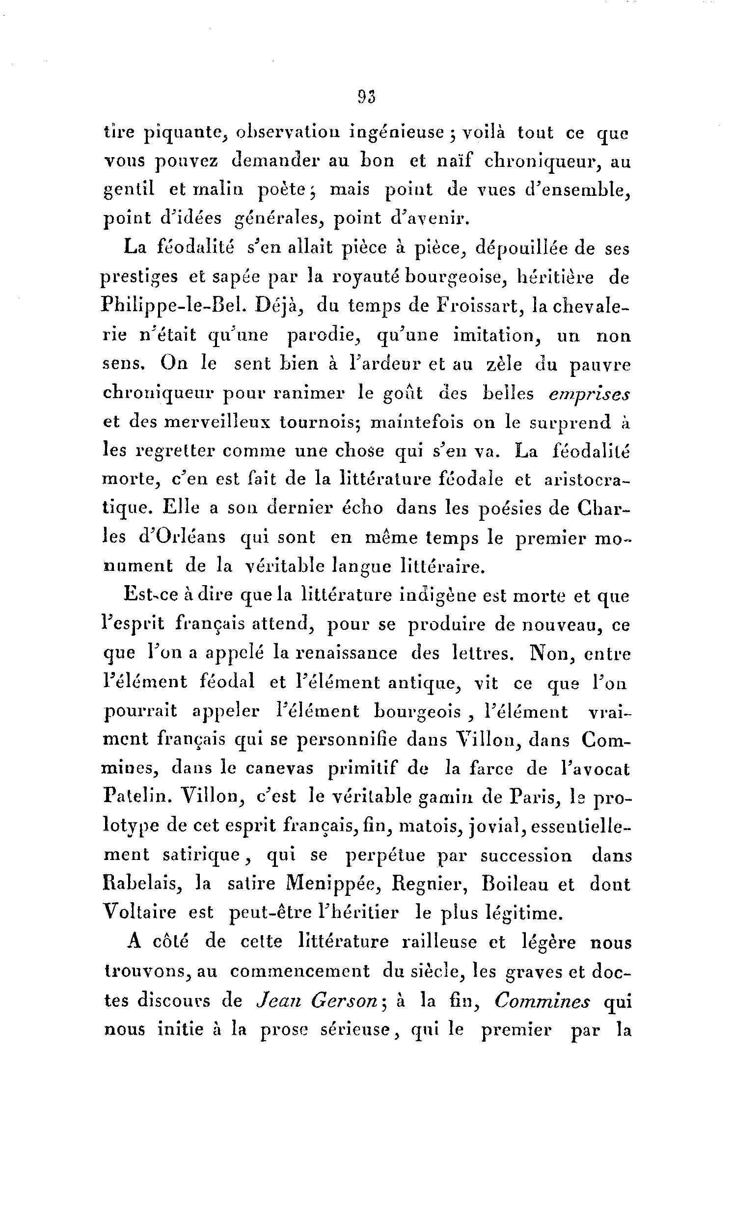 93 tire piquante, observation ingénieuse ; voilà tout ce que vous pouvez demander au Lon et naïf chroniqueur, au gentil et malin poète ; mais point de vues d'ensemble, point d'idées générales, point d'avenir. La féodalité s'en allait pièce à pièce, dépouillée de ses prestiges et sapée par la royauté bourgeoise, héritière de Philippe-le-Bel. Déjà , du temps de Froissart, la chevale- rie n'était qu'une parodie, qu'une imitation, un non sens. On le sent bien à l'ardeur et au zèle du pauvre chroniqueur pour ranimer le goût des belles emprises et des merveilleux tournois; maintefois on le surprend à les regretter comme une chose qui s'en va. La féodalité morte, c'en est fait de la littérature féodale et aristocra- tique. Elle a sou dernier écho dans les poésies de Char- les d'Orléans qui sont en même temps le premier mo- nument de la véritable langue littéraire. Est-ce à dire que la littérature indigène est morte et que l'esprit français attend, pour se produire de nouveau, ce que l'on a appelé la renaissance des lettres. Non, entre l'élément féodal et l'élément antique, vit ce que l'on pourrait appeler l'élément bourgeois , l'élément vrai- ment français qui se personnifie dans Villon, dans Com- mines, dans le canevas primitif de la farce de l'avocat Patelin. Villon, c'est le véritable gamin de Paris, \s pro- lotype de cet esprit français, fin, matois, jovial, essentielle- ment satirique, qui se perpétue par succession dans Rabelais, la satire Menippée, Régnier, Boileau et dont Voltaire est peut-être l'héritier le plus légitime. A côté de cette littérature railleuse et légère nous trouvons, au commencement du siècle, les graves et doc- tes discours de Jean Gerson; à la fin, Commines qui nous initie à la prose sérieuse, qui le premier par la