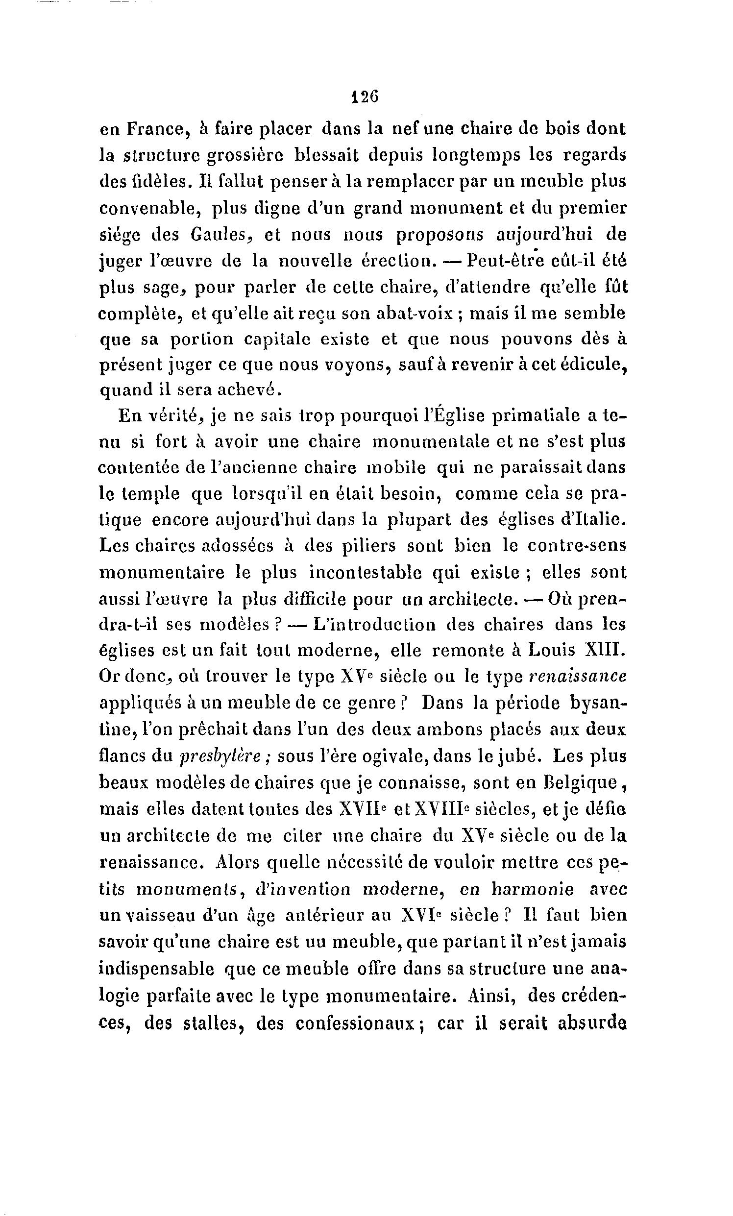 126 en France, à faire placer dans la nef une chaire de bois dont la structure grossière blessait depuis longtemps les regards des fidèles. Il fallut p e n s e r a la remplacer par un meuble plus convenable, plus digne d'un grand monument et du premier siège des Gaules, et nous nous proposons aujourd'hui de juger l'œuvre de la nouvelle érection. — Peut-être eût-il été plus sage, pour parler de cette chaire, d'attendre qu'elle fût complète, et qu'elle ait reçu son abat-voix ; mais il me semble que sa portion capitale existe et que nous pouvons dès à présent juger ce que nous voyons, sauf à revenir à cet édicule, quand il sera achevé. En vérité, je ne sais irop pourquoi l'Église primatiale a t e - nu si fort à avoir une chaire monumentale et ne s'est plus coutentée de l'ancienne chaire mobile qui ne paraissait dans le temple que lorsqu'il en était besoin, comme cela se pra- tique encore aujourd'hui dans la plupart des églises d'Italie. Les chaires adossées à des piliers sont bien le contre-sens monumentaire le plus incontestable qui existe ; elles sont aussi l'œuvre la plus difficile pour un architecte.—Où p r e n - dra-t-il ses modèles? — L'introduction des chaires dans les églises est un fait tout moderne, elle remonte à Louis XIII. Or donc, où trouver le type XVe siècle ou le type renaissance appliqués à un meuble de ce genre ? Dans la période bysan- line, l'on prêchait dans l'un des deux ainbons placés aux deux flancs du presbytère ; sous l'ère ogivale, dans le jubé. Les plus beaux modèles de chaires que je connaisse, sont en Belgique, mais elles datent toutes des XVII e et XVIII e siècles, et je défie un architecte de me citer une chaire du XVe siècle ou de la renaissance. Alors quelle nécessité de vouloir mettre ces p e - tits m o n u m e n t s , d'invention moderne, en harmonie avec un vaisseau d'un âge antérieur au XVI8 siècle ? Il faut bien savoir qu'une chaire est uu meuble, que partant il n'est jamais indispensable que ce meuble offre dans sa structure une ana- logie parfaite avec le type monumentaire. Ainsi, des créden- ces, des stalles, des confessionaux; car il serait absurda