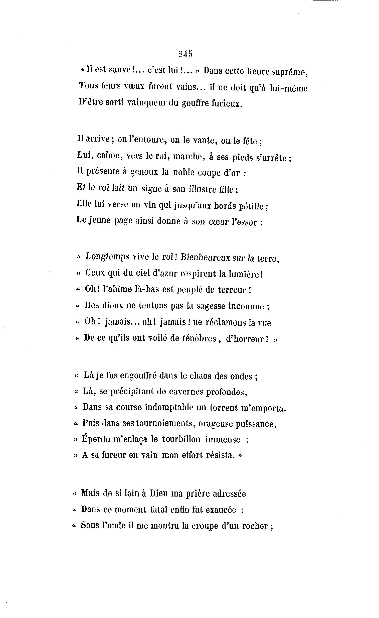 245 «Il est sauvé!... c'est lui!... » Dans cette heure suprême, Tous leurs vœux furent vains... il ne doit qu'à lui-même D'être sorti vainqueur du gouffre furieux. Il arrive ; on l'entoure, on le vante, on le fête ; Lui, calme, vers le roi, marche, à ses pieds s'arrête ; Il présente à genoux la noble coupe d'or : Et le roi fait un signe à son illustrefille; Elle lui verse un vin qui jusqu'aux bords pétille ; Le jeune page ainsi donne à son cœur l'essor : « Longtemps vive le roi] Bienheureux sur la terre, « Ceux qui du ciel d'azur respirent la lumière! « Oh ! l'abîme là -bas est peuplé de terreur ! « Des dieux ne tentons pas la sagesse inconnue ; « Oh ! jamais... oh! jamais ! ne réclamons la vue « De ce qu'ils ont voilé de ténèbres, d'horreur ! » « Là je fus engouffré dans le chaos des ondes ; « Là , se précipitant de cavernes profondes, « Dans sa course indomptable un torrent m'emporta. « Puis dans ses tournoiements, orageuse puissance, « Éperdu m'enlaça le tourbillon immense : « A sa fureur en vain mon effort résista. » « Mais de si loin à Dieu ma prière adressée « Dans ce moment fatal enfin fut exaucée : « Sous l'onde il me montra la croupe d'un rocher ;