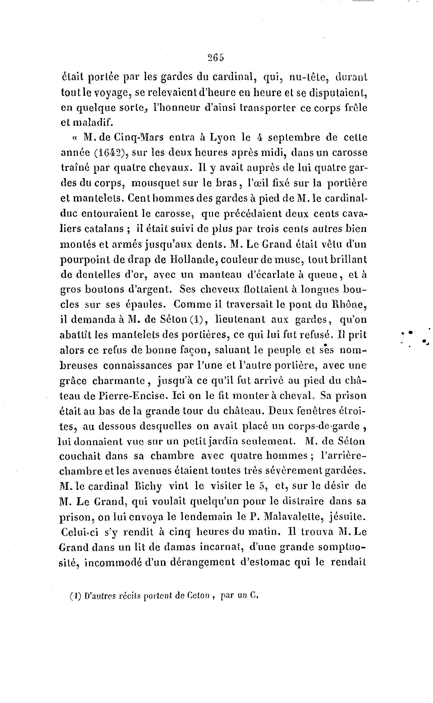 265 était portée par les gardes du cardinal, qui, nu-tête, durant toutle voyage, se relevaient d'heure en heure et se disputaient, en quelque sorle^ l'honneur d'ainsi transporter ce corps frêle et maladif. « M. de Cinq-Mars entra à Lyon le 4 septembre de celte année (1642), sur les deux heures après midi, dans un carosse traîné par quatre chevaux. Il y avait auprès de lui quatre gar- des du corps, mousquet sur le b r a s , l'œil fixé sur la portière et mantelets. Cent hommes des gardes à pied de M. le cardinal- duc entouraient le carosse, que précédaient deux cents cava- liers catalans ; il était suivi de plus par trois cents autres bien montés et armés jusqu'aux dents. M. Le Grand était vêtu d'un pourpoint de drap de Hollande, couleur de musc, tout brillant de dentelles d'or, avec un manteau d'écarlate à q u e u e , et à gros boutons d'argent. Ses cheveux flottaient à longues bou- cles sur ses épaules. Comme il traversait le pont du Rhône, il demanda à M. de Séton (1), lieutenant aux gardes, qu'on abattît les mantelets des portières, ce qui lui fut refusé. Il prit alors ce refus de bonne façon, saluant le peuple et ses n o m - breuses connaissances par l'une et l'autre portière, avec une grâce c h a r m a n t e , jusqu'à ce qu'il fut arrivé au pied du châ- teau de Pierre-Encise. Ici on le fit m o n t e r a cheval. Sa prison était au bas de la grande tour du château. Deux fenêtres étroi- tes, au dessous desquelles on avait placé un corps-degarde , lui donnaient vue sur un petit jardin seulement. M. de Séton couchait dans sa chambre avec quatre hommes ; l'arrière- chambre et les avenues étaient toutes très sévèrement gardées. M. le cardinal Bichy vint le visiter le 5, et, sur le désir de M. Le Grand, qui voulait quelqu'un pour le distraire dans sa prison, on lui envoya le lendemain le P. Malavalette, jésuite. Celui-ci s'y rendit à cinq heures du matin. Il trouva M. Le Grand dans un lit de damas incarnat, d'une grande somptuo- sité, incommodé d'un dérangement d'estomac qui le rendait (I) D'autres récils portent de Geton , par un C,