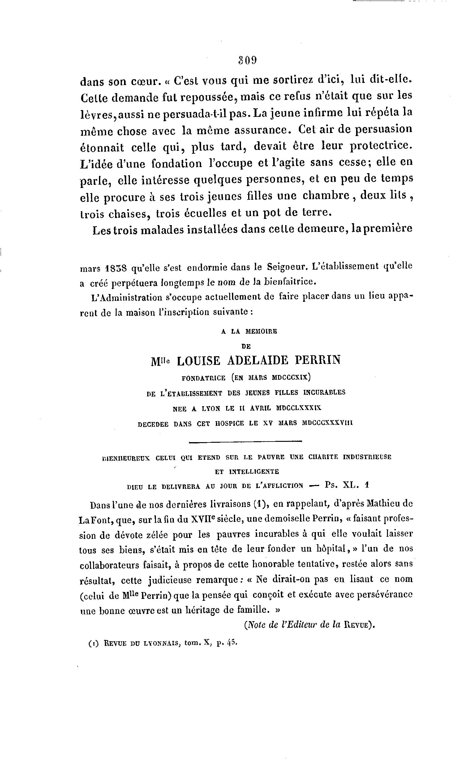 309 dans son cÅ“ur. « C'est vous qui me sortirez d'ici, lui dit-elle. Celle demande fut repoussée, mais ce refus n'était que sur les lèvres,aussi ne persuada-t-il pas. La jeune infirme lui répéta la même chose avec la même assurance. Cet air de persuasion étonnait celle qui, plus tard, devait être leur protectrice. L'idée d'une fondation l'occupe et l'agite sans cesse; elle en parle, elle intéresse quelques personnes, et en peu de temps elle procure à ses trois jeunes filles une chambre , deux lits , trois chaises, trois écuelles et un pot de terre. Les trois malades installées dans cette demeure, lapremière mars 1838 qu'elle s'est endormie dans le Seigneur. L'établissement qu'elle a créé perpétuera longtemps le nom de la bienfaitrice. L'Administration s'occupe actuellement de faire placer dans un lieu appa- rent de la maison l'inscription suivante : A LA MEMOIRE DE M»° LOUISE ADELAÃDE PERRIN FONDATRICE (EN MARS MDCCCXIX) DE L'ETABLISSEMENT DES JEUNES FILLES INCURABLES NEE A LYON LE II AVRIL MDCCLXXXIX DECEDEE DANS CET HOSPICE LE XV MARS MDCCCXXXVIII BIENHEUREUX CELUI QUI ETEND SUR LE PAUVRE UNE CHARITE INDUSTRIEUSE ET INTELLIGENTE DIEU LE DELIVRERA AU JOUR DE L'AFFLICTION PS. X L . 1 Dans l'une de nos dernières livraisons (1), en rappelant, d'après Mathieu de LaFont, que, sur lafindu XVIIe siècle, une demoiselle Perrin, « faisant profes- sion de dévote zélée pour les pauvres incurables à qui elle voulait laisser tous ses biens, s'était mis entête de leur fonder un hôpital,» l'un de nos collaborateurs faisait, à propos de cette honorable tentative, restée alors sans résultat, cette judicieuse remarque : « Ne dirait-on pas en lisant ce nom (celui de Mlle Perrin) que la pensée qui conçoit et exécute avec persévérance une bonne Å“uvre est un héritage de famille. » (Note de l'Editeur de la REVUE). (0 REVUE DU LVONNAIS, tom. X, j>, 45.