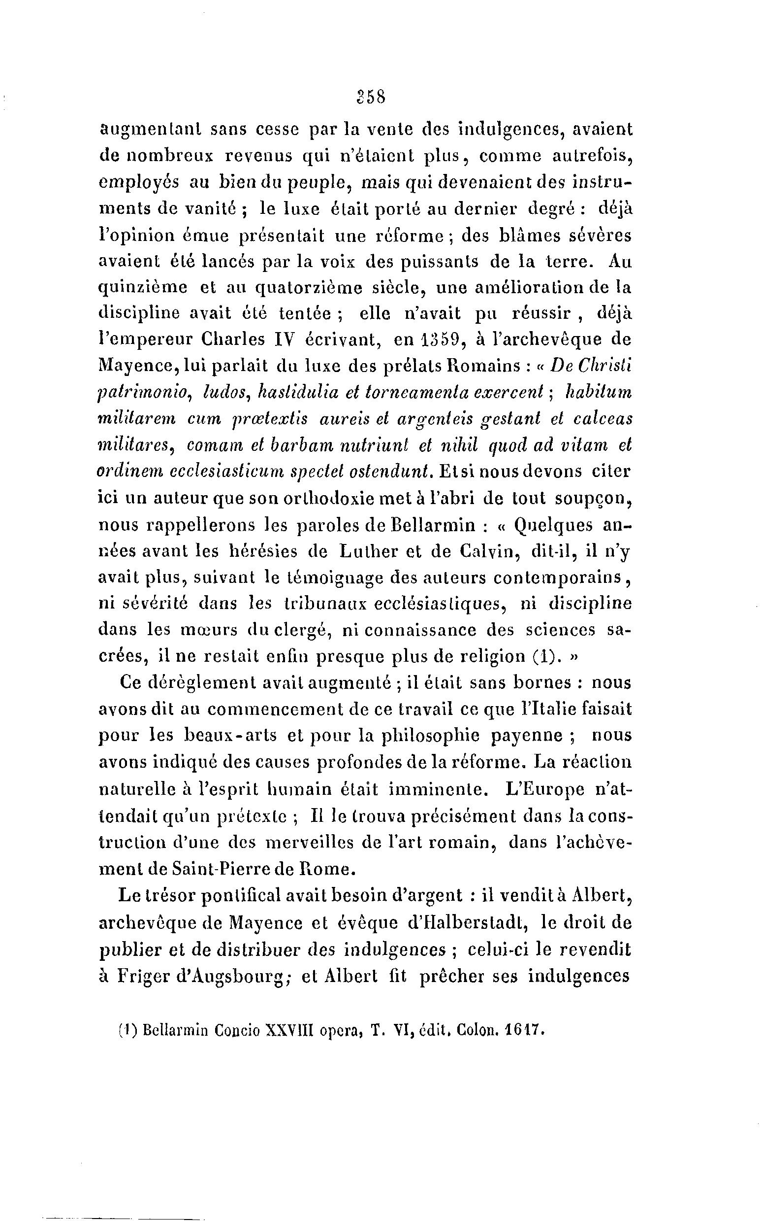 S58 augmentant sans cesse p a r l a vente des indulgences, avaient de nombreux revenus qui n'étaient p l u s , comme autrefois, employés au bien du peuple, mais qui devenaient des instru- ments de vanité ; le luxe était porté au dernier degré : déjà l'opinion émue présentait une réforme; des blâmes sévères avaient été lancés par la voix des puissants de la terre. Au quinzième et au quatorzième siècle, une amélioration de la discipline avait été tentée ; elle n'avait pu réussir , déjà l'empereur Charles IV écrivant, en 1359, à l'archevêque de Mayence, lui parlait du luxe des prélats Romains : « De Chrisii patrimonio, ludos, haslidulia et torneamenta exercent ; habitum militarem cum prœtextis aureis et argenteis gestant et calceas militares, comam et barbam mitriunt et nihil quod ad vitam et ordinem ecclesiasticum spectet ostendunt. Etsi nous devons citer ici un auteur que son orthodoxie met à l'abri de tout soupçon, nous rappellerons les paroles de Bellarmin : « Quelques an- nées avant les hérésies de Luther et de Calvin, dit-il, il n'y avait plus, suivant le témoignage des auteurs contemporains, ni sévérité dans les tribunaux ecclésiastiques, ni discipline dans les mœurs du clergé, ni connaissance des sciences sa- crées, il ne restait enfin presque plus de religion (1). » Ce dérèglement avait augmenté ; il était sans bornes : nous avons dit au commencement de ce travail ce que l'Italie faisait pour les beaux-arts et pour la philosophie payenne ; nous avons indiqué des causes profondes de la réforme. La réaction naturelle à l'esprit humain était imminente. L'Europe n'at- tendait qu'un prétexte ; Il le trouva précisément clans la cons- truction d'une des merveilles de l'art romain, dans l'achève- ment de Saint-Pierre de Piome. Le trésor pontifical avait besoin d'argent : il vendit à Albert, archevêque de Mayence et évêque d'Halbersladt, le droit de publier et de distribuer des indulgences ; celui-ci le revendit à Friger d'Augsbourg; et Albert fit prêcher ses indulgences (1) Bellarmin Concio XXVIII opcra, T. VI, édit, Colon. 1617.