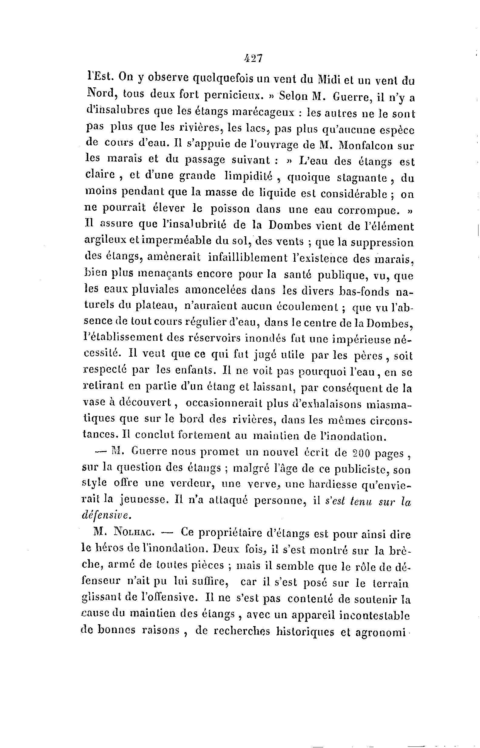 427 l'Est. On y observe quelquefois un vent du Midi et un venl du Nord, tous deux fort pernicieux. » Selon M. Guerre, il n'y a d'insalubres que les étangs marécageux : les autres ne le sont pas plus que les rivières, les lacs, pas plus qu'aucune espèce de cours d'eau. Il s'appuie de l'ouvrage de M. Monfalcon sur les marais et du passage suivant : « L'eau des étangs est claire , et d'une grande limpidité , quoique stagnante , du moins pendant que la masse de liquide est considérable ; on ne pourrait élever le poisson dans une eau corrompue. » Il assure que l'insalubrité de la Dombes vient de l'élément argileux et imperméable du sol, des vents ; que la suppression des étangs, amènerait infailliblement l'existence des marais, bien plus menaçants encore pour la santé publique, vu, que les eaux pluviales amoncelées dans les divers bas-fonds na- turels du plateau, n'auraient aucun écoulement ; que vu l'ab- sence de tout cours régulier d'eau, dans le centre de la Dombes, rétablissement des réservoirs inondés fut une impérieuse n é - cessité. Il veut que ce qui fut jugé utile par les pères , soit respecté par les enfants. Il ne voit pas pourquoi l'eau, en se retirant en partie d'un étang et laissant, par conséquent de la vase à découvert, occasionnerait plus d'exhalaisons miasma- tiques que sur le bord des rivières, dans les mômes circons- tances. Il conclut fortement au maintien de l'inondation. — M. Guerre nous promet un nouvel écrit de 200 pages , sur la question des étangs ; malgré l'âge de ce publicistc, son style offre une verdeur, une verve^ une hardiesse qu'envie- rait la jeunesse. Il n'a attaqué personne, il s'est tenu sur la défensive. M. NOLHAC. — Ce propriétaire d'étangs est pour ainsi dire le héros de l'inondation. Deux fois, il s'est montré sur la brè- che, armé de toutes pièces ; mais il semble que le rôle de dé- fenseur n'ait pu lui suffire, car il s'est posé sur le terrain glissant de l'offensive. Il ne s'est pas contenté de soutenir la cause du maintien des étangs , avec un appareil incontestable de bonnes raisons , de recherches historiques et agronomi