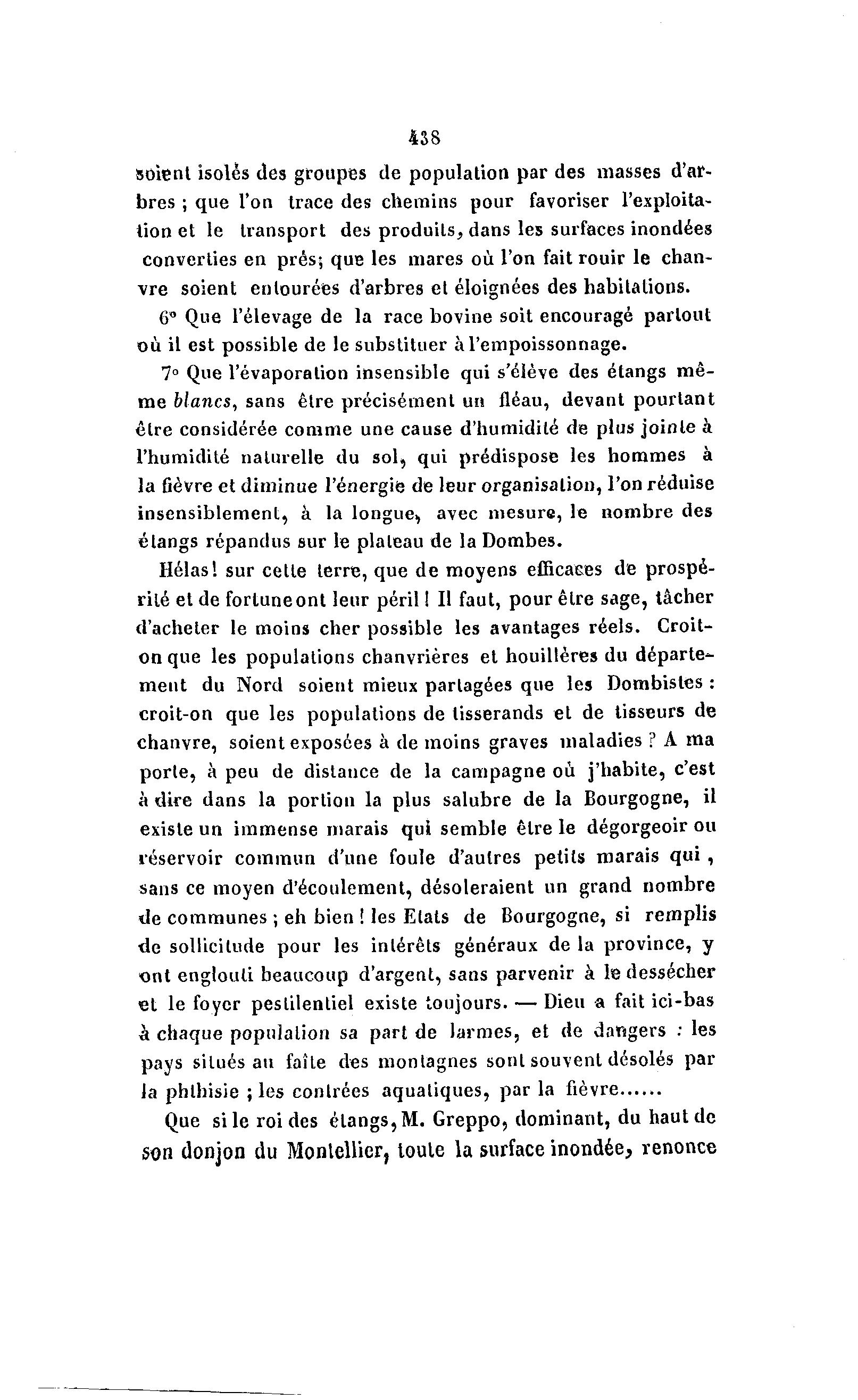 438 soient isoles des groupes de population par des masses d'ar- bres ; que l'on trace des chemins pour favoriser l'exploita- tion et le transport des produits, dans les surfaces inondées converties en prés; que les mares où l'on fait rouir le chan- vre soient entourées d'arbres et éloignées des habitations. 6" Que l'élevage de la race bovine soit encouragé partout où il est possible de le substituer à l'empoissonnage. 7° Que l'évaporation insensible qui s'élève des étangs mê- me blancs, sans être précisément un fléau, devant pourtant être considérée comme une cause d'humidité de plus jointe à l'humidité naturelle du sol, qui prédispose les hommes à la fièvre et diminue l'énergie de leur organisation, l'on réduise insensiblement, à la longue, avec mesure, le nombre des étangs répandus sur le plateau de la Dombes. Hélas! sur cette terre, que de moyens efficaces de prospé- rité et de fortune ont leur péril ! Il faut, pour être sage, tâcher d'acheter le moins cher possible les avantages réels. Croit- on que les populations chanvrières et houillères du départe- ment du Nord soient mieux partagées que les Dombistes : croit-on que les populations de tisserands et de tisseurs de chanvre, soient exposées à de moins graves maladies ? A ma porte, à peu de distance de la campagne où j'habite, c'est à dire dans la portion la plus salubre de la Bourgogne, il existe un immense marais qui semble être le dégorgeoir ou réservoir commun d'une foule d'autres petits marais q u i , sans ce moyen d'écoulement, désoleraient un grand nombre de communes ; eh bien ! les Elats de Bourgogne, si remplis de sollicitude pour les intérêts généraux de la province, y ont englouti beaucoup d'argent, sans parvenir à le dessécher et le foyer pestilentiel existe toujours. — Dieu a fait ici-bas à chaque population sa part de larmes, et de dangers : les pays situés au faîte des montagnes sont souvent désolés par la phlhisie ; les contrées aquatiques, par la fièvre Que si le roi des étangs, M. Greppo, dominant, du haut de son donjon du Monlellier, toute la surface inondée, renonce
