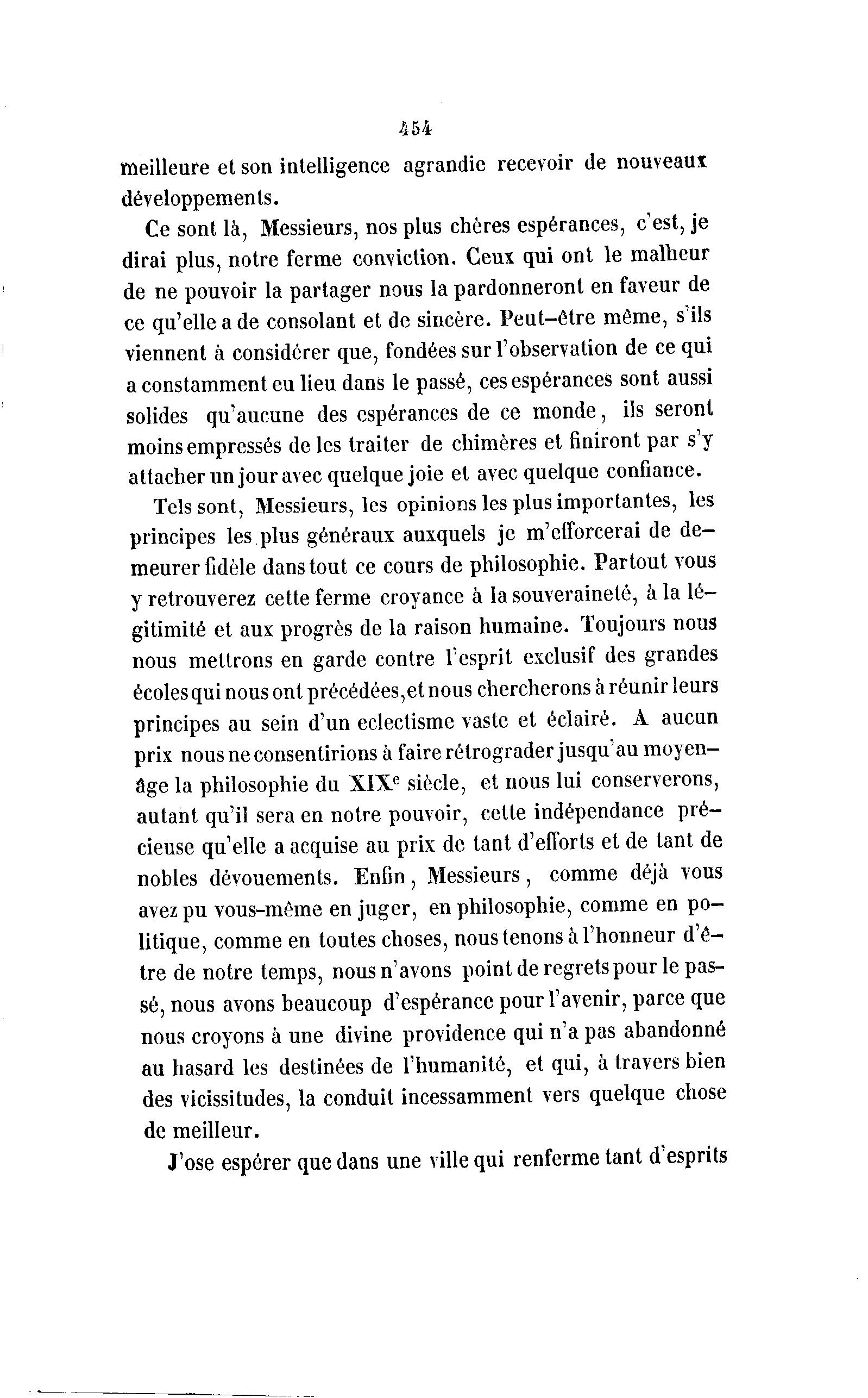 454 meilleure et son intelligence agrandie recevoir de nouveaut développements. Ce sont là , Messieurs, nos plus chères espérances, c'est, je dirai plus, notre ferme conviction. Ceux qui ont le malheur de ne pouvoir la partager nous la pardonneront en faveur de ce qu'elle a de consolant et de sincère. Peut-être même, s'ils viennent à considérer que, fondées sur l'observation de ce qui a constamment eu lieu dans le passé, ces espérances sont aussi solides qu'aucune des espérances de ce monde, ils seront moins empressés de les traiter de chimères et finiront par s'y attacher un jour avec quelque joie et avec quelque confiance. Tels sont, Messieurs, les opinions les plus importantes, les principes les plus généraux auxquels je m'efforcerai de de- meurer fidèle dans tout ce cours de philosophie. Partout vous y retrouverez cette ferme croyance à la souveraineté, à la lé- gitimité et aux progrès de la raison humaine. Toujours nous nous mettrons en garde contre l'esprit exclusif des grandes écoles qui nous ont précédées,et nous chercherons à réunir leurs principes au sein d'un éclectisme vaste et éclairé. À aucun prix nous ne consentirions à faire rétrograder jusqu'au moyen- âge la philosophie du XIXe siècle, et nous lui conserverons, autant qu'il sera en notre pouvoir, cette indépendance pré- cieuse qu'elle a acquise au prix de tant d'efforts et de tant de nobles dévouements. Enfin, Messieurs, comme déjà vous avez pu vous-même en juger, en philosophie, comme en po- litique, comme en toutes choses, nous tenons à l'honneur d'ê- tre de notre temps, nous n'avons point de regrets pour le pas- sé, nous avons beaucoup d'espérance pour l'avenir, parce que nous croyons à une divine providence qui n'a pas abandonné au hasard les destinées de l'humanité, et qui, à travers bien des vicissitudes, la conduit incessamment vers quelque chose de meilleur. J'ose espérer que dans une ville qui renferme tant d'esprits