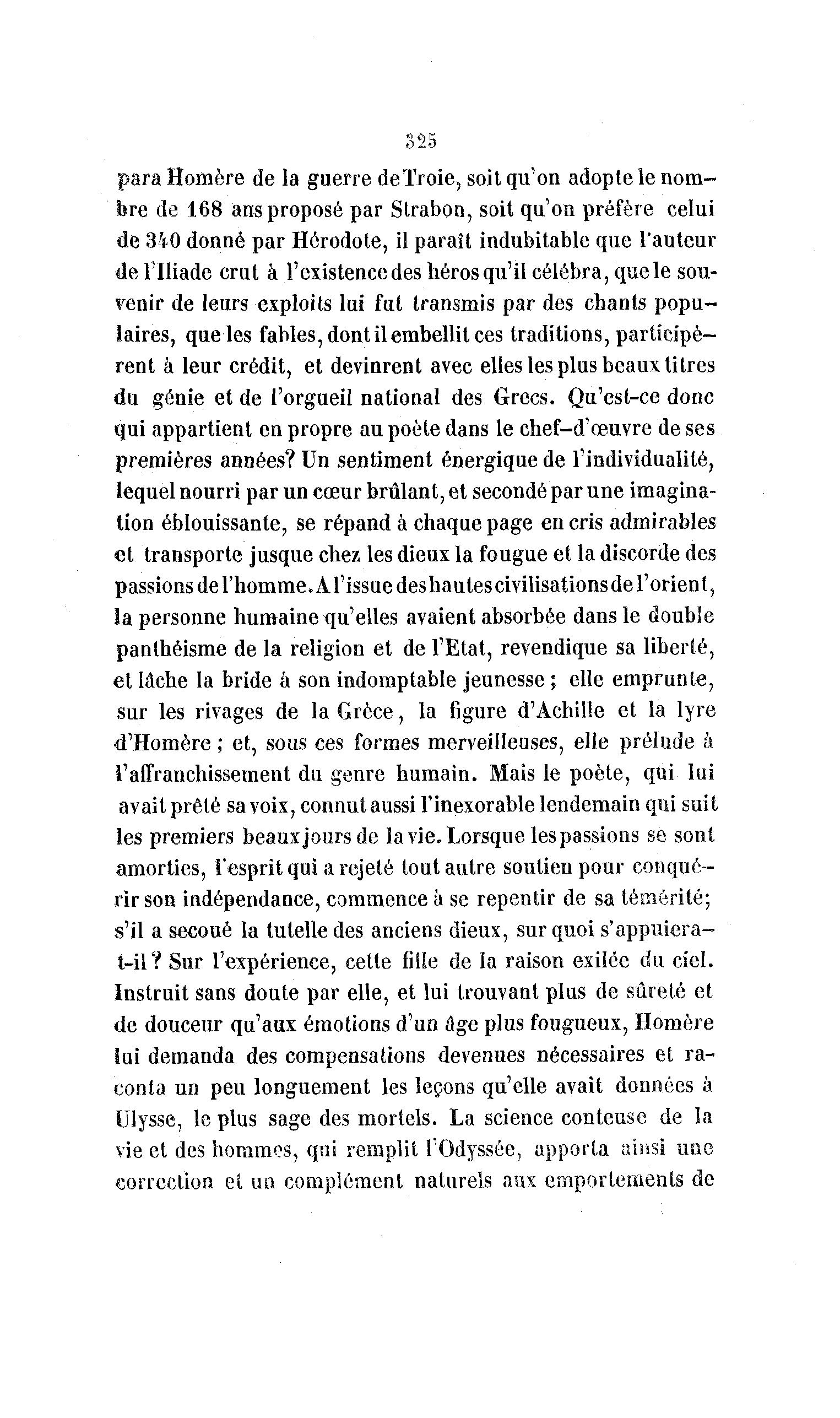 325 para Homère de la guerre de Troie, soit qu'on adopte le nom- bre de 168 ans proposé par Strabon, soit qu'on préfère celui de 340 donné par Hérodote, il paraît indubitable que l'auteur de l'Iliade crut à l'existence des héros qu'il célébra, que le sou- venir de leurs exploits lui fut transmis par des chants popu- laires, que les fables, dont il embellit ces traditions, participè- rent à leur crédit, et devinrent avec elles les plus beaux titres du génie et de l'orgueil national des Grecs. Qu'est-ce donc qui appartient en propre au poète dans le chef-d'œuvre de ses premières années? Un sentiment énergique de l'individualité, lequel nourri par un cœur brûlant, et secondé par une imagina- tion éblouissante, se répand à chaque page en cris admirables et transporte jusque chez les dieux la fougue et la discorde des passions de l'homme.Âl'issuedeshautescivilisationsde l'orient, la personne humaine qu'elles avaient absorbée dans le double panthéisme de la religion et de l'Etat, revendique sa liberté, et lâche la bride à son indomptable jeunesse ; elle emprunte, sur les rivages de la Grèce, la figure d'Achille et la lyre d'Homère ; et, sous ces formes merveilleuses, elle prélude à l'affranchissement du genre humain. Mais le poète, qui lui avait prêté sa voix, connut aussi l'inexorable lendemain qui suit les premiers beaux jours de la vie. Lorsque les passions se sont amorties, î"esprit qui a rejeté tout autre soutien pour conqué- rir son indépendance, commence h se repentir de sa témérité; s'il a secoué la tutelle des anciens dieux, sur quoi s'appuiera- t—il Y Sur l'expérience, cette fille de la raison exilée du ciel. Instruit sans doute par elle, et lui trouvant plus de sûreté et de douceur qu'aux émotions d'un âge plus fougueux, Homère îui demanda des compensations devenues nécessaires et ra- conta un peu longuement les leçons qu'elle avait données à Ulysse, le plus sage des mortels. La science conteuse de la vie et des hommes, qui remplit l'Odyssée, apporta ainsi une correction et un complément naturels aux emportements de