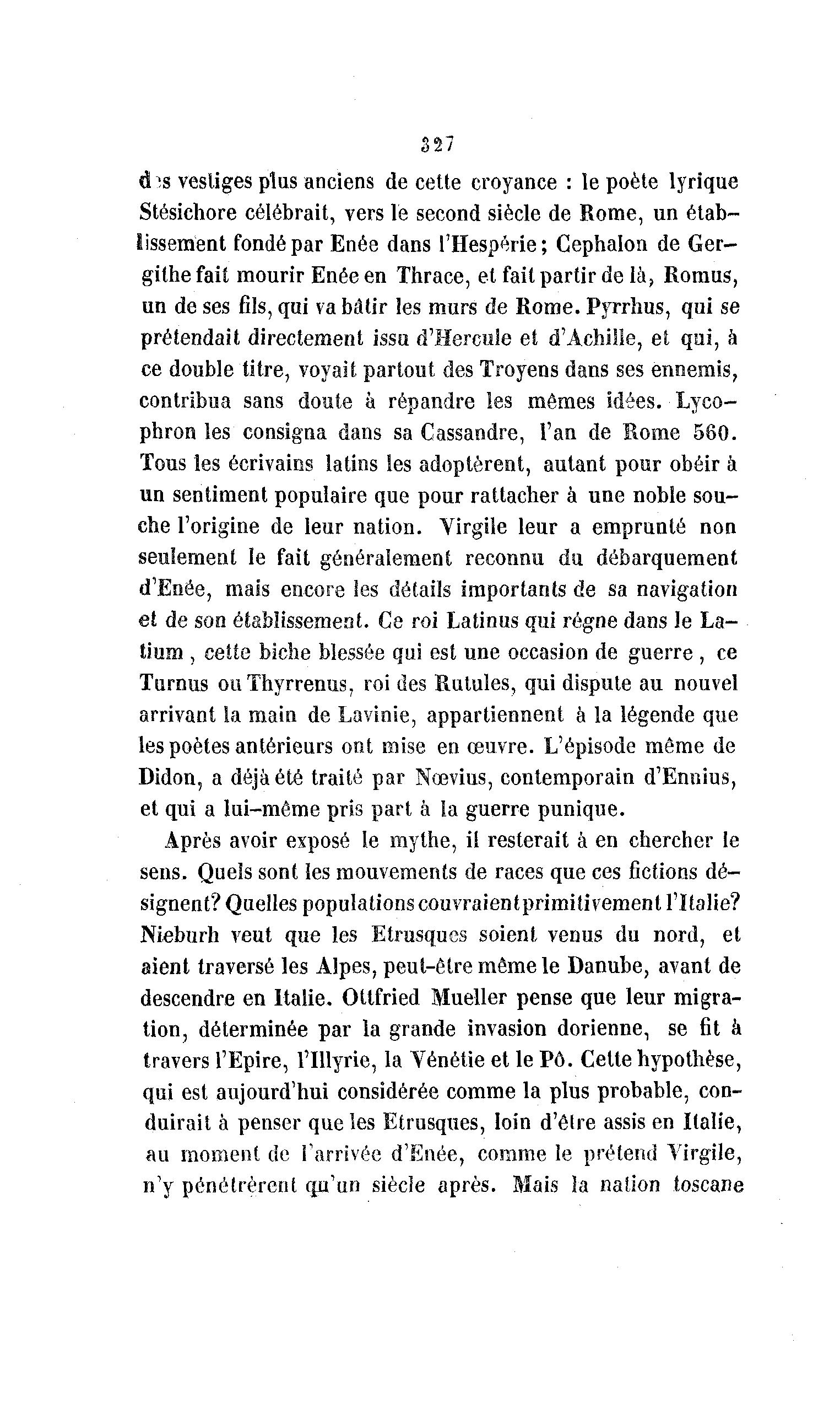 327 «hs vestiges plus anciens de cette croyance : le poète lyrique Stésichore célébrait, vers le second siècle de Rome, un étab- lissement fondé par Enée dans l'Hespérie; Gephalon de Ger- githefait mourir Enée en Thrace, et fait partir de là , Romus, un de ses fils, qui va bâtir les murs de Rome. Pyrrhus, qui se prétendait directement issu d'Hercule et d'Achille, et qui, à ce double titre, voyait partout des Troyens dans ses ennemis, contribua sans doute à répandre les mêmes idées. Lyco- phron les consigna dans sa Cassandre, l'an de Rome 580. Tous les écrivains latins Ses adoptèrent, autant pour obéir à un sentiment populaire que pour rattacher à une noble sou- che l'origine de leur nation. Virgile leur a emprunté non seulement le fait généralement reconnu du débarquement d'Enée, mais encore les détails importants de sa navigation et de son établissement. Ce roi Latinus qui régne dans le La- tium , cette biche blessée qui est une occasion de guerre , ce Turnus ouThyrrenus, roi des Rutules, qui dispute au nouvel arrivant la main de Lavinie, appartiennent à la légende que les poètes antérieurs ont mise en œuvre. L'épisode môme de Didon, a déjà été traité par Nœvius, contemporain d'Ennius, et qui a lui-môme pris part à la guerre punique. Après avoir exposé le mythe, il resterait à en chercher le sens. Quels sont les mouvements de races que ces fictions dé- signent? Quelles populations couvraientprimitivement l'Italie? Nieburh veut que les Etrusques soient venus du nord, et aient traversé les Alpes, peut-être môme le Danube, avant de descendre en Italie. Ottfried Mueller pense que leur migra- tion, déterminée par la grande invasion dorienne, se fit à travers l'Epire, l'Illyrie, la Yénétie et le Pô. Cette hypothèse, qui est aujourd'hui considérée comme la plus probable, con- duirait à penser que les Etrusques, loin d'être assis en Italie, au moment de l'arrivée d'Enée, comme le prétend Virgile, n'y pénétrèrent qu'un siècle après. Mais la nation toscane