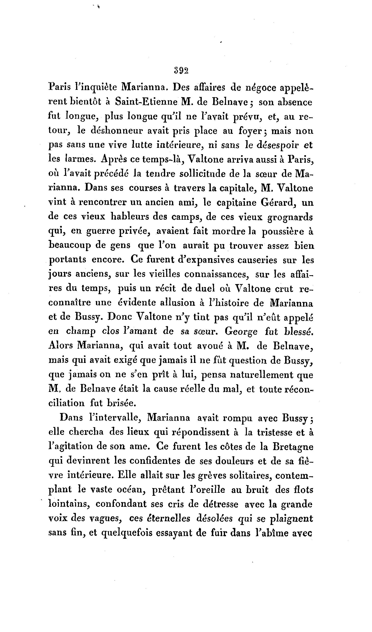 392 Paris l'inquiète Marianna. Des affaires de négoce appelè- rent bientôt à Saint-Etienne M. de Belnave ; son absence fut longue, plus longue qu'il ne l'avait prévu, et, au r e - tour, le déshonneur avait pris place au foyer 5 mais non pas sans une vive lutte intérieure, ni sans le désespoir et les larmes. Après ce temps-là , Valtone arriva aussi à Paris, où l'avait précédé la tendre sollicitude de la sœur de Ma- rianna. Dans ses courses à travers la capitale, M. Valtone vint à rencontrer un ancien ami, le capitaine Gérardj un de ces vieux hâbleurs des camps, de ces vieux grognards qui, en guerre privée, avaient fait mordre la poussière à beaucoup de gens que l'on aurait pu trouver assez bien portants encore. Ce furent d'expansives causeries sur les jours anciens, sur les vieilles connaissances, sur les affai- res du temps, puis un récit de duel où Valtone crut re- connaître une évidente allusion à l'histoire de Marianna et de Bussy. Donc Valtone n'y tint pas qu'il n'eût appelé en champ clos l'amant de sa sœur. George fut blessé. Alors Marianna, qui avait tout avoué à M. de Belnave, mais qui avait exigé que jamais il ne fut question de Bussy, que jamais on ne s'en prît à lui, pensa naturellement que M, de Belnave était la cause réelle du mal, et toute récon- ciliation fut brisée. Dans l'intervalle, Marianna avait rompu avec Bussy ; elle chercha des lieux qui répondissent à la tristesse et à l'agitation de son ame. Ce furent les côtes de la Bretagne qui devinrent les confidentes de ses douleurs et de sa fiè- vre intérieure. Elle allait sur les grèves solitaires, contem- plant le vaste océan, prêtant l'oreille au bruit des flots lointains, confondant ses cris de détresse avec la grande voix des vagues, ces éternelles désolées qui se plaignent sans fin, et quelquefois essayant de fuir dans l'abîme avec