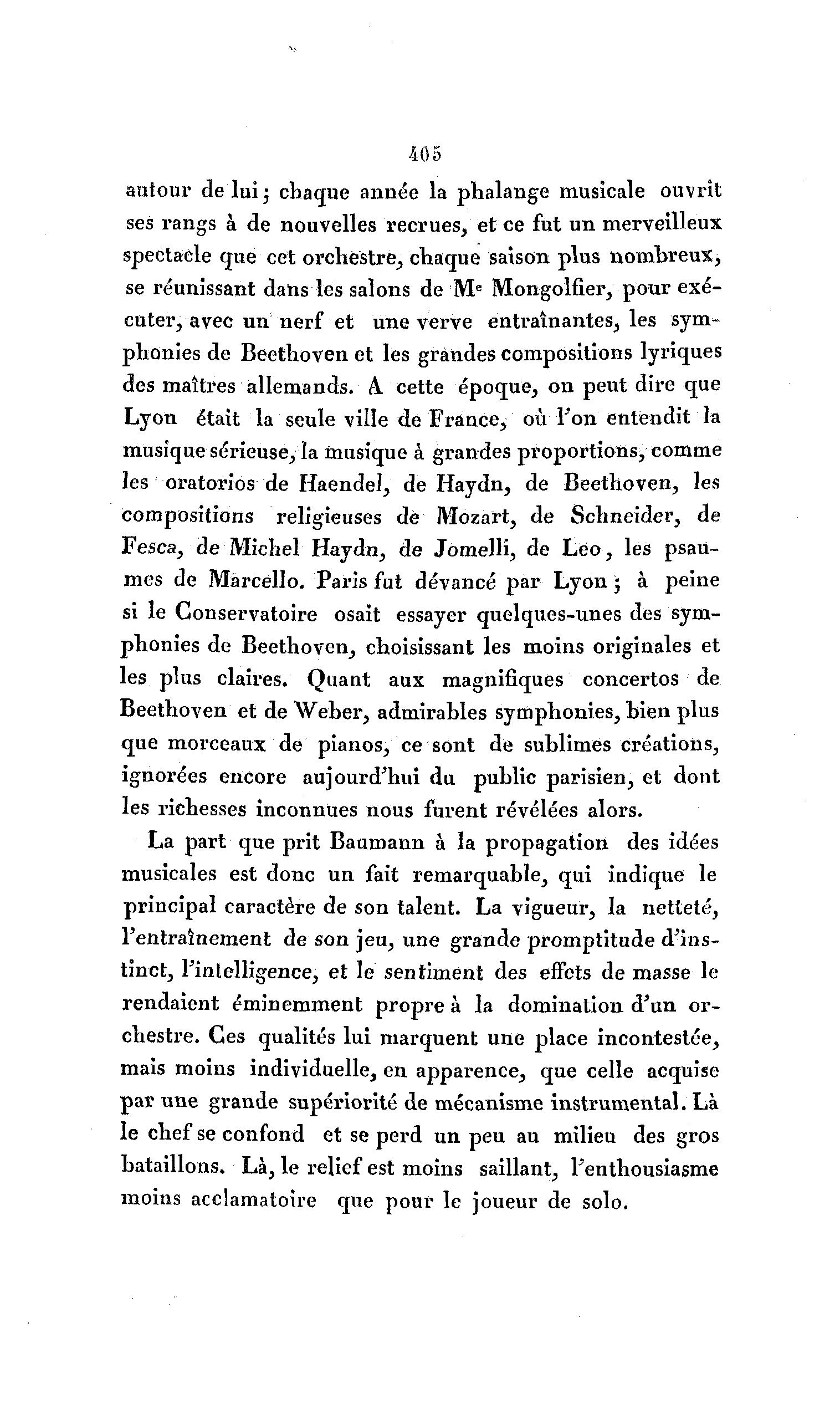 405 autour de lui- chaque année la phalange musicale ouvrit ses rangs à de nouvelles recrues, et ce fut un merveilleux spectacle que cet orchestre, chaque saison plus nombreux, se réunissant dans les salons de M e Mongolfier, pour exé- cuter, avec un nerf et une verve entraînantes, les sym- phonies de Beethoven et les grandes compositions lyriques des maîtres allemands. A. cette époque, on peut dire que Lyon était la seule ville de France, où l'on entendit la musique sérieuse, la musique à grandes proportions, comme les oratorios de Haendel, de Haydn, de Beethoven, les compositions religieuses de Mozart, de Schneider, de Fesca, de Michel Haydn, de JomelH, de L é o , les psau- mes de Marcello. Paris fut devancé par Lyon ; à peine si le Conservatoire osait essayer quelques-unes des sym- phonies de Beethoven, choisissant les moins originales et les plus claires. Quant aux magnifiques concertos de Beethoven et de Weber, admirables symphonies, bien plus que morceaux de pianos, ce sont de sublimes créations, ignorées encore aujourd'hui du public parisien, et dont les richesses inconnues nous furent révélées alors. La part que prit Baumann à la propagation des idées musicales est donc un fait remarquable, qui indique le principal caractère de son talent. La vigueur, la netteté, l'entraînement de son jeu, une grande promptitude d'ins- tinct, l'intelligence, et le sentiment des effets de masse le rendaient éminemment propre à la domination d'un or- chestre. Ces qualités lui marquent une place incontestée, mais moins individuelle, en apparence, que celle acquise par une grande supériorité de mécanisme instrumental. Là le chef se confond et se perd un peu au milieu des gros bataillons. Là , le relief est moins saillant, l'enthousiasme moins accîamatoire que pour le joueur de solo.