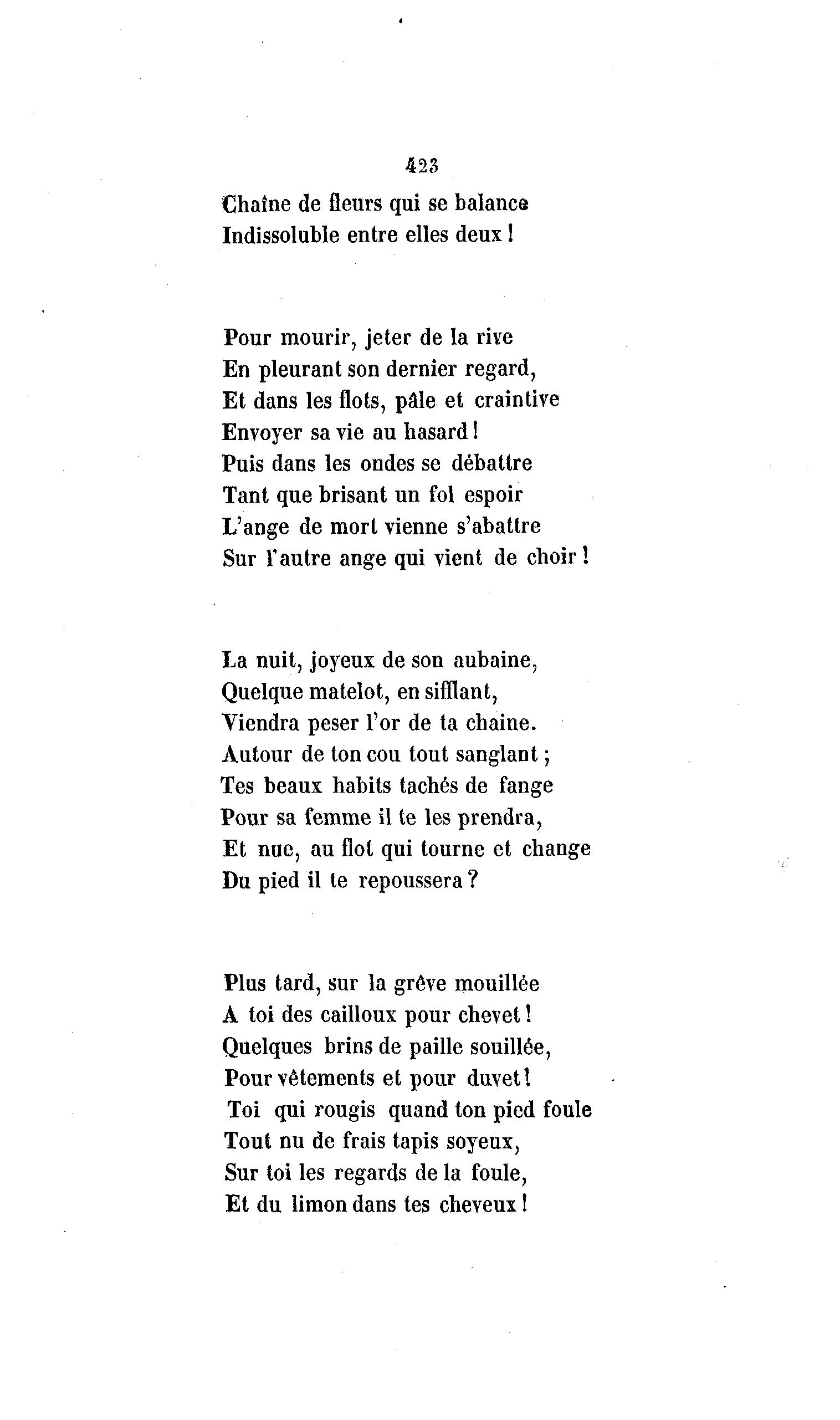 423 Chaîne de fleurs qui se balance Indissoluble entre elles deux I Pour mourir, jeter de la rive En pleurant son dernier regard, Et dans les flots, pâle et craintive Envoyer sa vie au hasard ! Puis dans les ondes se débattre Tant que brisant un fol espoir L'ange de mort vienne s'abattre Sur l'autre ange qui vient de choir ! La nuit, joyeux de son aubaine, Quelque matelot, en sifflant, Viendra peser l'or de ta chaîne. Autour de ton cou tout sanglant ; Tes beaux habits tachés de fange Pour sa femme il te les prendra, Et nue, au flot qui tourne et change Du pied il te repoussera ? Plus tard, sur la grève mouillée A toi des cailloux pour chevet ! Quelques brins de paille souillée, Pour vêtements et pour duvet l Toi qui rougis quand ton pied foule Tout nu de frais tapis soyeux, Sur toi les regards de la foule, Et du limon dans tes cheveux !