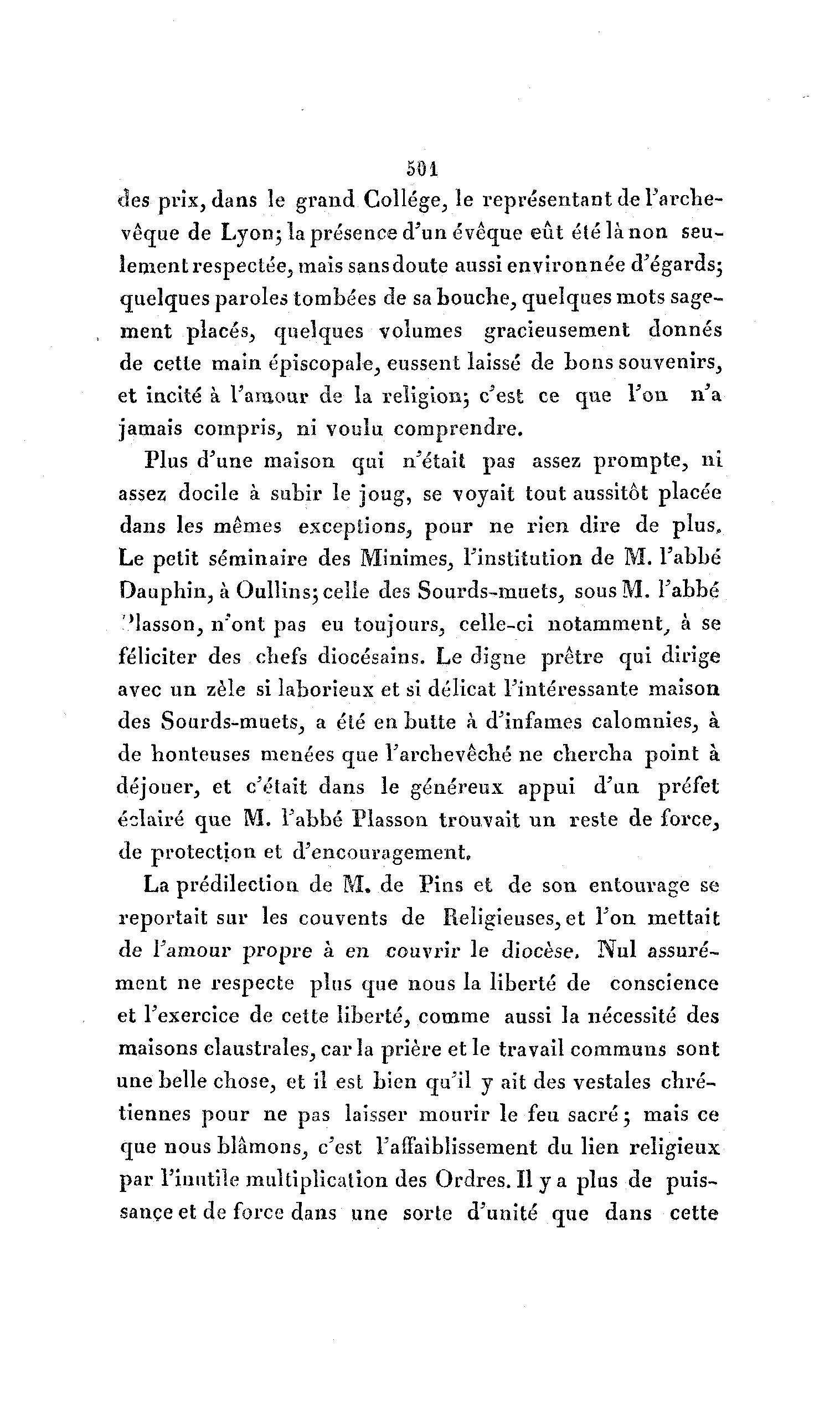 501 des prix, dans le grand Collège, le représentant de l'arche- vêque de Lyon; la présence d'un évêque eût été là non seu- lement respectée, mais sans doute aussi environnée d'égards; quelques paroles tombées de sa bouche, quelques mots sage- ment placés, quelques volumes gracieusement donnés de cette main épiscopale, eussent laissé de bons souvenirs, et incité à l'amour de la religion; c'est ce que l'on n'a jamais compris, ni voulu comprendre. Plus d'une maison qui n'était, pas assez prompte, ni assez docile à subir le joug, se voyait tout aussitôt placée dans les mêmes exceptions, pour ne rien dire de plus. Le petit séminaire des Minimes, l'institution de M. l'abbé Dauphin, à Oullins; celle des Sourds-muets, sous M. l'abbé 'lasson, n'ont pas eu toujours, celle-ci notamment, à se féliciter des chefs diocésains. Le digne prêtre qui dirige avec un zèle si laborieux et si délicat l'intéressante maison des Sourds-muets, a été en butte à d'infâmes calomnies, à de honteuses menées que l'archevêché ne chercha point à déjouer, et c'était dans le généreux appui d'un préfet éclairé que M. l'abbé Plasson trouvait un reste de force, de protection et d'encouragement, La prédilection de M. de Pins et de son entourage se reportait sur les couvents de Religieuses, et l'on mettait de l'amour propre à en couvrir le diocèse. Nul assuré- ment ne respecte plus que nous la liberté de conscience et l'exercice de cette liberté, comme aussi la nécessité des maisons claustrales, car la prière et le travail communs sont une belle chose, et il est bien qu'il y ait des vestales chré- tiennes pour ne pas laisser mourir le feu sacré; mais ce que nous blâmons, c'est l'affaiblissement du lien religieux par l'inutile multiplication des Ordres. Il y a plus de puis- sance et de force dans une sorte d'unité que dans cette