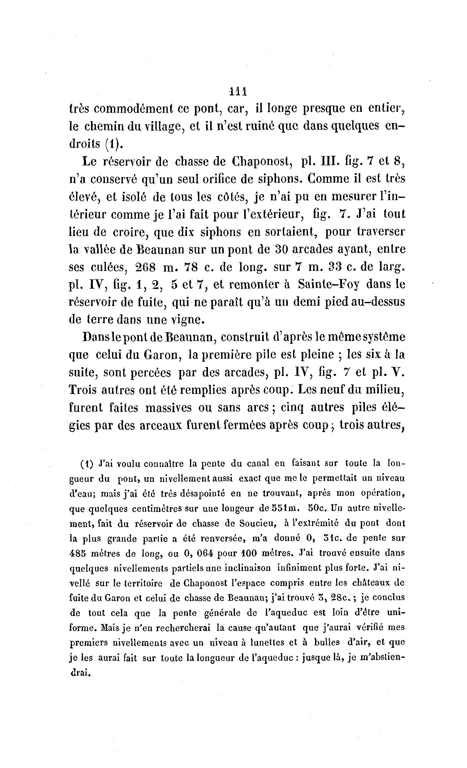 ill très commodément ce pont, car, il longe presque en entier, le chemin du village, et il n'est ruiné que dans quelques en- droits (1). Le réservoir de chasse de Chaponost, pi. III. fig. 7 et 8, n'a conservé qu'un seul orifice de siphons. Comme il est très élevé, et isolé de tous les côtés, je n'ai pu en mesurer l'in- térieur comme je l'ai fait pour l'extérieur, fig. 7. J'ai tout lieu de croire, que dix siphons en sortaient, pour traverser la vallée de Beaunan sur un pont de 30 arcades ayant, entre ses culées, 268 m. 78 c. de long, sur 7 m. 33 c. de larg. pi. IV, fig. 1, 2, 5 et 7, et remonter à Sainte-Foy dans le réservoir de fuite, qui ne paraît qu'à un demi pied au-dessus de terre dans une vigne. Dans le pont de Beaunan, construit d'après le même système que celui du Garon, la première pile est pleine ; les six à la suite, sont percées par des arcades, pi. IV, fig. 7 et pi. V. Trois autres ont été remplies après coup. Les neuf du milieu, furent faites massives ou sans arcs ; cinq autres piles élé- gies par des arceaux furent fermées après coup ; trois autres, (1) J'ai voulu connaître la pente du canal en faisant sur toute la lon- gueur du pont, un nivellement aussi exact que mêle permettait un niveau d'eau; mais j'ai été très désapoinlé en ne trouvant, après mon opération, que quelques centimètres sur une longeur de5Slm. 50c. Un autre nivelle- ment, fait du réservoir de chasse de Soucieu, à l'extrémité du pont dont la plus grande partie a été renversée, m'a donné 0, 31c. de pente sur 483 mètres de long, ou 0, 064 pour 100 mètres. J'ai trouvé ensuite dans quelques nivellements partiels une inclinaison infiniment plus forte. J'ai ni- velle sur le territoire de Chaponost l'espace compris entre les châteaux de fuite du Garon et celui de chasse de Beaunan; j'ai trouvé 3, 28c. ; je conclus de tout cela que la pente générale de l'aqueduc est loin d'être uni- forme. Mais je n'en rechercherai la cause qu'autant que j'aurai vérifié mes premiers nivellements avec un niveau à lunettes et à bulles d'air, et que je les aurai fait sur toute la longueur de l'aqueduc : jusque là , je m'abstien- drai.