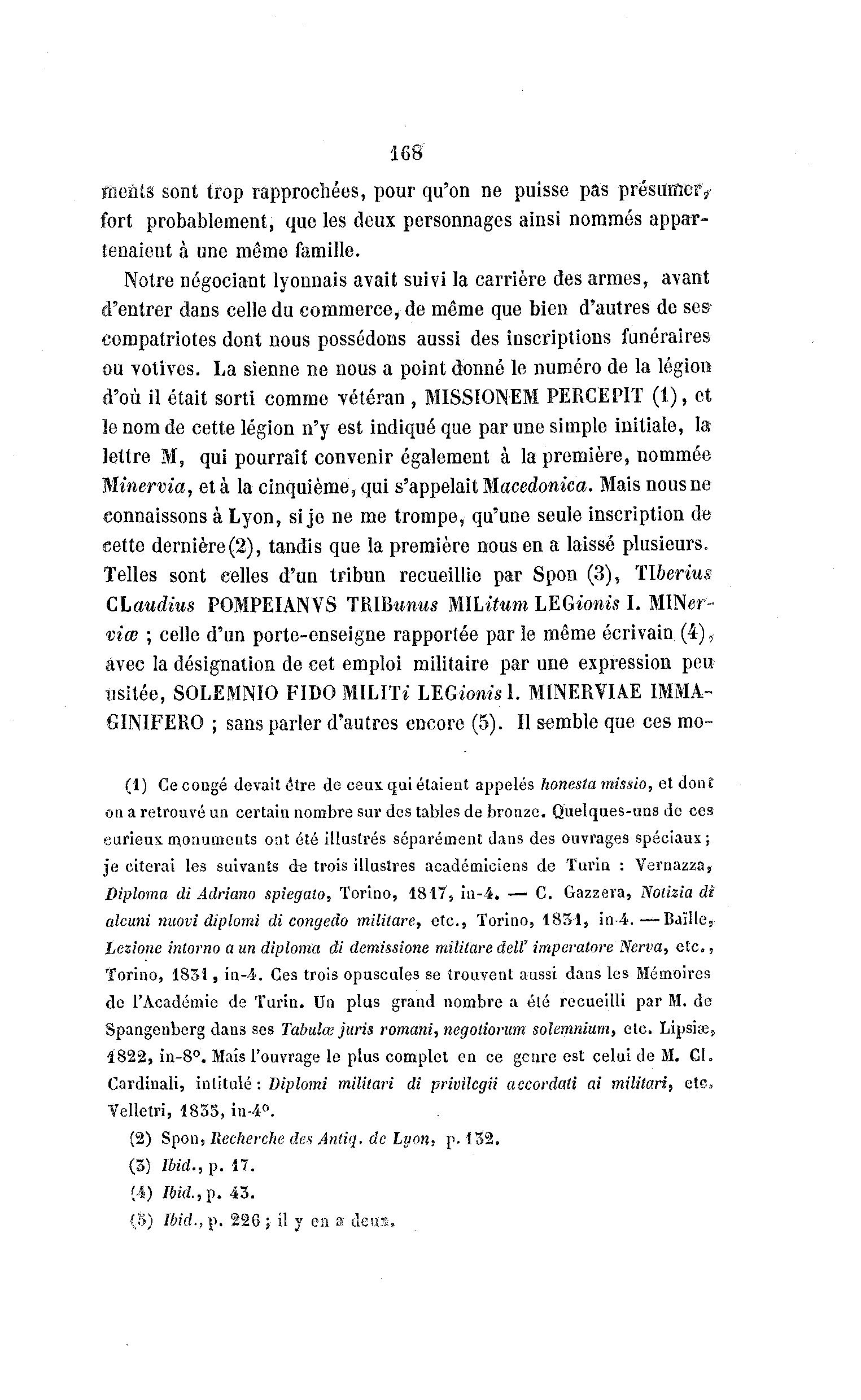 168 meùls sont trop rapprochées, pour qu'on ne puisse pas présumer» fort probablement, que les deux personnages ainsi nommés appar- tenaient à une même famille. Notre négociant lyonnais avait suivi la carrière des armes, avant d'entrer dans celle du commerce, de même que bien d'autres de ses compatriotes dont nous possédons aussi des inscriptions funéraires ou votives. La sienne ne nous a point donné le numéro de la légion d'où il était sorti comme vétéran , MISSIONEM PERCEPIT (1), et le nom de cette légion n'y est indiqué que par une simple initiale, la lettre M, qui pourrait convenir également à la première, nommée Minervia, et à la cinquième, qui s'appelait Macedonica. Mais nous ne connaissons à Lyon, si je ne me trompe, qu'une seule inscription de cette dernière(2), tandis que la première nous en a laissé plusieurs. Telles sont celles d'un tribun recueillie par Spon (3), Tlberius CLaudius POMPEIANVS TMBunus MlLitum LEGioms I. MINer- mœ ; celle d'un porte-enseigne rapportée par le même écrivain (4), avec la désignation de cet emploi militaire par une expression peu usitée, SOLEMNIO FIDO MILITi LEGMMMSI. MINERVIAE IMMA- GINIFERO ; sans parler d'autres encore (5). Il semble que ces mo- (1) Ce congé devait être de ceux qui étaient appelés honesla missio, et dont on a retrouvé un certain nombre sur des tables de bronze. Quelques-uns de ces curieux monuments ont été illustrés séparément dans des ouvrages spéciaux; je citerai les suivants de trois illustres académiciens de Turin : Vernazza, Diploma di Adriano spiegato, Torino, 1817, in-4. — C. Gazzera, Notizia dî alcuni nuovi diplomi di congedo militare, etc., Torino, 1851, in-4.—Baille, hezione intorno a un diploma di demissione militare delt imperatore Nerva, etc., Torino, 1831, in-4. Ces trois opuscules se trouvent aussi dans les Mémoires de l'Académie de Turin. Un plus grand nombre a été recueilli par M. de Spangenberg dans ses Tabula: juris romani, negotiorum solemnium, etc. Lipsiœ, 1822, in-8°. Maïs l'ouvrage le plus complet en ce genre est celui de M. CI. Cardinali, intitulé : Diplomi militari di privilcgii accordait ai militari, cte. Velletri, 1835, in-4°. (2) Spon, Recherche des Antiq. de Lyon, p. 132, (3) Ibid., p. 17. (4) Ibid., p. 43. (5) Ibid., p. 226 ; il y en a dous.