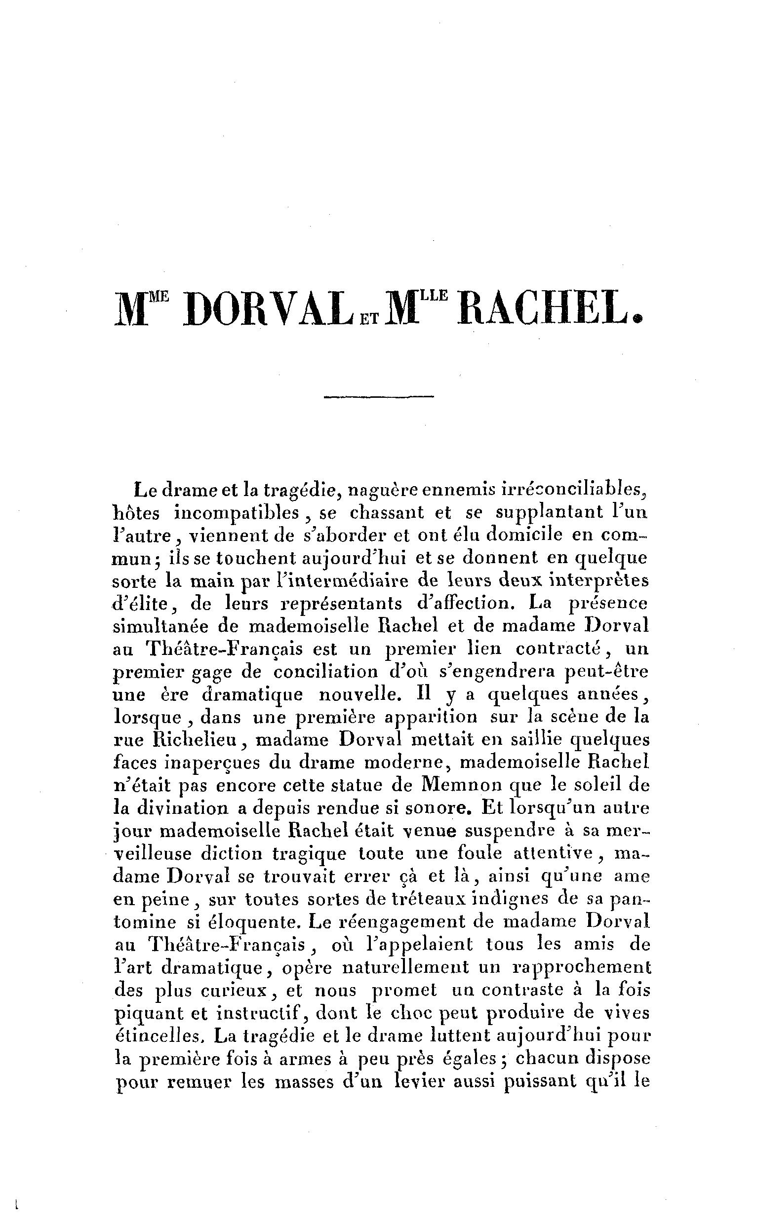 M" DORVAL „ B T R ACHEL. Le drame et la tragédie, naguère ennemis irréconciliables, liôtes incompatibles , se chassant et se supplantant l'un l'autre, viennent de s'aborder et ont élu domicile en com- mun 5 ils se touchent aujourd'hui et se donnent en quelque sorte la main par l'intermédiaire de leurs deux interprètes d'élite, de leurs représentants d'affection. La présence simultanée de mademoiselle Rachel et de madame Dorval au Théâtre-Français est un premier lien contracté, un premier gage de conciliation d'où s'engendrera peut-être une ère dramatique nouvelle. Il y a quelques années, lorsque , dans une première apparition sur la scène de la rue Richelieu, madame Dorval mettait en saillie quelques faces inaperçues du drame moderne, mademoiselle Rachel n'était pas encore cette statue de Memnon que le soleil de la divination a depuis rendue si sonore. Et lorsqu'un autre jour mademoiselle Rachel était venue suspendre à sa mer- veilleuse diction tragique toute une foule attentive , ma- dame Dorval se trouvait errer çà et là , ainsi qu'une ame en peine, sur toutes sortes de tréteaux indignes de sa pan- tomine si éloquente. Le réengagement de madame Dorval au Théâtre-Français, où l'appelaient tous les amis de l'art dramatique, opère naturellemeut un rapprochement des plus curieux, et nous promet un contraste à la fois piquant et instructif, dont le choc peut produire de vives étincelles, La tragédie et le drame luttent aujourd'hui pour la première fois à armes à peu près égales; chacun dispose pour remuer les masses d'un levier aussi puissant qu'il le