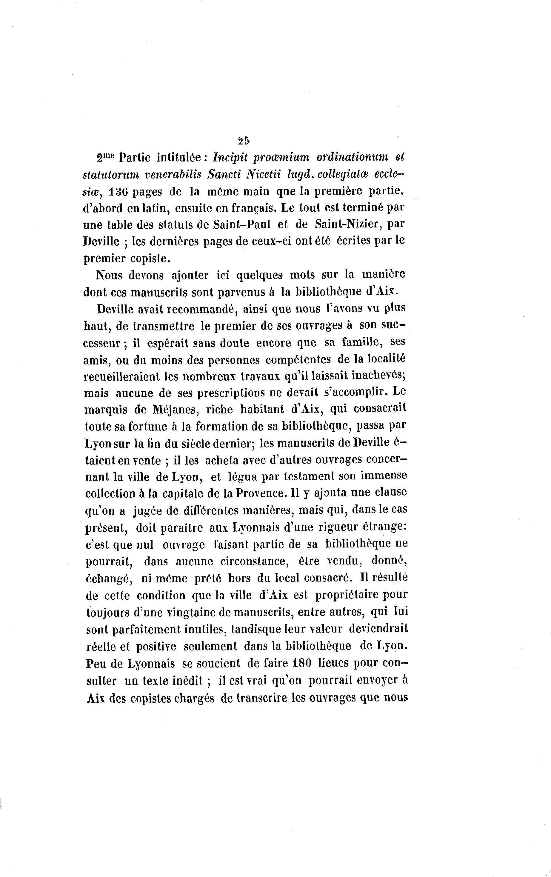 1$ 2me Partie intitulée : Incipit proœmium ordinationum et statutorum venerabilis Sancti Nicetii lugd. collegiatœ eccle— sice, 136 pages de la même main que la première partie, d'abord en latin, ensuite en français. Le tout est terminé par une table des statuts de Saint-Paul et de Saint-Nizier, par Deville ; les dernières pages de ceux-ci ont été écrites par le premier copiste. Nous devons ajouter ici quelques mots sur la manière dont ces manuscrits sont parvenus à la bibliothèque d'Aix. Deville avait recommandé, ainsi que nous l'avons vu plus haut, de transmettre le premier de ses ouvrages à son suc- cesseur -, il espérait sans doule encore que sa famille, ses amis, ou du moins des personnes compétentes de la localité recueilleraient les nombreux travaux qu'il laissait inachevés; mais aucune de ses prescriptions ne devait s'accomplir. Le marquis de Méjanes, riche habitant d'Aix, qui consacrait toute sa fortune à la formation de sa bibliothèque, passa par Lyon sur la fin du siècle dernier; les manuscrits de Deville è- taient en vente ; il les acheta avec d'autres ouvrages concer- nant la ville de Lyon, et légua par testament son immense collection à la capitale de la Provence. Il y ajouta une clause qu'on a jugée de différentes manières, mais qui, dans le cas présent, doit paraître aux Lyonnais d'une rigueur étrange: c'est que nul ouvrage faisant partie de sa bibliothèque ne pourrait, dans aucune circonstance, être vendu, donné, échangé, ni même prêté hors du local consacré. Il résulté de celte condition que la ville d'Aix est propriétaire pour toujours d'une vingtaine de manuscrits, entre autres, qui lui sont parfaitement inutiles, tandisque leur valeur deviendrait réelle et positive seulement dans la bibliothèque de Lyon. Peu de Lyonnais se soucient de faire 180 lieues pour con- sulter un texte inédit ; il est vrai qu'on pourrait envoyer à Aix des copistes chargés de transcrire les ouvrages que nous