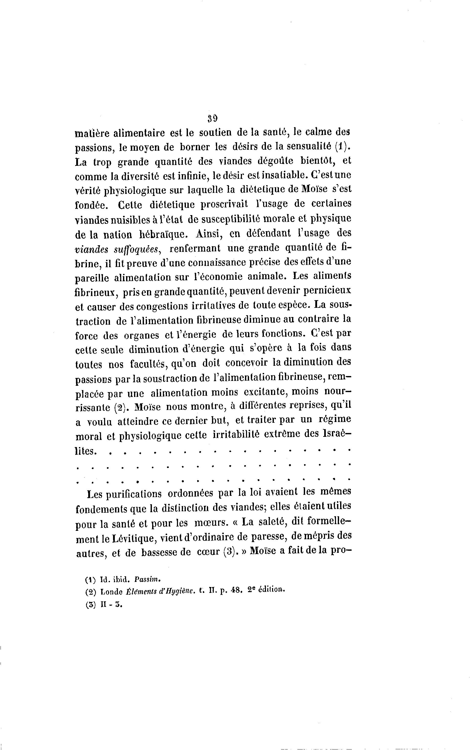 39 matière alimentaire est le soutien de la santé, le calme des passions, le moyen de borner les désirs de la sensualité (1). La trop grande quantité des viandes dégoûte bientôt, et comme la diversité est infinie, le désir est insatiable. C'est une vérité physiologique sur laquelle la diététique de Moïse s'est fondée. Celte diététique proscrivait l'usage de certaines viandes nuisibles à l'état de susceptibilité morale et physique de la nation hébraïque. Ainsi, en défendant l'usage des viandes suffoquées, renfermant une grande quantité de fi- brine, il fit preuve d'une connaissance précise des effets d'une pareille alimentation sur l'économie animale. Les aliments fibrineux, pris en grande quantité, peuvent devenir pernicieux et causer des congestions irritatives de toute espèce. La sous- traction de l'alimentation fibrineuse diminue au contraire la force des organes et l'énergie de leurs fonctions. C'est par cette seule diminution d'énergie qui s'opère à la fois dans toutes nos facultés, qu'on doit concevoir la diminution des passiocs par la soustraction de l'alimentation fibrineuse, rem- placée par une alimentation moins excitante, moins nour- rissante (2). Moïse nous montre, à différentes reprises, qu'il a voulu atteindre ce dernier but, et traiter par un régime moral et physiologique cette irritabilité extrême des Israé- lites Les purifications ordonnées par la loi avaient les mêmes fondements que la distinction des viandes; elles étaient utiles pour la santé et pour les mœurs. « La saleté, dit formelle- ment leLévilique, vient d'ordinaire de paresse, de mépris des autres, et de bassesse de cœur (3). » Moïse a fait de la pro- (1) Id. ibid. Passim. (2) Londe Éléments d'Hygiène, t. II. p. 48. 2 e édition. (3) II - 3.