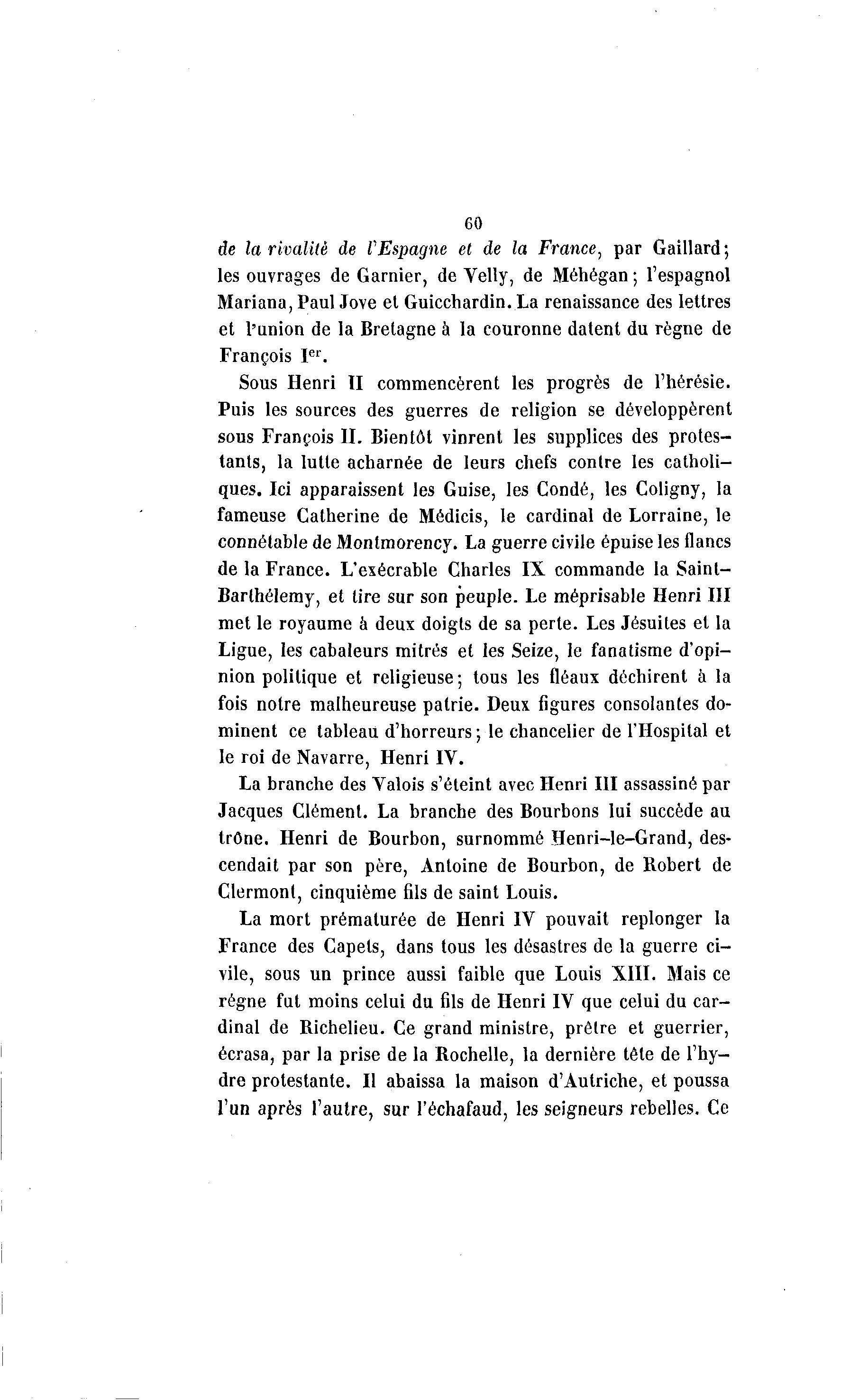 60 de la rivalité de VEspagne et de la France, par Gaillard; les ouvrages de Garnier, de Yelly, de Méhégan ; l'espagnol Mariana,Paul Jove et Guicchardin. La renaissance des lettres et l'union de la Bretagne à la couronne datent du règne de François I er . Sous Henri II commencèrent les progrès de l'hérésie. Puis les sources des guerres de religion se développèrent sous François II. Bientôt vinrent les supplices des protes- tants, la lutte acharnée de leurs chefs contre les catholi- ques. Ici apparaissent les Guise, les Condé, les Coligny, la fameuse Catherine de Médicis, le cardinal de Lorraine, le connétable de Montmorency. La guerre civile épuise les flancs de la France. L'exécrable Charles IX commande la Saint- Barlhélemy, et tire sur son peuple. Le méprisable Henri III met le royaume à deux doigts de sa perte. Les Jésuites et la Ligue, les cabaleurs mitres et les Seize, le fanatisme d'opi- nion politique et religieuse; tous les fléaux déchirent à la fois notre malheureuse patrie. Deux figures consolantes do- minent ce tableau d'horreurs ; le chancelier de l'Hospital et le roi de Navarre, Henri IV. La branche des Valois s'éteint avec Henri III assassiné par Jacques Clément. La branche des Bourbons lui succède au trône. Henri de Bourbon, surnommé Henri-le-Grand, des- cendait par son père, Antoine de Bourbon, de Robert de Clermont, cinquième fils de saint Louis. La mort prématurée de Henri IV pouvait replonger la France des Capets, dans tous les désastres de la guerre ci- vile, sous un prince aussi faible que Louis XIII. Mais ce régne fut moins celui du fils de Henri IV que celui du car- dinal de Richelieu. Ce grand ministre, prêtre et guerrier, écrasa, par la prise de la Rochelle, la dernière tête de l'hy- dre protestante. Il abaissa la maison d'Autriche, et poussa l'un après l'autre, sur l'échafaud, les seigneurs rebelles. Ce