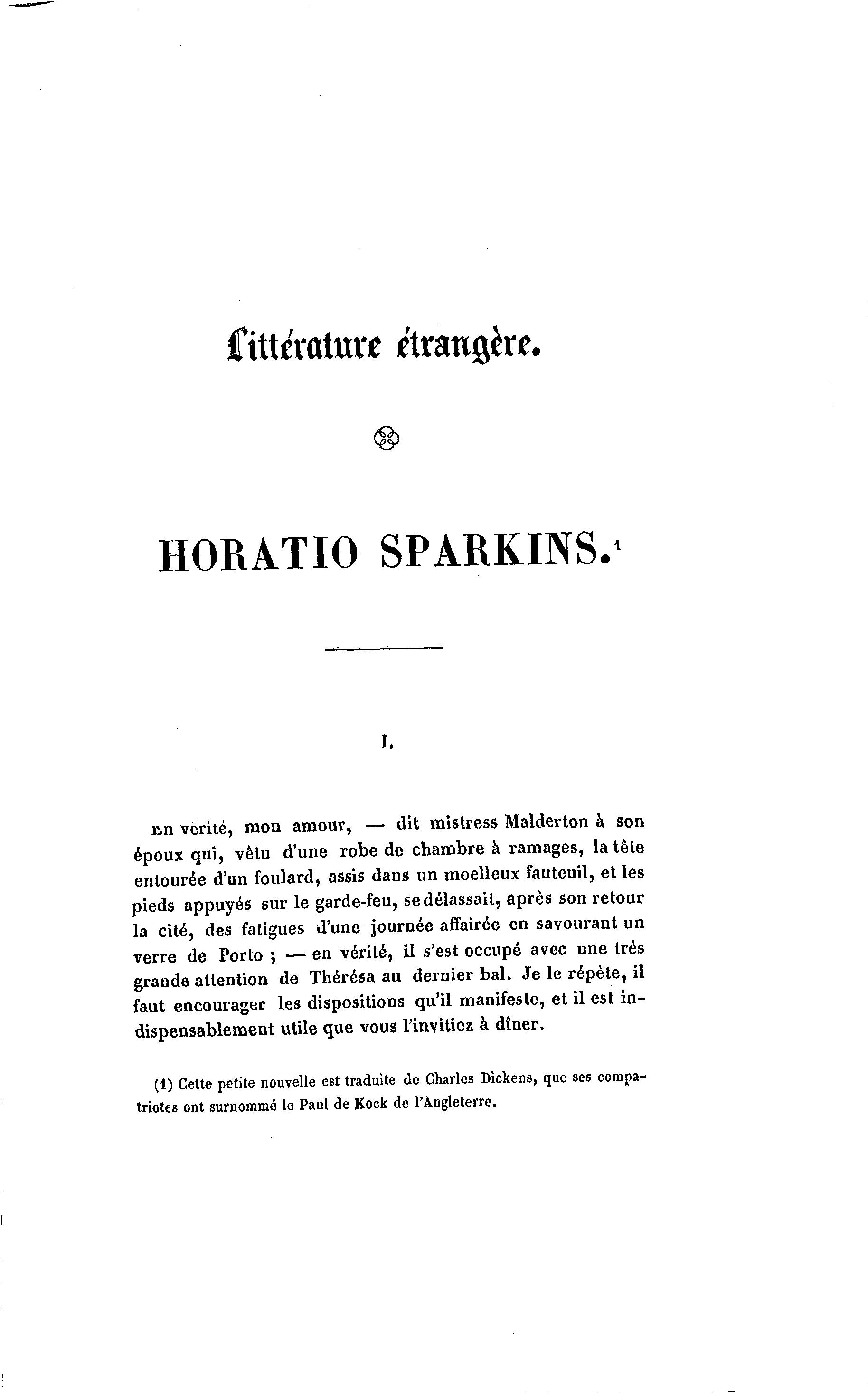 (t) Cette petite nouvelle est traduite de Charles Dickens, que ses compa-