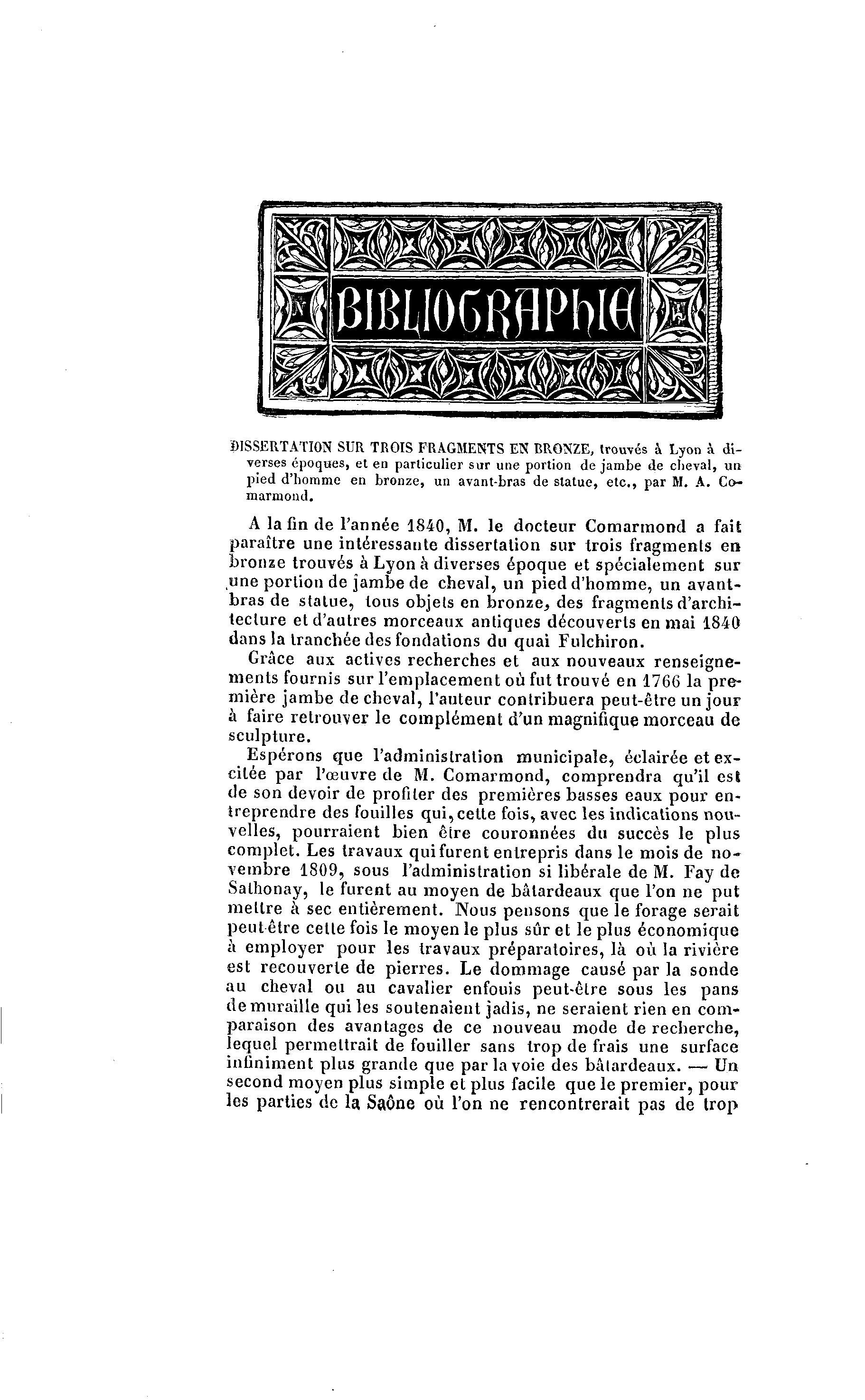 DISSERTATION SUR TROIS FRAGMENTS EN RRONZE, trouvés à Lyon à di- verses époques, et en particulier sur une portion de jambe de cheval, un pied d'homme en bronze, un avant-bras de statue, etc., par M. A. Co~ marmond. A la fin de l'année 1840, M. le docteur Comarmond a fait paraître une intéressante dissertation sur trois fragments en bronze trouvés à Lyon à diverses époque et spécialement sur une portion de jambe de cheval, un pied d'homme, un avant- bras de statue, tous objets en bronze,, des fragments d'archi- tecture et d'autres morceaux antiques découverts en mai 1840 dans la tranchée des fondations du quai Fulchiron. Grâce aux actives recherches et aux nouveaux renseigne- ments fournis sur l'emplacement où fut trouvé en 1766 la pre- mière jambe de cheval, l'auteur contribuera peut-être un jour à faire retrouver le complément d'un magnifique morceau de sculpture. Espérons que l'administration municipale, éclairée et ex- citée par l'œuvre de M. Comarmond, comprendra qu'il est de son devoir de profiler des premières basses eaux pour en- treprendre des fouilles qui, celte fois, avec les indications nou- velles, pourraient bien êire couronnées du succès le plus complet. Les travaux qui furent entrepris dans le mois de n o - vembre 1809, sous l'administration si libérale de M. Fay de Salhonay, le furent au moyen de bâtardeaux que l'on ne put mellre à sec entièrement. Nous pensons que le forage serait peut être cetle fois le moyen le plus sûr et le plus économique à employer pour les travaux préparatoires, là où la rivière est recouverte de pierres. Le dommage causé par la sonde au cheval ou au cavalier enfouis peut-êlre sous les pans de muraille qui les soutenaient jadis, ne seraient rien en com- paraison des avantages de ce nouveau mode de recherche, lequel permettrait de fouiller sans trop de frais une surface infiniment plus grande que par la voie des bâlardeaux. — Un second moyen plus simple et plus facile que le premier, pour les parties de la Saône où l'on ne rencontrerait pas de trop