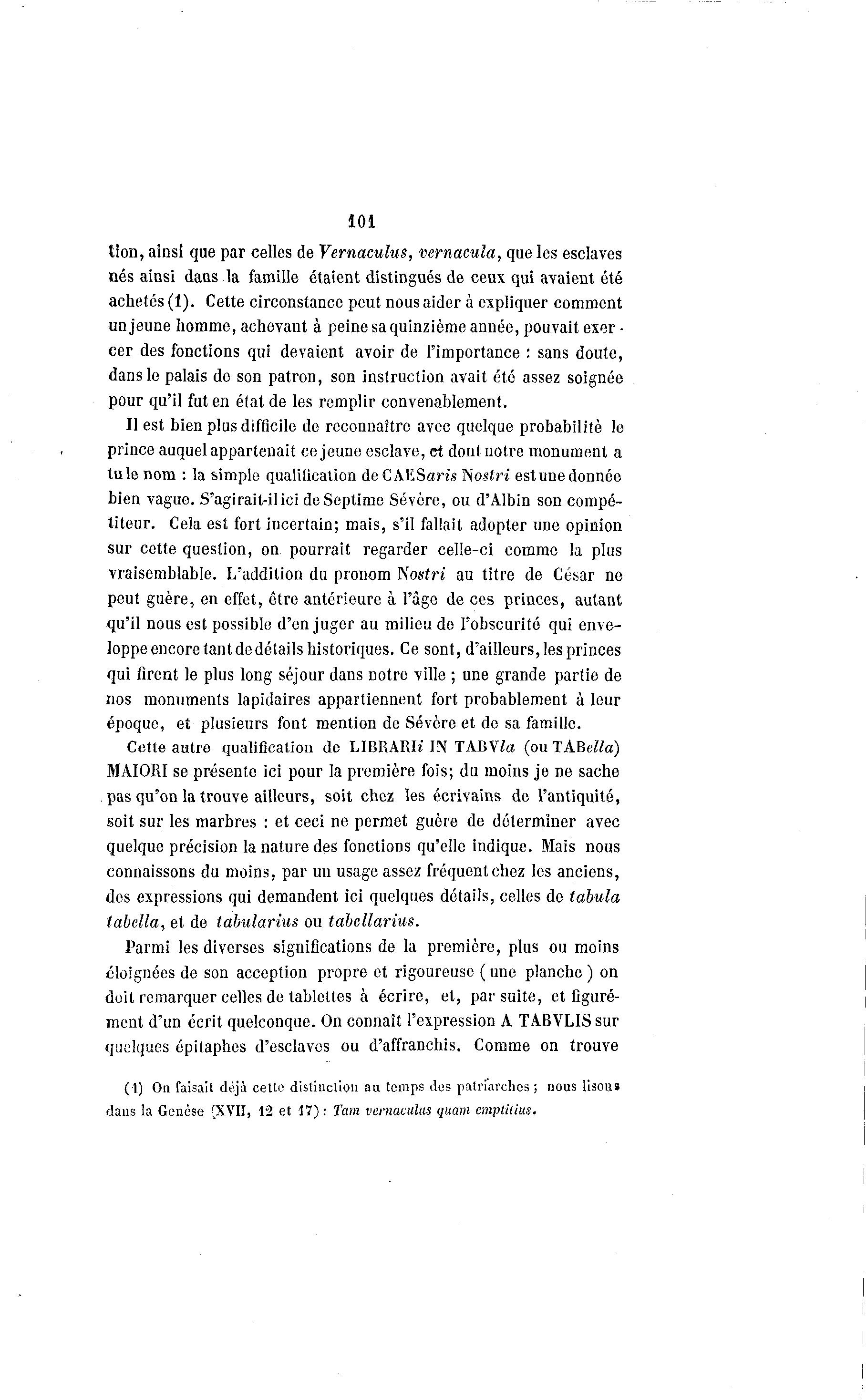 101 tion, ainsi que par celles de Vernaculus, vemacula, que les esclaves nés ainsi dans la famille étaient distingués de ceux qui avaient été achetés (1). Cette circonstance peut nous aider à expliquer comment un jeune homme, achevant à peine sa quinzième année, pouvait exer- cer des fonctions qui devaient avoir de l'importance : sans doute, dans le palais de son patron, son instruction avait été assez soignée pour qu'il fut en état de les remplir convenablement. Il est bien plus difficile de reconnaître avec quelque probabilité le prince auquel appartenait ce jeune esclave, et dont notre monument a tule nom : la simple qualification deCAESan's Hostri estune donnée bien vague. S'agirait-il ici deSeptime Sévère, ou d'Albin son compé- titeur. Cela est fort incertain; mais, s'il fallait adopter une opinion sur cette question, on pourrait regarder celle-ci comme la plus vraisemblable. L'addition du pronom Nostri au titre de César ne peut guère, en effet, être antérieure à l'âge de ces princes, autant qu'il nous est possible d'en juger au milieu de l'obscurité qui enve- loppe encore tant de détails historiques. Ce sont, d'ailleurs, les princes qui firent le plus long séjour dans notre ville ; une grande partie de nos monuments lapidaires appartiennent fort probablement à leur époque, et plusieurs font mention de Sévère et de sa famille. Cette autre qualification de LIBRARK IN TABV/a (ou TABella) MAIORI se présente ici pour la première fois; du moins je ne sache pas qu'on la trouve ailleurs, soit chez les écrivains de l'antiquité, soit sur les marbres : et ceci ne permet guère de déterminer avec quelque précision la nature des fonctions qu'elle indique. Mais nous connaissons du moins, par un usage assez fréquent chez les anciens, des expressions qui demandent ici quelques détails, celles de tabula tabella, et de tabularius ou tabellarius. Parmi les diverses significations de la première, plus ou moins éloignées de son acception propre et rigoureuse ( une planche ) on doit remarquer celles de tablettes à écrire, et, par suite, et iîguré- ment d'un écrit quelconque. On connaît l'expression A TABVLIS sur quelques épitaphos d'esclaves ou d'affranchis. Comme on trouve (•1) On faisait déjà cette distinction au temps des patriarches ; nous Usons dans la Genèse 'XVII, 12 et 17) : Tarn vernaculus quam emptitius.
