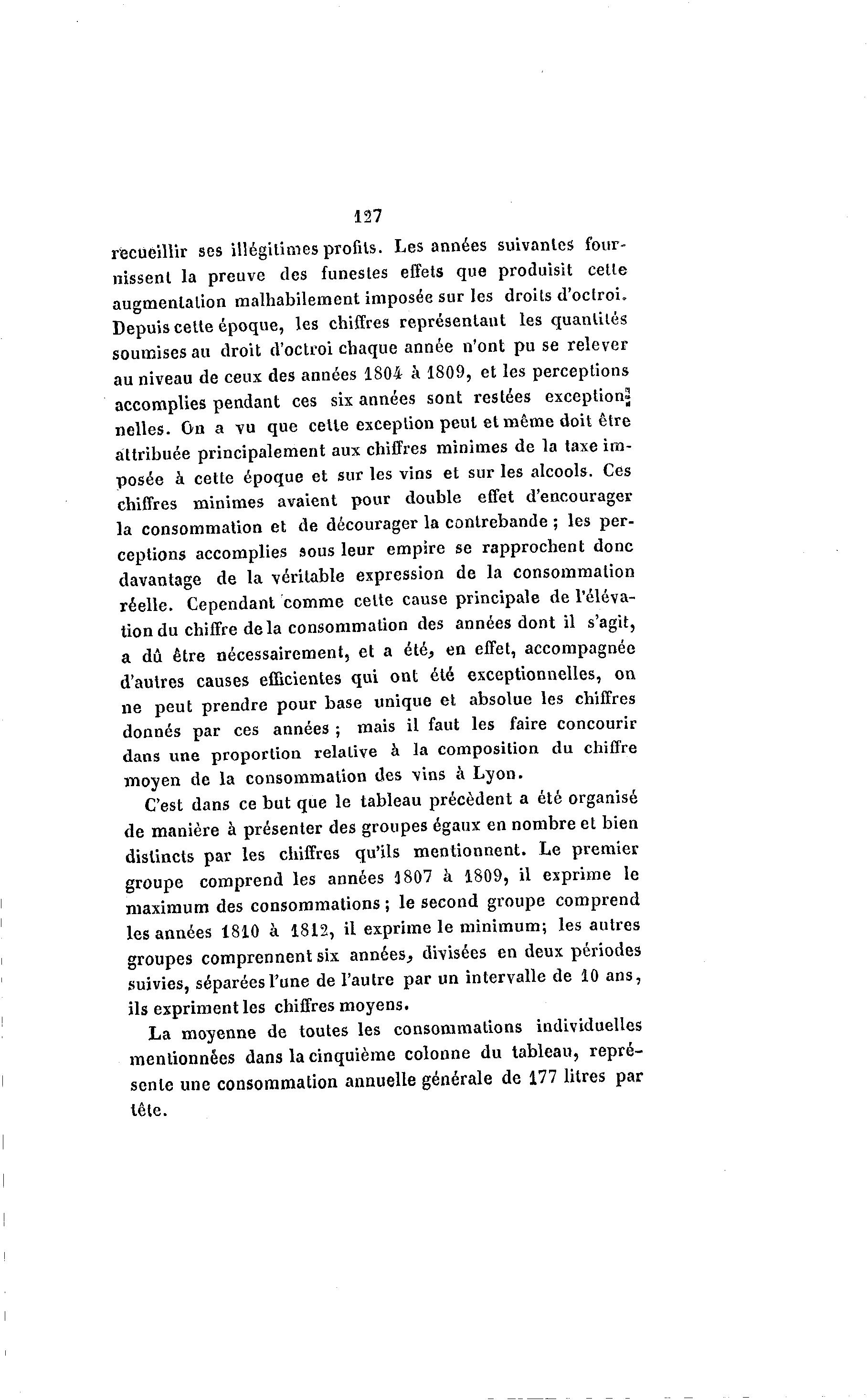 127 recueillir ses illégitimes profits. Les années suivantes four- nissent la preuve des funestes effets que produisit cette augmentation malhabilement imposée sur les droits d'octroi. Depuis cette époque, les chiffres représentant les quantités soumises au droit d'octroi chaque année n'ont pu se relever au niveau de ceux des années 1804 à 1809, et les perceptions accomplies pendant ces six années sont restées exception» nelles. On a vu que cette exception peut et même doit être attribuée principalement aux chiffres minimes de la taxe im- posée à cette époque et sur les vins et sur les alcools. Ces chiffres minimes avaient pour double effet d'encourager la consommation et de décourager la contrebande ; les per- ceptions accomplies sous leur empire se rapprochent donc davantage de la véritable expression de la consommation réelle. Cependant comme cette cause principale de l'éléva- tion du chiffre delà consommation des années dont il s'agit, a dû être nécessairement, et a été, en effet, accompagnée d'autres causes efficientes qui ont été exceptionnelles, on ne peut prendre pour base unique et absolue les chiffres donnés par ces années ; mais il faut les faire concourir dans une proportion relative à la composition du chiffre moyen de la consommation des vins à Lyon. C'est dans ce but que le tableau précèdent a été organisé de manière à présenter des groupes égaux en nombre et bien distincts par les chiffres qu'ils mentionnent. Le premier groupe comprend les années 1807 à 1809, il exprime le maximum des consommations ; le second groupe comprend les années 1810 à 1812, il exprime le minimum; les autres groupes comprennent six années, divisées en deux périodes suivies, séparées l'une de l'autre par un intervalle de 10 ans, ils expriment les chiffres moyens. La moyenne de toutes les consommations individuelles mentionnées dans la cinquième colonne du tableau, repré- sente une consommation annuelle générale de 177 litres par lête.