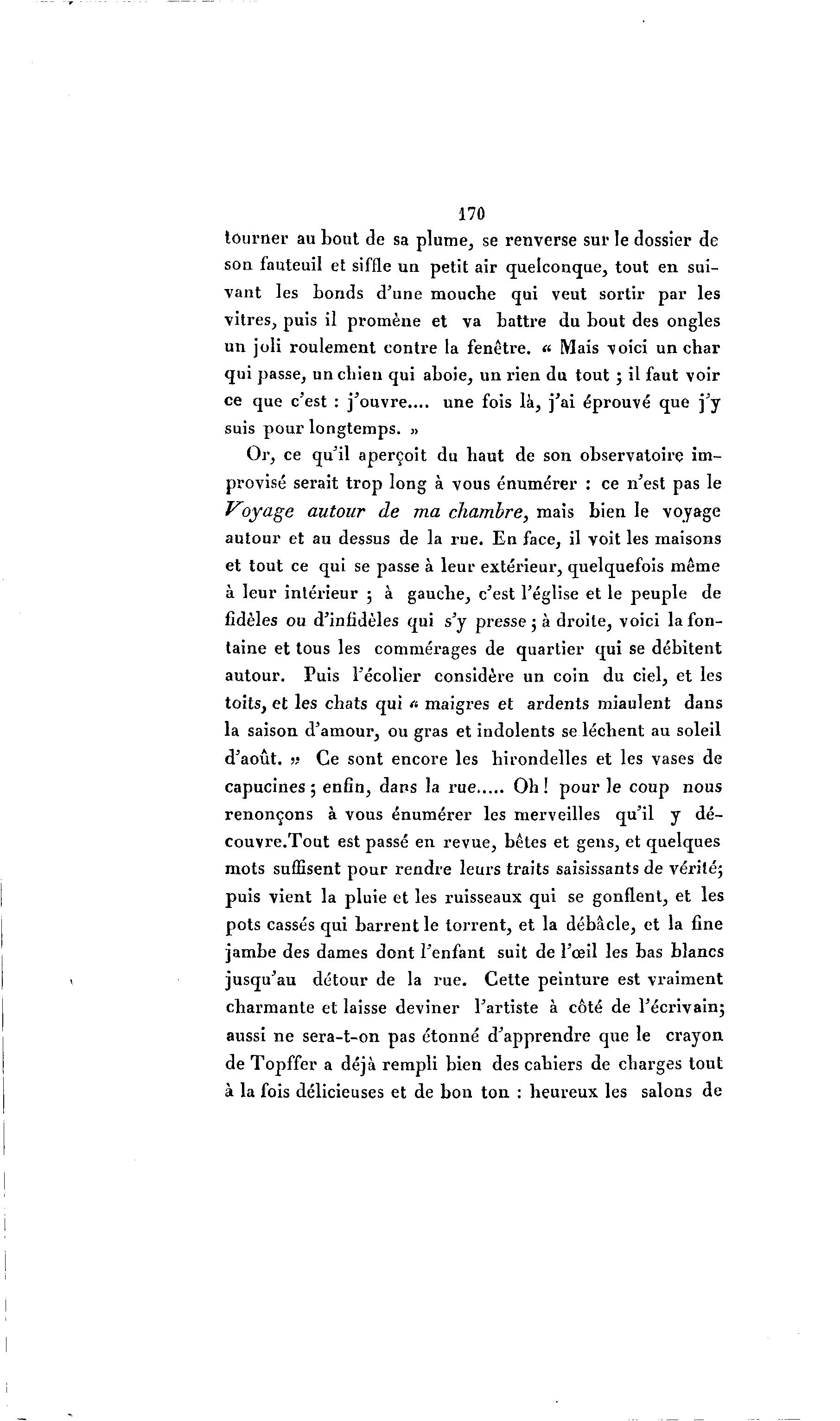 170 tourner au bout de sa plume, se renverse sur le dossier de son fauteuil et siffle un petit air quelconque, tout en sui- vant les bonds d'une mouche qui veut sortir par les vitres, puis il promène et va battre du bout des ongles un joli roulement contre la fenêtre. « Mais voici un char qui passe, un chien qui aboie, un rien du tout ; il faut voir ce que c'est : j'ouvre.... une fois là , j'ai éprouvé que j'y suis pour longtemps. » Or, ce qu'il aperçoit du haut de son observatoire im- provisé serait trop long à vous énumérer : ce n'est pas le Voyage autour de ma chambre, mais bien le voyage autour et au dessus de la rue. En face, il voit les maisons et tout ce qui se passe à leur extérieur, quelquefois même à leur intérieur ; à gauche, c'est l'église et le peuple de fidèles ou d'infidèles qui s'y presse; à droite, voici la fon- taine et tous les commérages de quartier qui se débitent autour. Fuis l'écolier considère un coin du ciel, et les toits, et les chats qui « maigres et ardents miaulent dans la saison d'amour, ou gras et indolents se lèchent au soleil d'août. » Ce sont encore les hirondelles et les vases de capucines; enfin, dans la rue Oh! pour le coup nous renonçons à vous énumérer les merveilles qu'il y dé- couvre.Tout est passé en revue, bêtes et gens, et quelques mots suffisent pour rendre leurs traits saisissants de vérité; puis vient la pluie et les ruisseaux qui se gonflent, et les pots cassés qui barrent le torrent, et la débâcle, et la fine jambe des dames dont l'enfant suit de l'œil les bas blancs jusqu'au détour de la rue. Cette peinture est vraiment charmante et laisse deviner l'artiste à côté de l'écrivain; aussi ne sera-t-on pas étonné d'apprendre que le crayon de Topffer a déjà rempli bien des cahiers de charges tout à la fois délicieuses et de bon ton : heureux les salons de