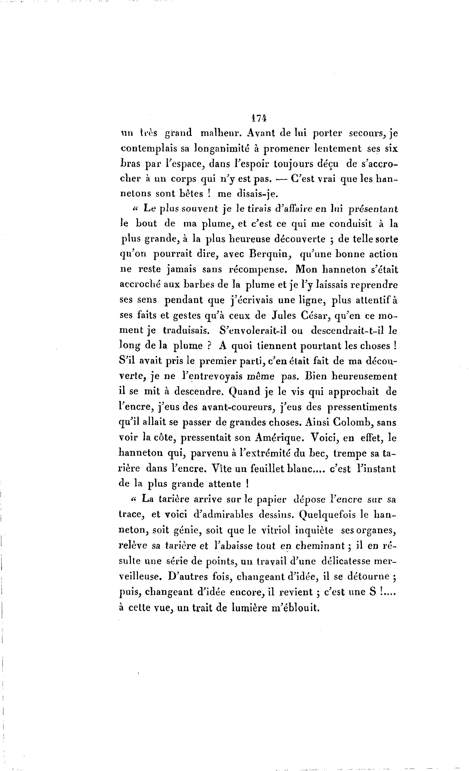 174 un très grand malheur. Avant de lui p o r t e r secours, je contemplais sa longanimité à p r o m e n e r lentement ses six bras p a r l'espace, dans l'espoir toujours déçu de s'accro- cher à un corps qui n'y est pas. •— C'est vrai que les h a n - netons sont bêtes ! me disais-je. « Le plus souvent j e le tirais d'affaire en lui présentant le bout de ma p l u m e , et c'est ce qui me conduisit à la plus grande, à la plus heureuse découverte ; de telle sorte q u ' o n pourrait dire, avec B e r q u i n , qu'une b o n n e action n e reste jamais sans récompense. M o n h a n n e t o n s'était accroché aux barbes de la plume et je l'y laissais r e p r e n d r e ses sens p e n d a n t que j'écrivais une ligne, plus attentif à ses faits et gestes qu'à ceux de Jules Césax', qu'en ce m o - m e n t je traduisais. S'envolerait-il ou descendrait-t-il le long de la p l u m e ? A quoi tiennent p o u r t a n t les choses ! S'il avait pris le premier p a r t i , c'en était fait de ma décou- verte, je ne l'entrevoyais même pas. Bien heureusement il se mit à descendre. Q u a n d je le vis qui approchait de l'encre, j'eus des avant-coureurs, j'eus des pressentiments qu'il allait se passer de grandes choses. Ainsi C o l o m b , sans voir la côte, pressentait son Amérique. Voici, en effet, le h a n n e t o n qui, parvenu à l'extrémité du b e c , t r e m p e sa t a - rière dans l'encre. Vite un feuillet b l a n c . . . c'est l'instant de la plus grande attente ! « La tarière arrive sur le papier dépose l'encre sur sa trace, et voici d'admirables dessins. Quelquefois le h a n - n e t o n , soit génie, soit que le vitriol inquiète ses organes, relève sa tarière et l'abaisse tout en cheminant ; il en r é - sulte une série de points, u n travail d'une délicatesse m e r - veilleuse. D'autres fois, changeant d'idée, il se détourne ; puis, changeant d'idée encore, il revient ; c'est une S !.... à cette vue, un trait de lumière m'éblouit.