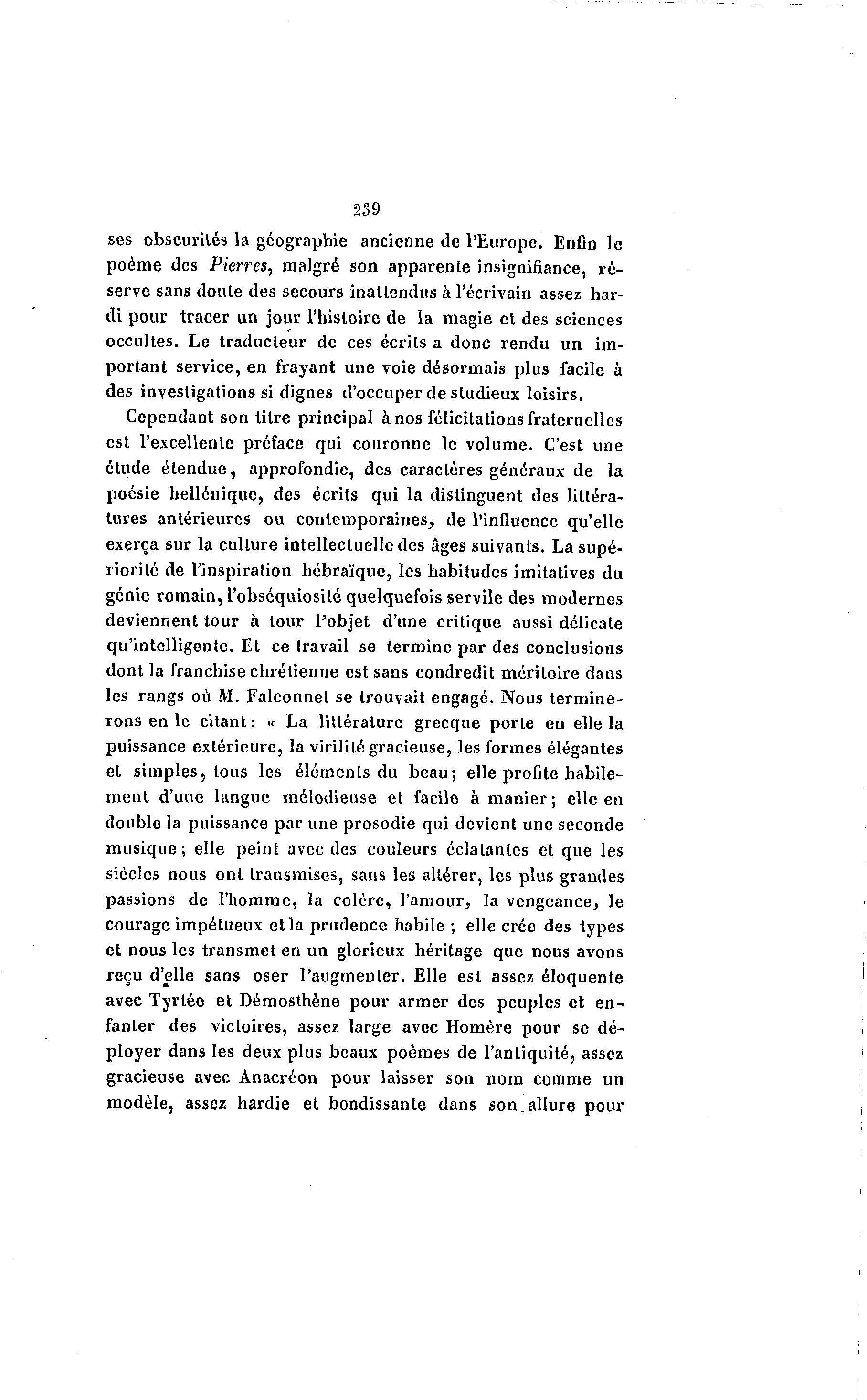 239 ses obscurités la géographie ancienne de l'Europe. Enfin le poème des Pierres, malgré son apparente insignifiance, r é - serve sans doute des secours inattendus à l'écrivain assez har- di pour tracer un jour l'histoire de la magie et des sciences occultes. Le traducteur de ces écrits a donc rendu un im- portant service, en frayant une voie désormais plus facile à des investigations si dignes d'occuper de studieux loisirs. Cependant son titre principal à nos félicitations fraternelles est l'excellente préface qui couronne le volume. C'est une étude é t e n d u e , approfondie, des caractères généraux de la poésie hellénique, des écrits qui la distinguent des littéra- tures antérieures ou contemporaines, de l'influence qu'elle exerça sur la culture intellectuelle des âges suivants. La supé- riorité de l'inspiration hébraïque, les habitudes imitatives du génie romain, l'obséquiosité quelquefois servile des modernes deviennent tour à tour l'objet d'une critique aussi délicate qu'intelligente. Et ce travail se termine par des conclusions dont la franchise chrétienne est sans condredit méritoire dans les rangs où M. Falconnet se trouvait engagé. Nous termine- rons en le citant: « La littérature grecque porte en elle la puissance extérieure, la virilité gracieuse, les formes élégantes et simples, tous les éléments du b e a u ; elle profite habile- m e n t d'une langue mélodieuse et facile à m a n i e r ; elle en double la puissance par une prosodie qui devient une seconde m u s i q u e ; elle peint avec des couleurs éclatantes et que les siècles nous ont transmises, sans les altérer, les plus grandes passions de l'homme, la colère, l'amour, la vengeance, le courage impétueux et la prudence habile ; elle crée des types et nous les transmet en un glorieux héritage que nous avons reçu d'elle sans oser l'augmenter. Elle est assez éloquente avec Tyrlée et Démosthène pour armer des peuples et e n - fanter des victoires, assez large avec Homère pour se dé- ployer dans les deux plus beaux poèmes de l'antiquité, assez gracieuse avec Anacréon pour laisser son nom comme un modèle, assez hardie et bondissante dans son,allure pour