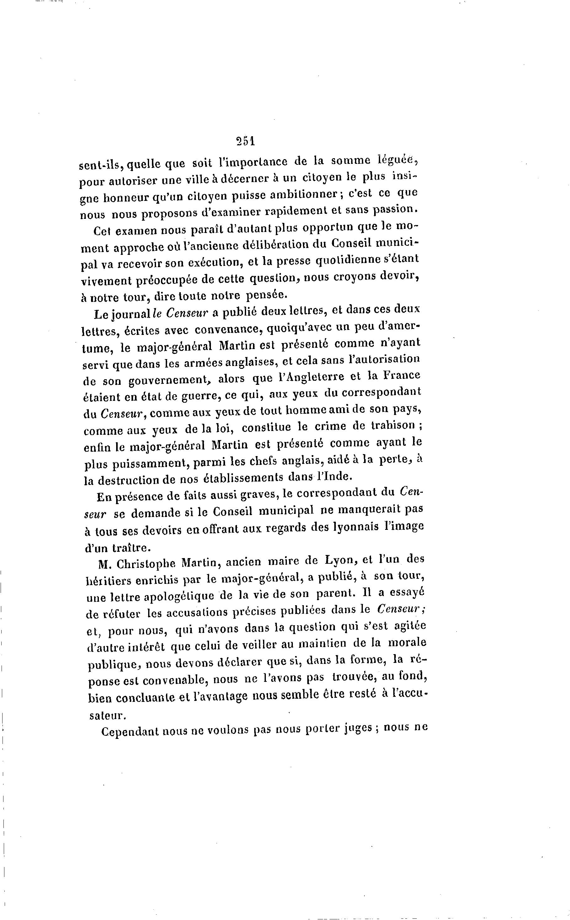 251 sent-ils, quelle que soit l'importance de la somme léguée, pour autoriser une ville a décerner à un citoyen le plus insi- gne honneur qu'un citoyen puisse ambitionner; c'est ce que nous nous proposons d'examiner rapidement et sans passion. Cet examen nous paraît d'autant plus opportun que le mo- ment approche où l'ancienne délibération du Conseil munici- pal va recevoir son exécution, et la presse quotidienne s'étant vivement préoccupée de cette question, nous croyons devoir, à notre tour, dire toute noire pensée. Le journaHe Censeur a publié deux lettres, et dans ces deux lettres, écrites avec convenance, quoiqu'avec un peu d'amer- tume, le major-général Martin est présenté comme n'ayant servi que dans les armées anglaises, et cela sans l'autorisation de son gouvernement, alors que l'Angleterre et la France étaient en état de guerre, ce qui, aux yeux du correspondant du Censeur, comme aux yeux de tout homme ami de son pays, comme aux yeux de la loi, constitue le crime de trahison ; enfin le major-général Martin est présenté comme ayant le plus puissamment, parmi les chefs anglais, aidé à la perte, à la destruction de nos établissements dans l'Inde. En présence de faits aussi graves, le correspondant du Cen- seur se demande si le Conseil municipal ne manquerait pas à lous ses devoirs en offrant aux regards des lyonnais l'image d'un traître. M. Christophe Martin, ancien maire de Lyon, et l'un des héritiers enrichis par le major-général, a publié, à son tour, une lettre apologétique de la vie de son parent. Il a essayé de réfuter les accusations précises publiées dans le Censeur; et, pour nous, qui n'avons dans la question qui s'est agitée d'autre intérêt que celui de veiller au mainlien de la morale publique, nous devons déclarer que si, dans la forme, la ré- ponse est convenable, nous ne l'avons pas trouvée, au fond, bien concluante et l'avantage nous semble être resté à l'accu- sateur. Cependant nous ne voulons pas nous porter juges ; nous ne