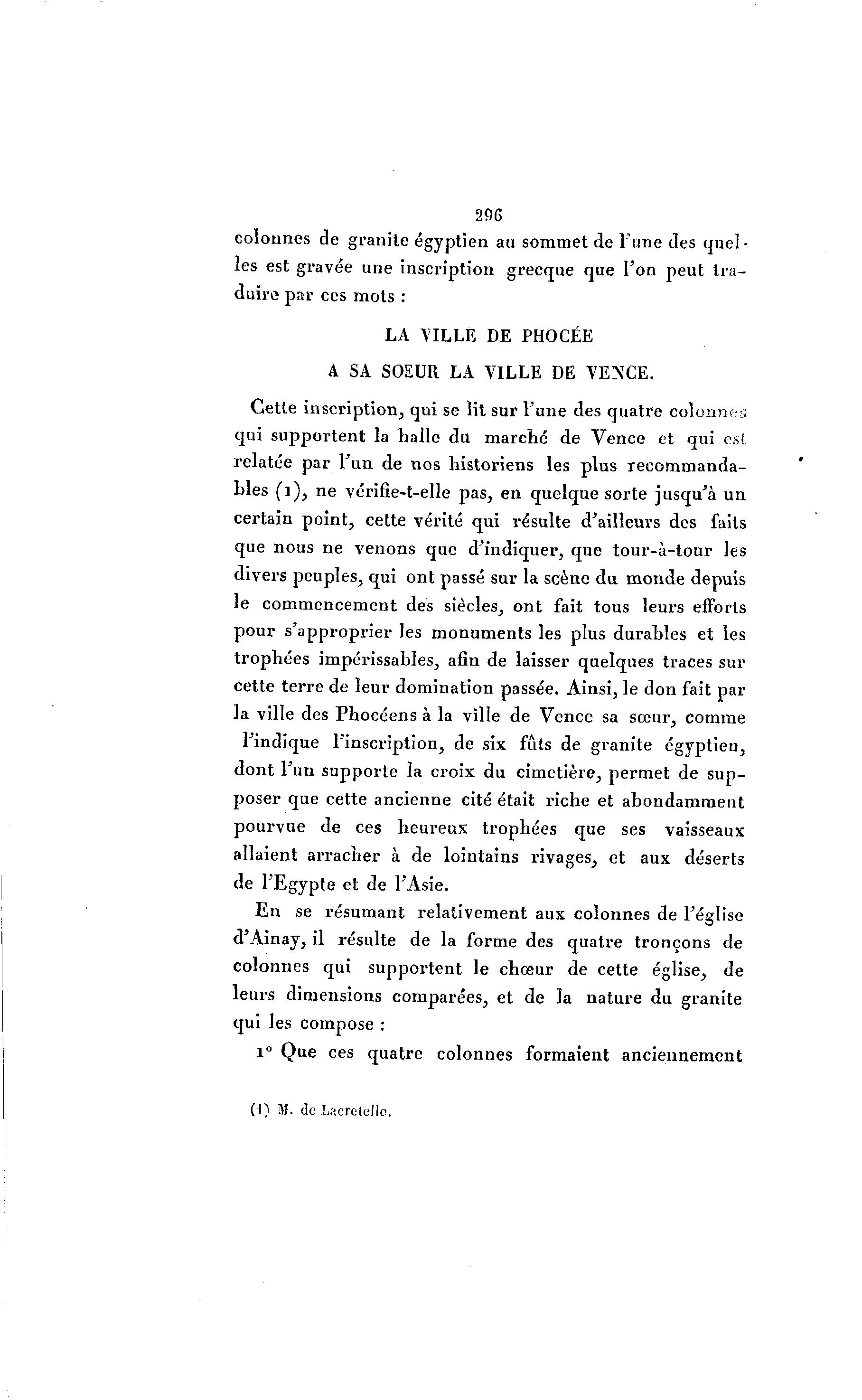 296 colonnes de granité égyptien au sommet de l'une des quel- les est gravée une inscription grecque que l'on peut tra- duira par ces mots : LA VILLE DE PHOCÉE A SA SOEUR LA VILLE DE VENCE. Cette inscription, qui se lit sur l'une des quatre colonnes qui supportent la halle du marché de Vence et qui est relatée par l'un de nos historiens les plus reeommanda- bles ( i ) , ne vérifîe-t-elle pas, en quelque sorte jusqu'à un certain point, cette vérité qui résulte d'ailleurs des faits que nous ne venons que d'indiquer, que tour-à -tour les divers peuples, qui ont passé sur la scène du monde depuis le commencement des siècles, ont fait tous leurs efforts pour s'approprier les monuments les plus durables et les trophées impérissables, afin de laisser quelques traces sur cette terre de leur domination passée. Ainsi, le don fait par la ville des Phocéens à la ville de Vence sa sœur, comme l'indique l'inscription, de six fûts de granité égyptien, dont l'un supporte la croix du cimetière, permet de sup- poser que cette ancienne cité était riche et abondamment pourvue de ces heureux trophées que ses vaisseaux allaient arracher à de lointains rivages, et aux déserts de l'Egypte et de l'Asie. En se résumant relativement aux colonnes de l'église d'Ainay, il résulte de la forme des quatre tronçons de colonnes qui supportent le chœur de cette église, de leurs dimensions comparées, et de la nature du granité qui les compose : i° Que ces quatre colonnes formaient anciennement (I) M. de Lacrelellc.
