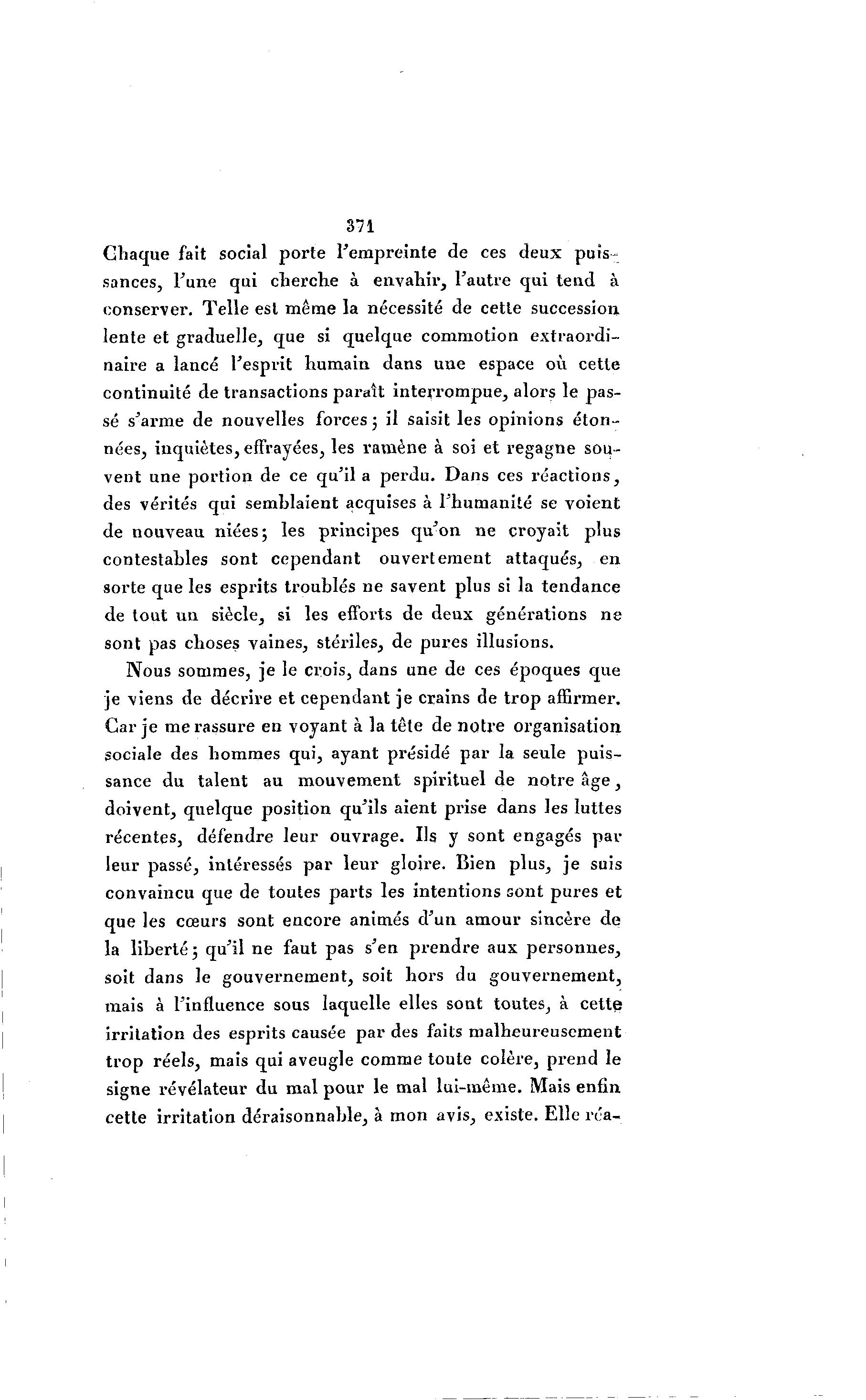 371 Chaque fait social porte l'empreinte de ces deux puis- sances, l'une qui cherche à envahir, l'autre qui tend à conserver. Telle est même la nécessité de cette succession lente et graduelle, que si quelque commotion extraordi- naire a lancé l'esprit humain dans une espace où cette continuité de transactions paraît interrompue, alors le pas- sé s'arme de nouvelles forces ; il saisit les opinions éton- nées, inquiètes, effrayées, les ramène à soi et regagne sou- vent une portion de ce qu'il a perdu. Dans ces réactions, des vérités qui semblaient acquises à l'humanité se voient de nouveau niées; les principes qu'on ne croyait plus contestables sont cependant ouvertement attaqués, en sorte que les esprits troublés ne savent plus si la tendance de tout un siècle, si les efforts de deux générations ne sont pas choses vaines, stériles, de pures illusions. Nous sommes, je le crois, dans une de ces époques que je viens de décrire et cependant je crains de trop affirmer. Car je me rassure en voyant à la tête de notre organisation sociale des hommes qui, ayant présidé par la seule puis- sance du talent au mouvement spirituel de notre âge, doivent, quelque position qu'ils aient prise dans les luttes récentes, défendre leur ouvrage. Ils y sont engagés par leur passé, intéressés par leur gloire. Bien plus, je suis convaincu que de toutes parts les intentions sont pures et que les cœurs sont encore animés d'un amour sincère de la liberté; qu'il ne faut pas s'en prendre aux personnes, soit dans le gouvernement, soit hors du gouvernement, mais à l'influence sous laquelle elles sont toutes, à cette irritation des esprits causée par des faits malheureusement trop réels, mais qui aveugle comme toute colère, prend le signe révélateur du mal pour le mal lui-même. Mais enfin cette irritation déraisonnable, à mon avis, existe. Elle réa-