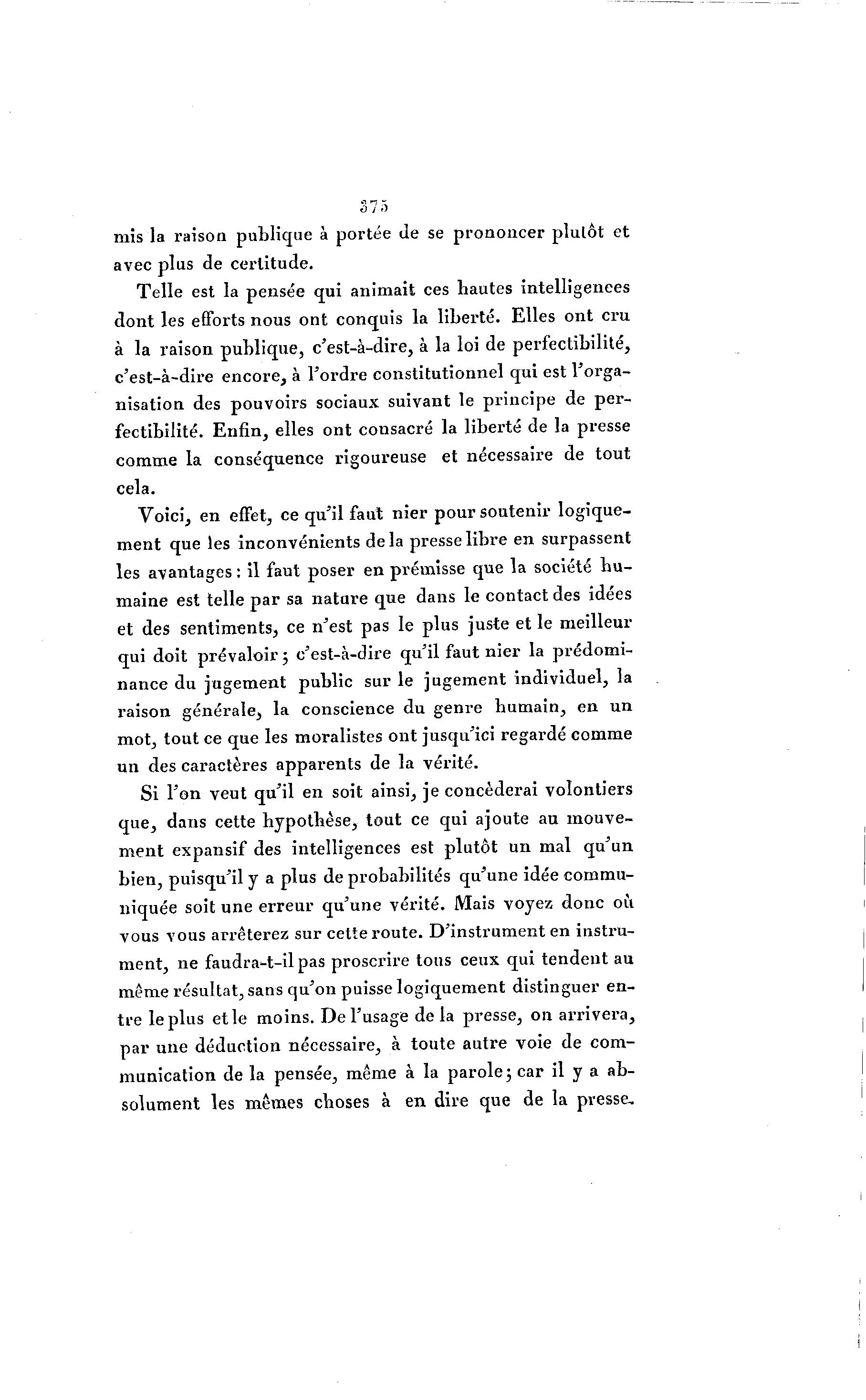 375 mis la raison publique à portée de se prononcer plutôt et avec plus de certitude. Telle est la pensée qui animait ces hautes intelligences dont les efforts nous ont conquis la liberté. Elles ont cru à la raison publique, c'est-à -dire, à la loi de perfectibilité, c'est-à -dire encore, à l'ordre constitutionnel qui est l'orga- nisation des pouvoirs sociaux suivant le principe de per- fectibilité. Enfin, elles ont consacré la liberté de la presse comme la conséquence rigoureuse et nécessaire de tout cela. Voici, en effet, ce qu'il faut nier pour soutenir logique- ment que les inconvénients de la presse libre en surpassent les avantages : il faut poser en prémisse que la société h u - maine est telle par sa nature que dans le contact des idées et des sentiments, ce n'est pas le plus juste et le meilleur qui doit prévaloir ; c'est-à -dire qu'il faut nier la prédomi- nance du jugement public sur le jugement individuel, la raison générale, la conscience du genre humain, en un mot, tout ce que les moralistes ont jusqu'ici regardé comme un des caractères apparents de la vérité. Si l'on veut qu'il en soit ainsi, je concéderai volontiers que, dans cette hypothèse, tout ce qui ajoute au mouve- ment expansif des intelligences est plutôt un mal qu'un bien, puisqu'il y a plus de probabilités qu'une idée commu- niquée soit une erreur qu'une vérité. Mais voyez donc où vous vous arrêterez sur cette route. D'instrument en instru- ment, ne faudra-t-il pas proscrire tous ceux qui tendent au même résultat, sans qu'on puisse logiquement distinguer en- tre le plus et le moins. De l'usage de la presse, on arrivera, par une déduction nécessaire, à toute autre voie de com- munication de la pensée, même à la parole; car il y a ab- solument les mêmes choses à en dire que de la presse.