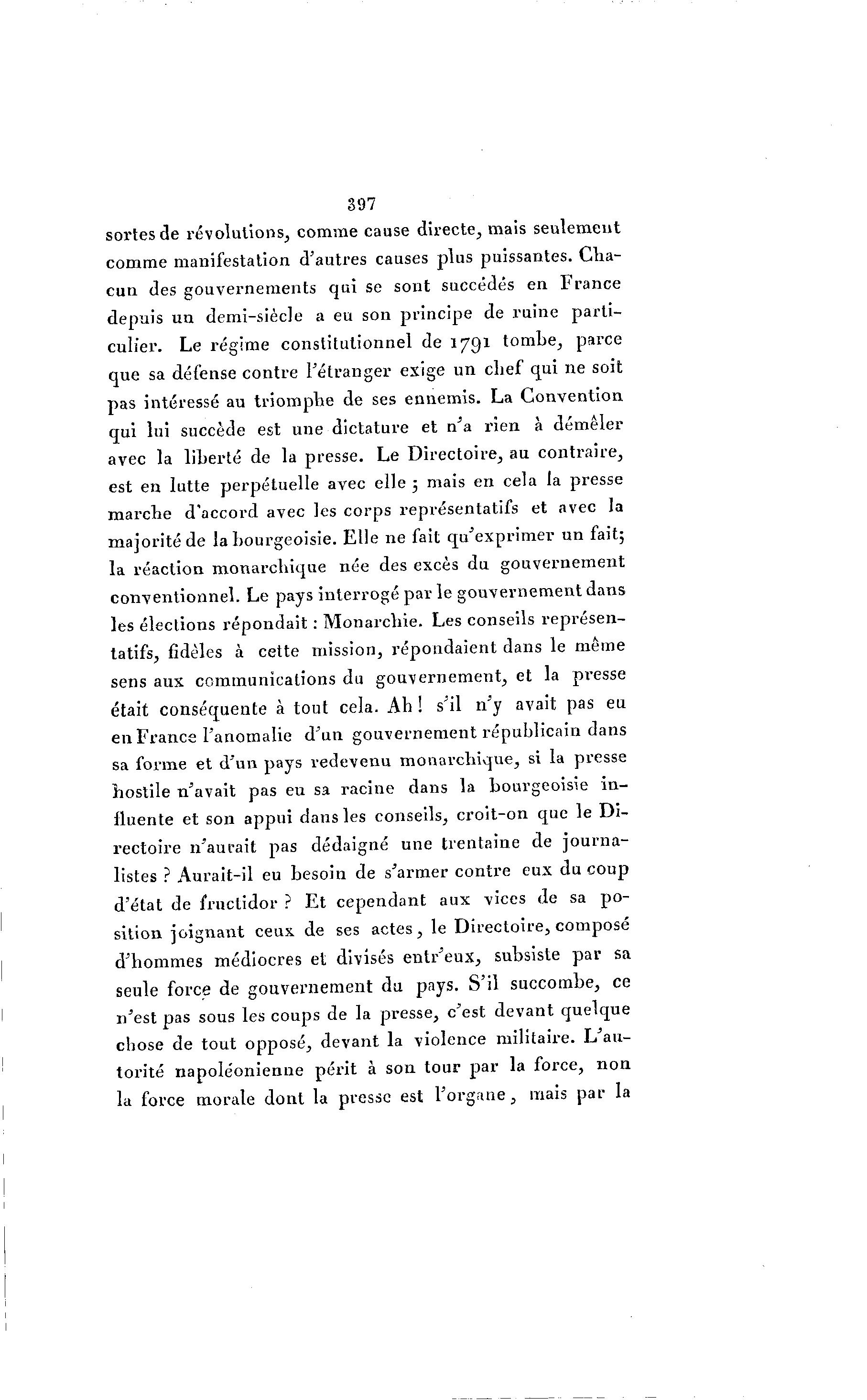 397 sortes de révolutions, comme cause directe, mais seulement comme manifestation d'autres causes plus puissantes. Cha- cun des gouvernements qui se sont succédés en France depuis un demi-siècle a eu son principe de ruine parti- culier. Le régime constitutionnel de 1791 tombe, parce que sa défense contre l'étranger exige un chef qui ne soit pas intéressé au triomphe de ses ennemis. La Convention qui lui succède est une dictature et n'a rien à démêler avec la liberté de la presse. Le Directoire, au contraire, est en lutte perpétuelle avec elle 5 mais en cela la presse marche d'accord avec les corps représentatifs et avec la majorité de la bourgeoisie. Elle ne fait qu'exprimer un fait; la réaction monarchique née des excès du gouvernement conventionnel. Le pays interrogé par le gouvernement dans les élections répondait : Monarchie. Les conseils représen- tatifs, fidèles à cette mission, répondaient dans le même sens aux communications du gouvernement, et la presse était conséquente à tout cela. Ah ! s'il n'y avait pas eu en France l'anomalie d'un gouvernement républicain dans sa forme et d'un pays redevenu monarchique, si la presse hostile n'avait pas eu sa racine dans la bourgeoisie in- fluente et son appui dans les conseils, croit-on que le Di- rectoire n'aurait pas dédaigné une trentaine de journa- listes ? Aurait-il eu besoin de s'armer contre eux du coup d'état de fructidor ? Et cependant aux vices de sa po- sition joignant ceux de ses actes, le Directoire, composé d'hommes médiocres et divisés entr'eux, subsiste par sa seule force de gouvernement du pays. S'il succombe, ce n'est pas sous les coups de la presse, c'est devant quelque chose de tout opposé, devant la violence militaire. L'au- torité napoléonienne périt à son tour par la force, non la force morale dont la presse est l'organe, mais par la