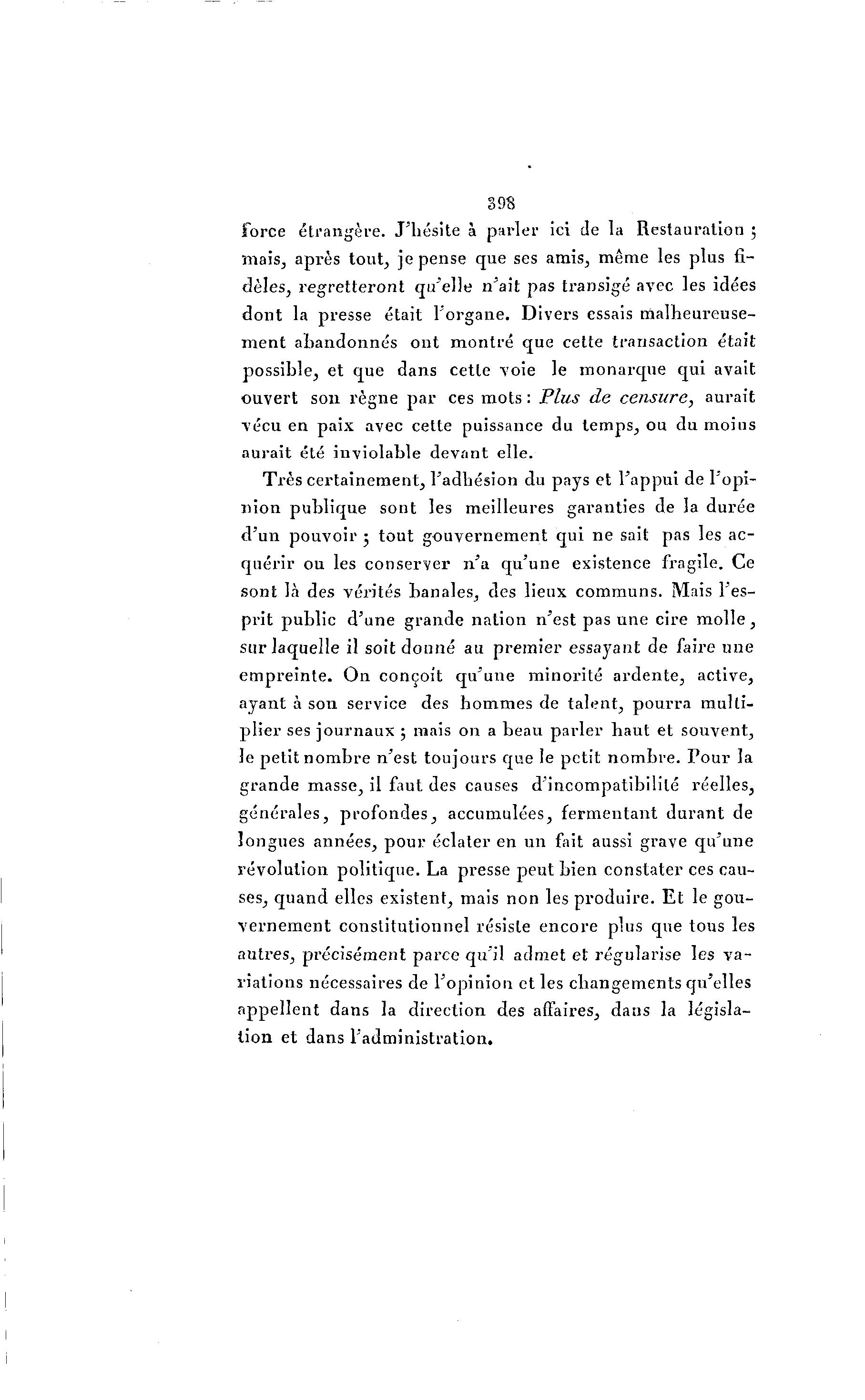 398 force étrangère. J'hésite à parler ici de la Restauration ; mais, après tout, je pense que ses amis, même les plus fi- dèles, regretteront qu'elle n'ait pas transigé avec les idées d o n t la presse était l'organe. Divers essais malheureuse- m e n t a b a n d o n n é s ont m o n t r é que cette transaction était possible, et que dans cette voie le m o n a r q u e qui avait ouvert son règne par ces mots : Plus de censure, aurait vécu en paix avec cette puissance du temps, ou du moins aurait été inviolable devant elle. T r è s certainement, l'adhésion du pays et l'appui de l'opi- n i o n publique sont les meilleures garanties de la durée d ' u n pouvoir ; tout g o u v e r n e m e n t qui ne sait pas les ac- quérir ou les conserver n'a qu'une existence fragile. Ce sont là des vérités banales, des lieux communs. Mais l'es- prit public d'une grande nation n'est pas une cire m o l l e , sur laquelle il soit d o n n é au premier essayant de faire une empreinte. O n conçoit q u ' u n e minorité a r d e n t e , active, ayant à son service des h o m m e s de talent, p o u r r a multi- plier ses journaux ; niais on a beau parler haut et souvent, le petit n o m b r e n'est toujours que le petit n o m b r e . P o u r la grande masse, il faut des causes d'incompatibilité réelles, générales, p r o f o n d e s , accumulées, fermentant d u r a n t de longues années, p o u r éclater en un fait aussi grave q u ' u n e révolution politique. La presse peut bien constater ces cau- ses, q u a n d elles existent, mais non les produire. E t le gou- v e r n e m e n t constitutionnel résiste encore plus que tous les autres, précisément parce qu'il admet et régularise les v a - riations nécessaires de l'opinion et les changements qu'elles appellent dans la direction des affaires, dans la législa- tion et dans l'administration.