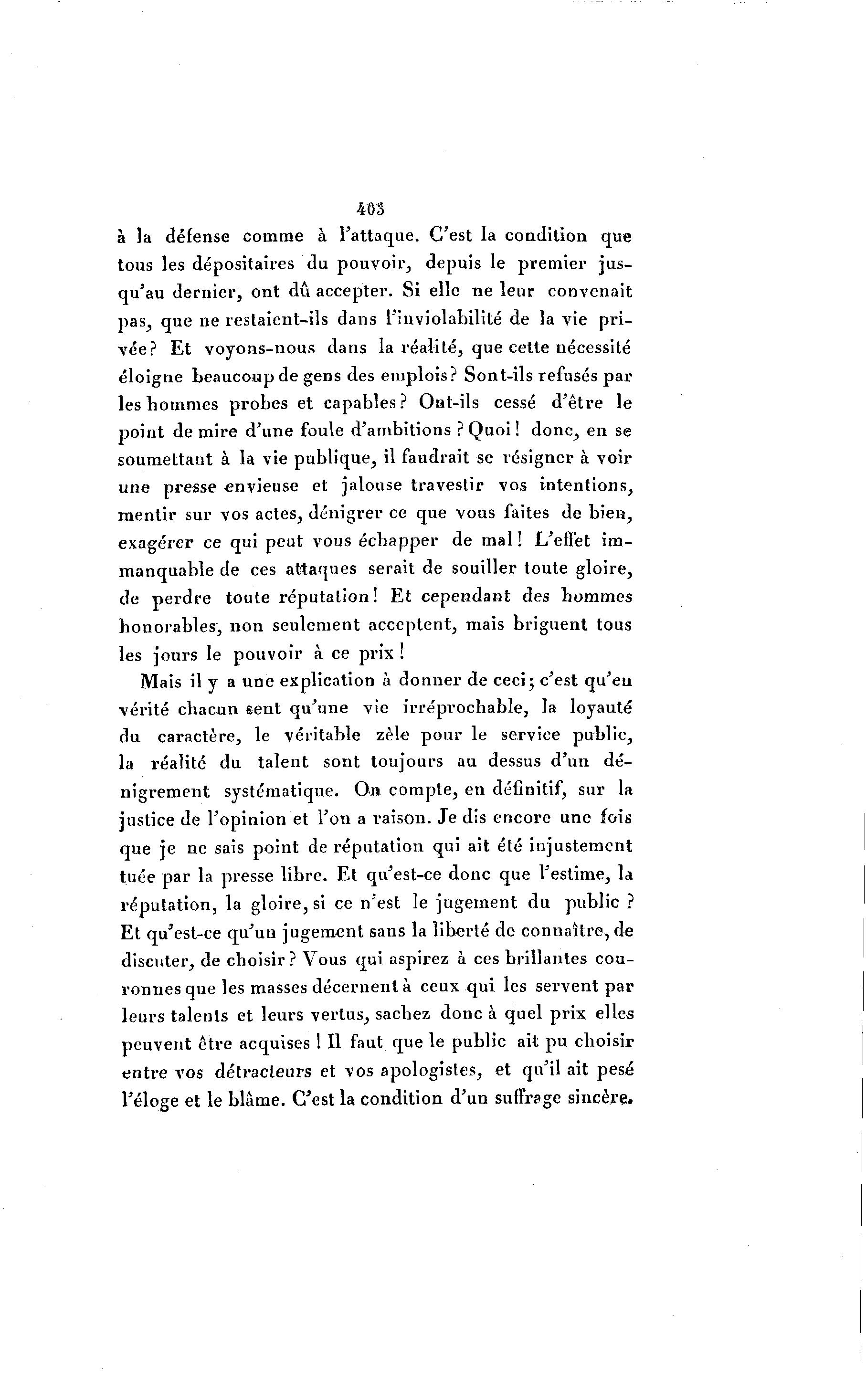 403 à la défense comme à l'attaque. C'est la condition que tous les dépositaires du pouvoir, depuis le premier jus- qu'au dernier, ont dû accepter. Si elle ne leur convenait pas, que ne restaient-ils dans l'inviolabilité de la vie pri- vée? Et voyons-nous dans la réalité, que cette nécessité éloigne beaucoup de gens des emplois? Sont-ils refusés par les hommes probes et capables? Ont-ils cessé d'être le point de mire d'une foule d'ambitions ? Quoi ! donc, en se soumettant à la vie publique, il faudrait se résigner à voir une presse -envieuse et jalouse travestir vos intentions, mentir sur vos actes, dénigrer ce que vous faites de bien, exagérer ce qui peut vous échapper de mal! L'effet im- manquable de ces attaques serait de souiller toute gloire, de perdre toute réputation! Et cependant des hommes honorables, non seulement acceptent, mais briguent tous les jours le pouvoir à ce prix ! Mais il y a une explication à donner de ceci; c'est qu'en vérité chacun sent qu'une vie irréprochable, la loyauté du caractère, le véritable zèle pour le service public, la réalité du talent sont toujours au dessus d'un dé- nigrement systématique. On compte, en définitif, sur la justice de l'opinion et l'on a raison. Je dis encore une fois que je ne sais point de réputation qui ait été injustement tuée par la presse libre. Et qu'est-ce donc que l'estime, la réputation, la gloire, si ce n'est le jugement du public ? Et qu'est-ce qu'un jugement sans la liberté de connaître, de discuter, de choisir? Vous qui aspirez à ces brillantes cou- ronnes que les masses décernent à ceux qui les servent par leurs talents et leurs vertus, sachez donc à quel prix elles peuvent être acquises ! Il faut que le public ait pu choisir entre vos détracteurs et vos apologisles, et qu'il ait pesé l'éloge et le blâme. C'est la condition d'un suffrage sincère.