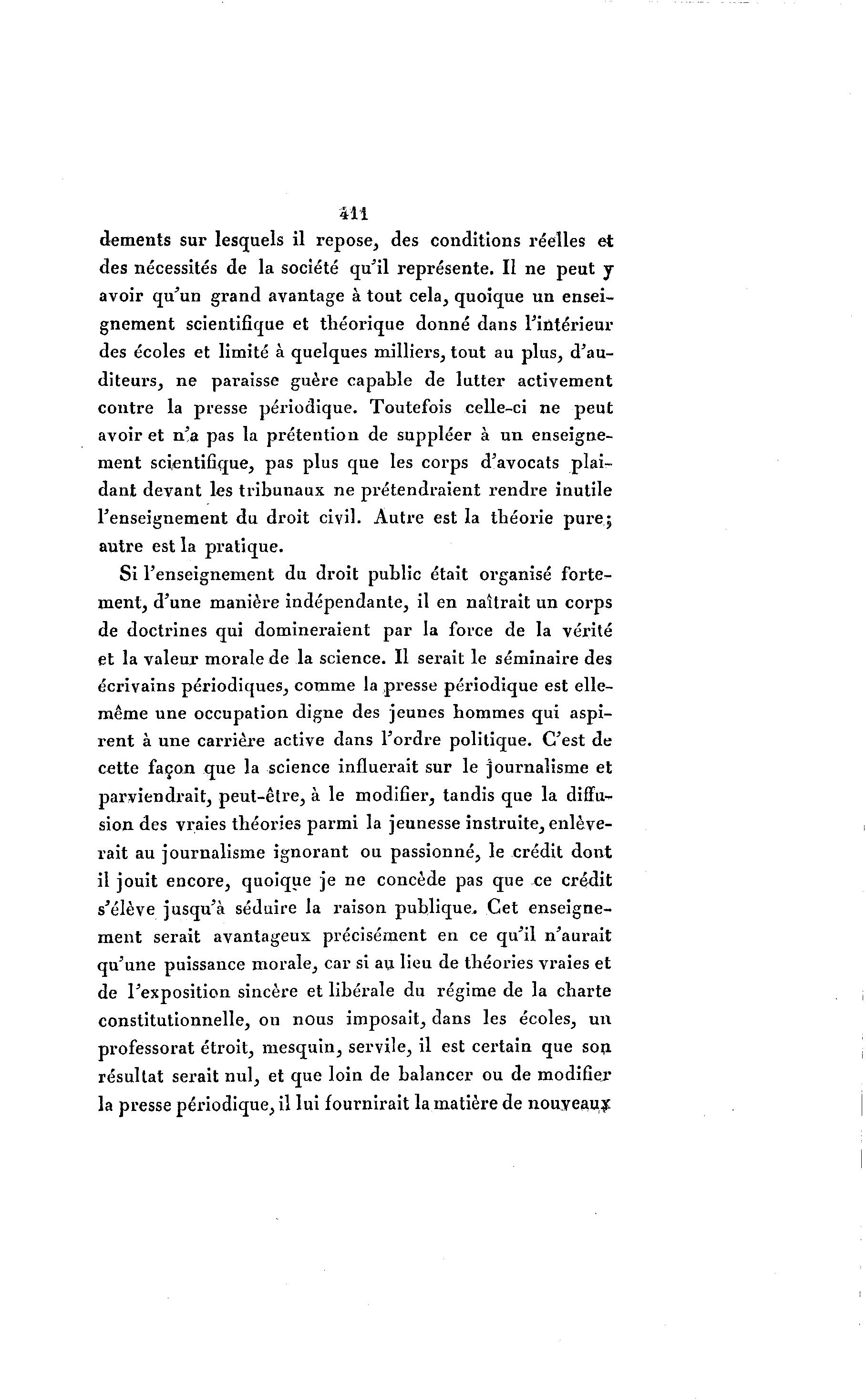 411 déments sur lesquels il repose, des conditions réelles et des nécessités de la société qu'il représente. Il ne peut y avoir qu'un grand avantage à tout cela, quoique un ensei- gnement scientifique et théorique donné dans l'intérieur des écoles et limité à quelques milliers, tout au plus, d'au- diteurs, ne paraisse guère capable de lutter activement contre la presse périodique. Toutefois celle-ci ne peut avoir et n'a pas la prétention de suppléer à un enseigne- ment scientifique, pas plus que les corps d'avocats plai- dant devant les tribunaux ne prétendraient rendre inutile l'enseignement du droit civil. Autre est la théorie pure; autre est la pratique. Si l'enseignement du droit public était organisé forte- ment, d'une manière indépendante, il en naîtrait un corps de doctrines qui domineraient par la force de la vérité et la valeur morale de la science. Il serait le séminaire des écrivains périodiques, comme la presse périodique est elle- même une occupation digne des jeunes hommes qui aspi- rent à une carrière active dans l'ordre politique. C'est de cette façon que la science influerait sur le journalisme et parviendrait, peut-être, à le modifier, tandis que la diffu- sion des vraies théories parmi la jeunesse instruite, enlève- rait au journalisme ignorant ou passionné, le crédit dont il jouit encore, quoique je ne concède pas que ce crédit s'élève jusqu'à séduire la l'aison publique. Cet enseigne- ment serait avantageux précisément en ce qu'il n'aurait qu'une puissance morale, car si au lieu de théories vraies et de l'exposition sincère et libérale du régime de la charte constitutionnelle, on nous imposait, dans les écoles, un professorat étroit, mesquin, servile, il est certain que son résultat serait nul, et que loin de balancer ou de modifier la presse périodique, il lui fournirait la matière de nouveau^