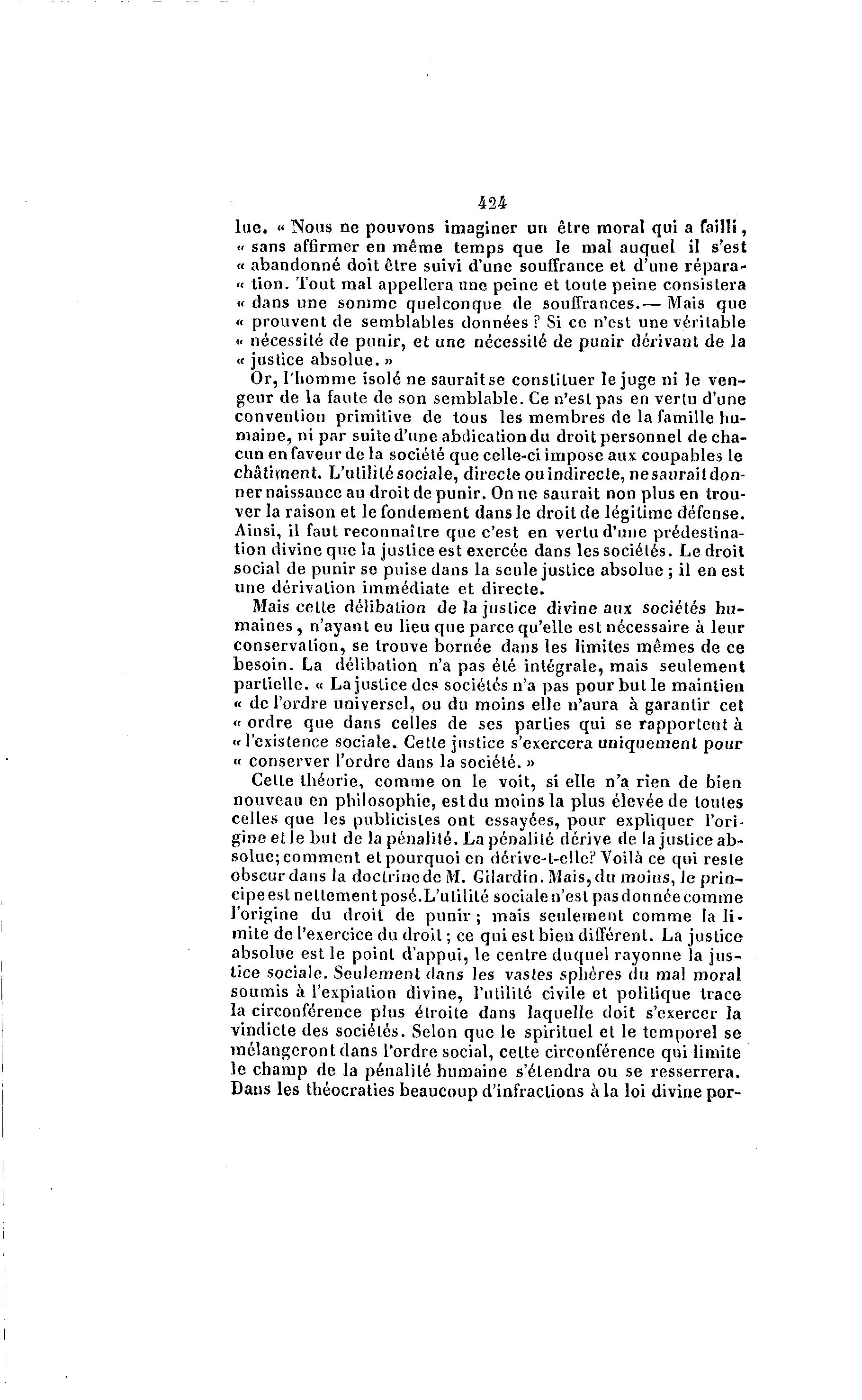 424 lue. « Nous ne pouvons imaginer un être moral qui a failli, « sans affirmer en même temps que le mal auquel il s'est « abandonné doit être suivi d'une souffrance et d'une répara- « tion. Tout mal appellera une peine et toute peine consistera « dans une somme quelconque de souffrances.— Mais que « prouvent de semblables données ? Si ce n'est une véritable . nécessité de punir, et une nécessité de punir dérivant de la < « justice absolue. » Or, l'homme isolé ne saurait se constituer le juge ni le ven- geur de la faute de son semblable. Ce n'esl pas en vertu d'une convention primitive de tous les membres de la famille hu- maine, ni par suite d'une abdication du droit personnel de cha- cun en faveur de la société que celle-ci impose aux coupables le châtiment. L'utilité sociale, directe ouindirecte, nesauraitdon- ner naissance au droit de punir. On ne saurait non plus en trou- ver la raison et le fondement dans le droit de légitime défense. Ainsi, il faut reconnaître que c'est en vertu d'une prédestina- tion divine que la justice est exercée dans les sociétés. Le droit social de punir se puise dans la seule justice absolue ; il en est une dérivation immédiate et directe. Mais cette délibalion de la justice divine aux sociétés h u - maines , n'ayant eu lieu que parce qu'elle est nécessaire à leur conservalion, se trouve bornée dans les limites mêmes de ce besoin. La délibation n'a pas élé intégrale, mais seulement partielle. « La justice des sociétés n'a pas pour but le maintien « de l'ordre universel, ou du moins elle n'aura à garantir cet « ordre que dans celles de ses parties qui se rapportent à » l'exislence sociale. Cette justice s'exercera uniquement pour « conserver l'ordre dans la société. » Celle théorie, comme on le voit, si elle n'a rien de bien nouveau en philosophie, estdu moins la plus élevée de touleS celles que les publicisles ont essayées, pour expliquer l'ori- gine et le but de la pénalité. La pénalilé dérive de la justice ab- solue; comment et pourquoi en dérive-t-elle? Voilà ce qui reste obscur dans la doctrine de M. Gilardin. Mais, du moins, le prin- cipe est neltement posé. L'utilité sociale n'est pas donnée comme l'origine du droit de p u n i r ; mais seulement comme la li- mite de l'exercice du droit ; ce qui est bien différent. La justice absolue est le poinl d'appui, le centre duquel rayonne la jus- tice sociale. Seulement dans les vastes sphères du mal moral soumis à l'expialion divine, l'utiliLé civile et politique trace la circonférence plus étroite dans laquelle doit s'exercer la vindicte des sociétés. Selon que le spirituel et le temporel se mélangeront dans l'ordre social, cette circonférence qui limite le champ de la pénalité humaine s'étendra ou se resserrera. Dans les théocraties beaucoup d'infractions à la loi divine por-