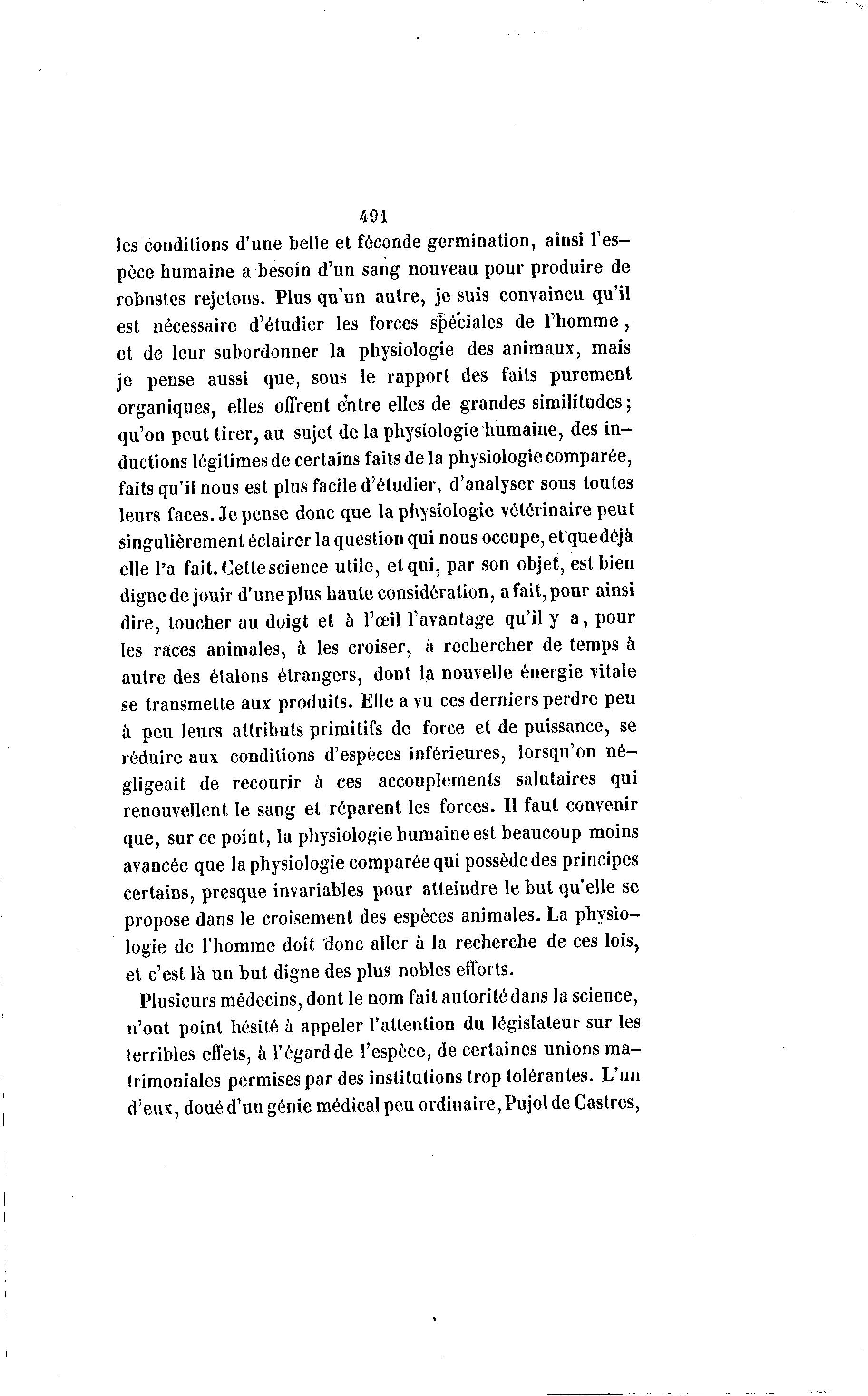 491 les conditions d'une belle et féconde germination, ainsi l'es- pèce humaine a besoin d'un sang nouveau pour produire de robustes rejetons. Plus qu'un autre, je suis convaincu qu'il est nécessaire d'étudier les forces spéciales de l'homme, et de leur subordonner la physiologie des animaux, mais je pense aussi que, sous le rapport des faits purement organiques, elles offrent eiitre elles de grandes similitudes; qu'on peut tirer, au sujet de la physiologie humaine, des in- ductions légitimes de certains faits de la physiologie comparée, faits qu'il nous est plus facile d'étudier, d'analyser sous toutes leurs faces. Je pense donc que la physiologie vétérinaire peut singulièrement éclairer la question qui nous occupe, et que déjà elle l'a fait. Cette science utile, et qui, par son objet, est bien dignede jouir d'uneplus haute considération, afait,pour ainsi dire, toucher au doigt et à l'œil l'avantage qu'il y a, pour les races animales, à les croiser, à rechercher de temps à autre des étalons étrangers, dont la nouvelle énergie vitale se transmette aux produits. Elle a vu ces derniers perdre peu à peu leurs attributs primitifs de force et de puissance, se réduire aux conditions d'espèces inférieures, lorsqu'on né- gligeait de recourir à ces accouplements salutaires qui renouvellent le sang et réparent les forces. Il faut convenir que, sur ce point, la physiologie humaine est beaucoup moins avancée que la physiologie comparée qui possède des principes certains, presque invariables pour atteindre le but qu'elle se propose dans le croisement des espèces animales. La physio- logie de l'homme doit donc aller à la recherche de ces lois, et c'est là un but digne des plus nobles efforts. Plusieurs médecins, dont le nom fait autorité dans la science, n'ont point hésité à appeler l'attention du législateur sur les lerribles effets, à l'égard de l'espèce, de certaines unions ma- trimoniales permises par des institutions trop tolérantes. L'un d'eux, doué d'un génie médical peu ordinaire, Pujol de Castres,