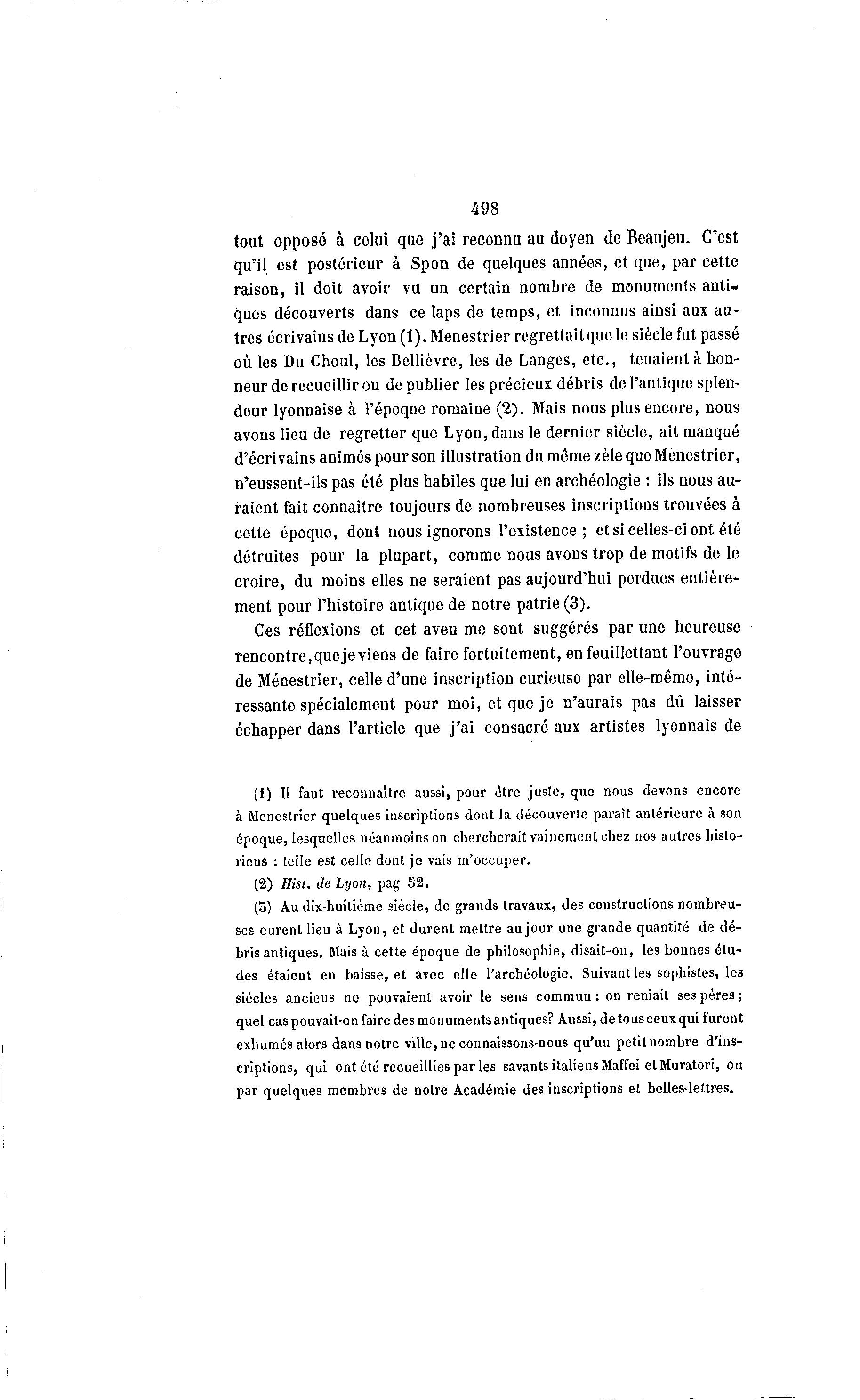 498 tout opposé à celui que j'ai reconnu au doyen de Beaujeu. C'est qu'il est postérieur à Spon de quelques années, et que, par cette raison, il doit avoir vu un certain nombre de monuments anti- ques découverts dans ce laps de temps, et inconnus ainsi aux au- tres écrivains de Lyon (1). Menestrier regrettait que le siècle fut passé où les Du Choul, les Bellièvre, les de Langes, etc., tenaient à hon- neur de recueillir ou de publier les précieux débris de l'antique splen- deur lyonnaise à l'époqne romaine (2). Mais nous plus encore, nous avons lieu de regretter que Lyon, dans le dernier siècle, ait manqué d'écrivains animés pour son illustration du même zèle que Menestrier, n'eussent-ils pas été plus habiles que lui en archéologie : ils nous au- raient fait connaître toujours de nombreuses inscriptions trouvées à cette époque, dont nous ignorons l'existence; et si celles-ci ont été détruites pour la plupart, comme nous avons trop de motifs de le croire, du moins elles ne seraient pas aujourd'hui perdues entière- ment pour l'histoire antique de notre patrie (3). Ces réflexions et cet aveu me sont suggérés par une heureuse rencontre,quejeviens de faire fortuitement, en feuillettant l'ouvrage de Menestrier, celle d'une inscription curieuse par elle-même, inté- ressante spécialement pour moi, et que je n'aurais pas dû laisser échapper dans l'article que j'ai consacré aux artistes lyonnais de (1) Il faut reconnaître aussi, pour être juste, que nous devons encore à Menestrier quelques inscriptions dont la découverte paraît antérieure à son époque, lesquelles néanmoins on chercherait vainement chez nos autres histo- riens : telle est celle dont je vais m'occuper. (2) Hist. de Lyon, pag 52, (3) Au dix-huitième siècle, de grands travaux, des constructions nombreu- ses eurent lieu à Lyon, et durent mettre au jour une grande quantité de dé- bris antiques. Mais à cette époque de philosophie, disait-on, les bonnes étu- des étaient en baisse, et avec elle l'archéologie. Suivant les sophistes, les siècles anciens ne pouvaient avoir le sens commun: on reniait ses pères; quel cas pouvait-on faire des monuments antiques? Aussi, de tous ceux qui furent exhumés alors dans notre ville, ne connaissons-nous qu'un petit nombre d'ins- criptions, qui ont été recueillies par les savants italiens Maffei et Muratori, ou par quelques membres de notre Académie des inscriptions et belles-lettres.